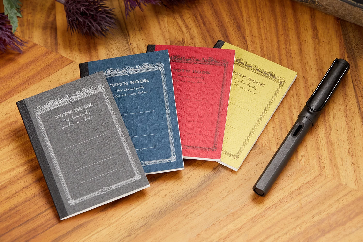 This small notebook features 36 sheets (72 pages) of white super-smooth ruled paper and reinforced stitched binding. Each sheet has 13 lines, spaced 6mm apart, with a blank margin at the top. Comes in one of four assorted bold colors.