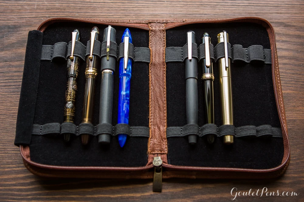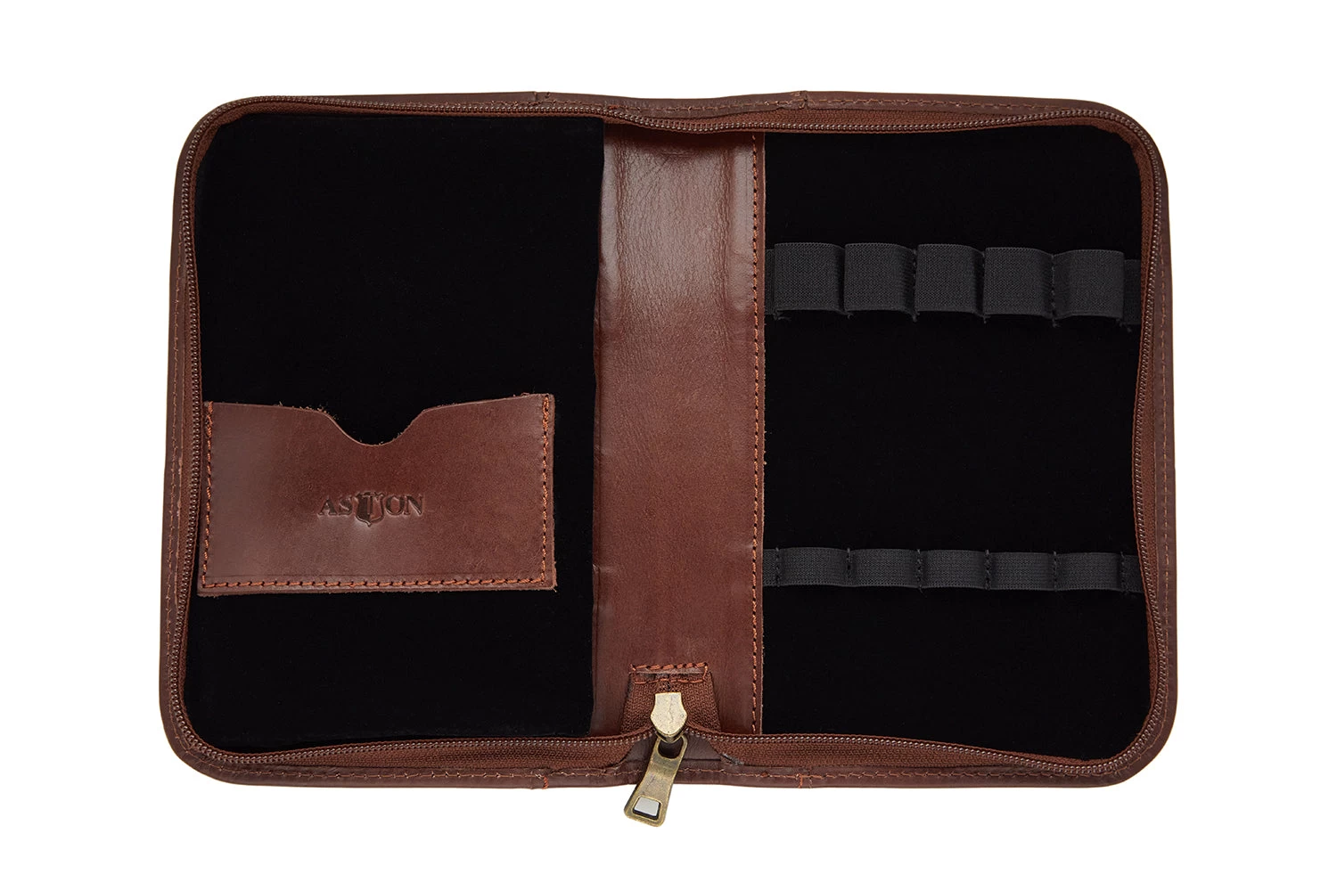 This medium brown Aston Leather zippered pen case has a black velvet lined interior and holds up to ten pens. Aston leathers are scratch resistant, supple and sturdy. They use only American made, water resistant cowhide leathers. These leathers are top grain, veg-tan (tanned with environmentally friendly oak tree oils) and become supple and more beautiful with age.