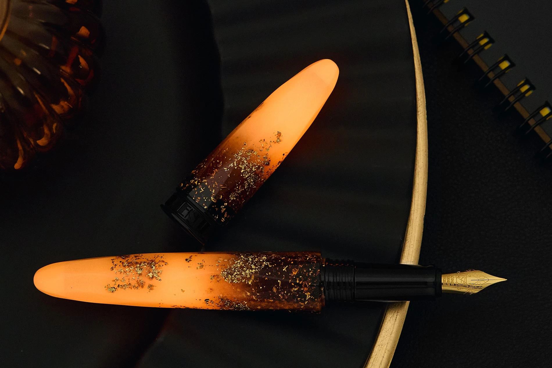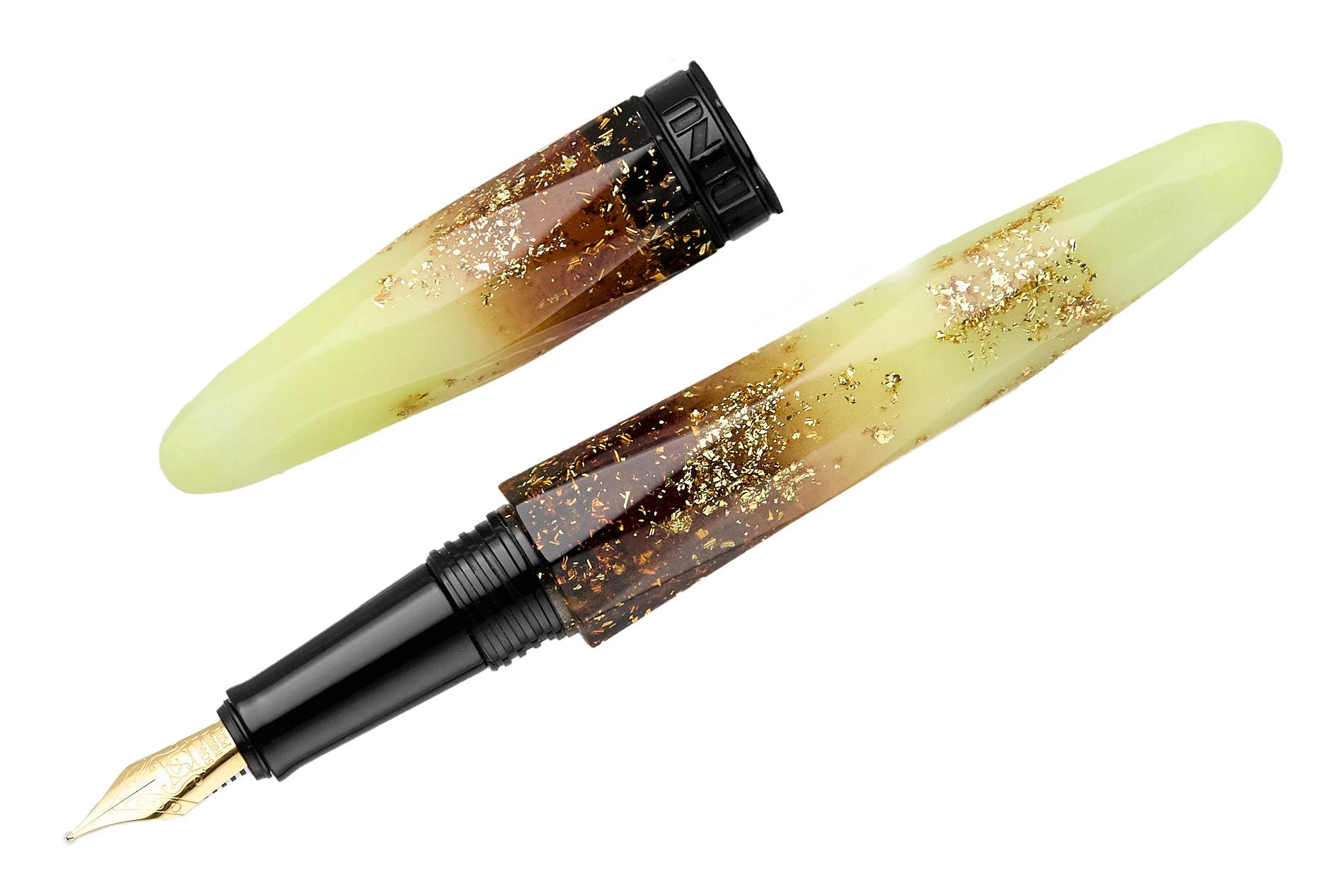 The resin body features an amber and brown base with tons of gold sparkles throughout. It has a gold-plated Schmidt stainless steel nib, a black resin grip, is clipless, and does not post. This fountain pen comes with a standard international converter and one long blue ink cartridge.