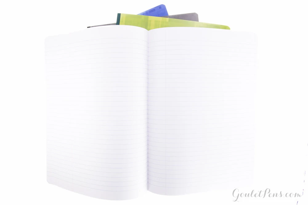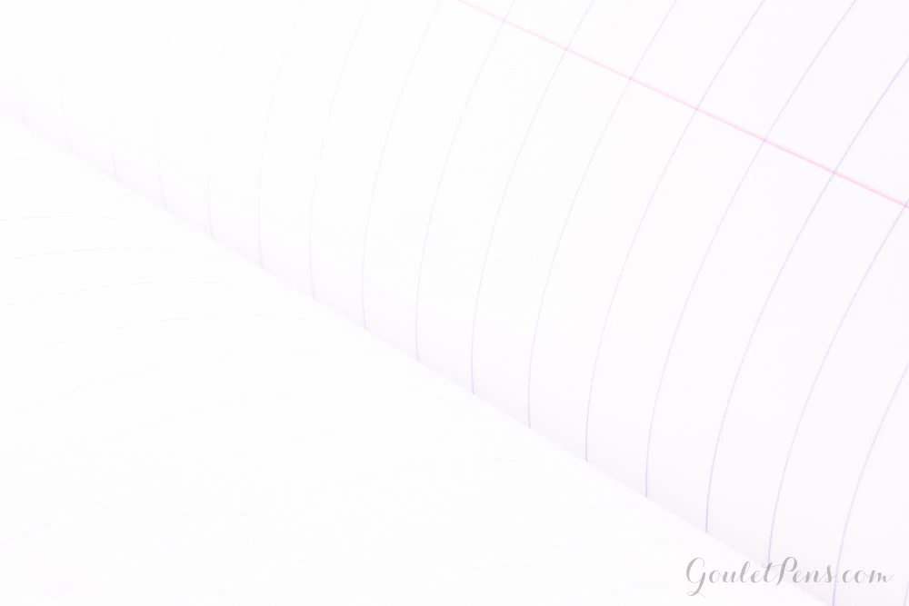 This A4-sized notebook features 96 sheets (192 pages) of white 90g Clairefontaine ruled paper with cloth binding matching the cover color. Lines are spaced 8mm apart, and there is a red vertical margin line on the left. A perfect satin finish for maximum smoothness in writing.