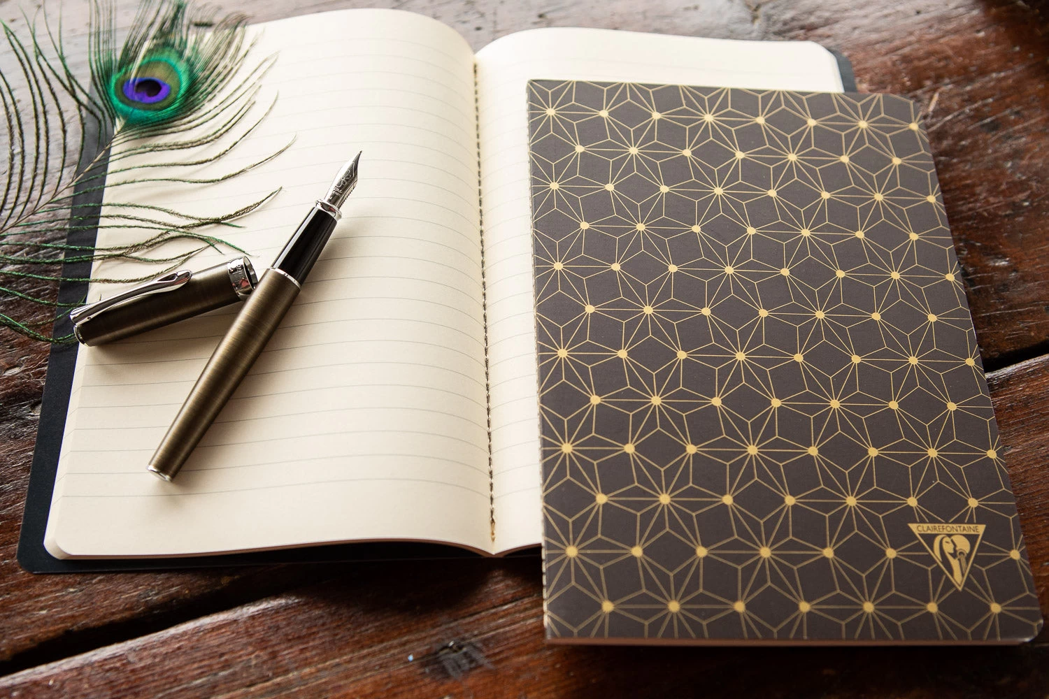 This Neo Deco themed A5-sized notebook features 48 sheets (96 pages) of super smooth ivory 90g Clairefontaine lined paper with a sewn spine binding. The cover is made of cardboard with a matte coating, finished with shiny gold printed accents.