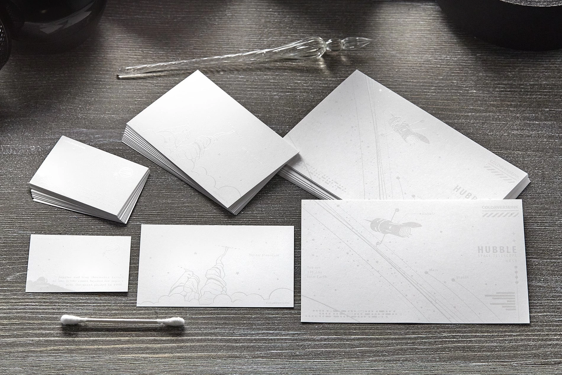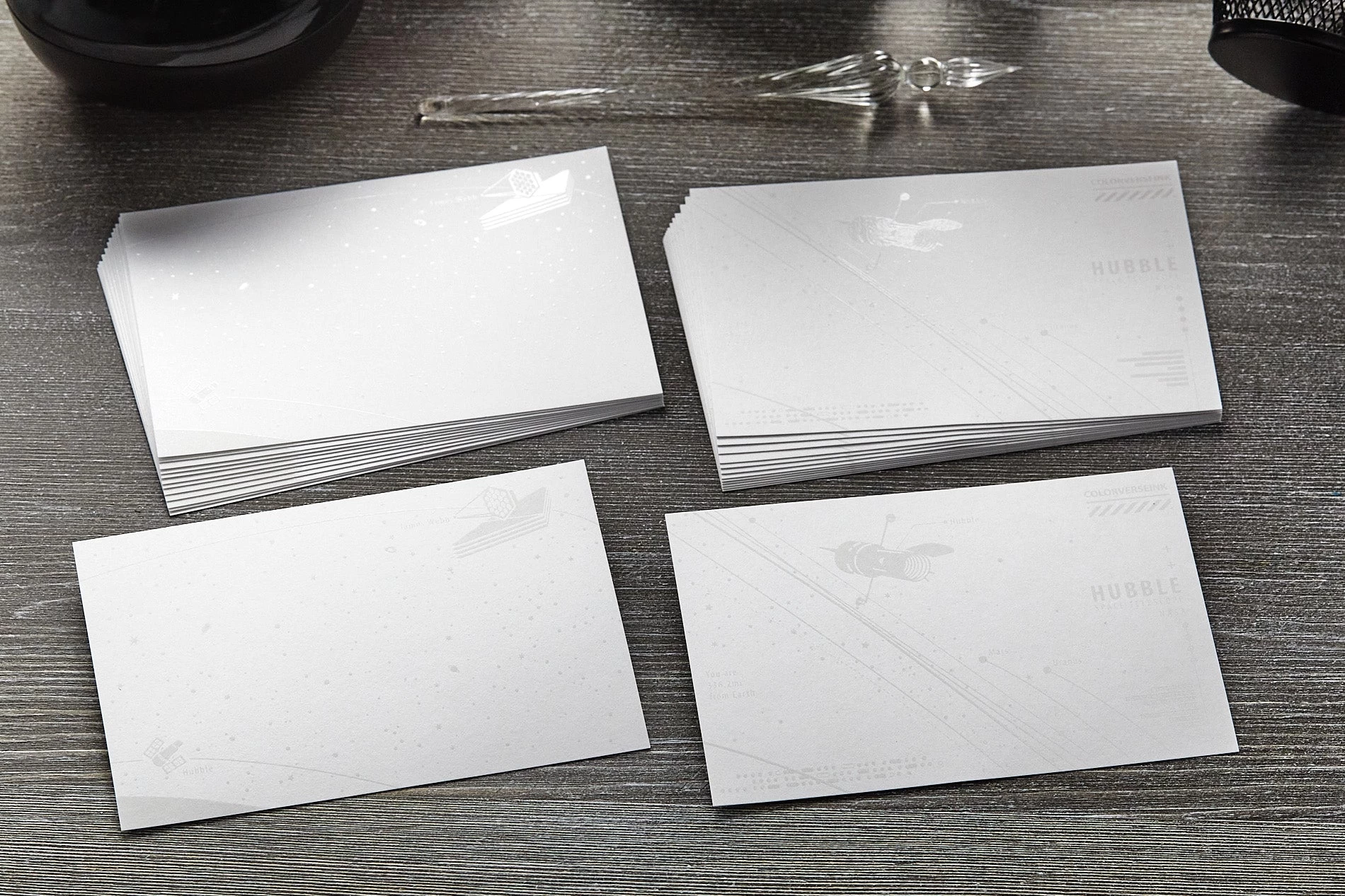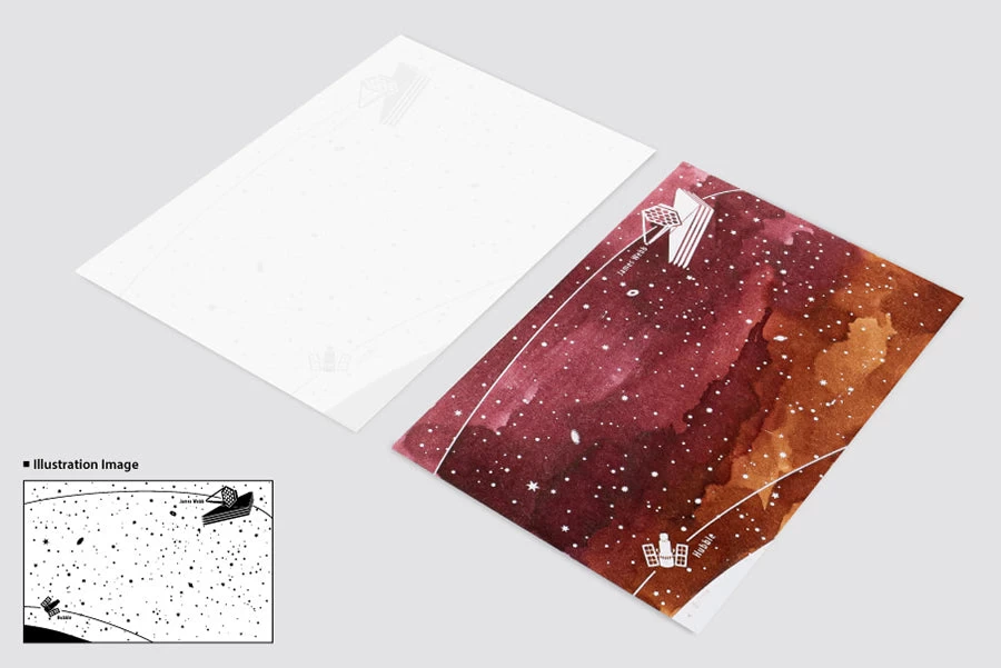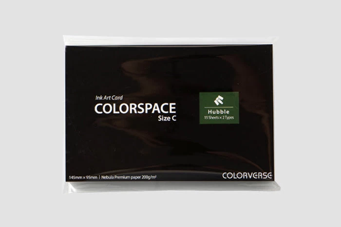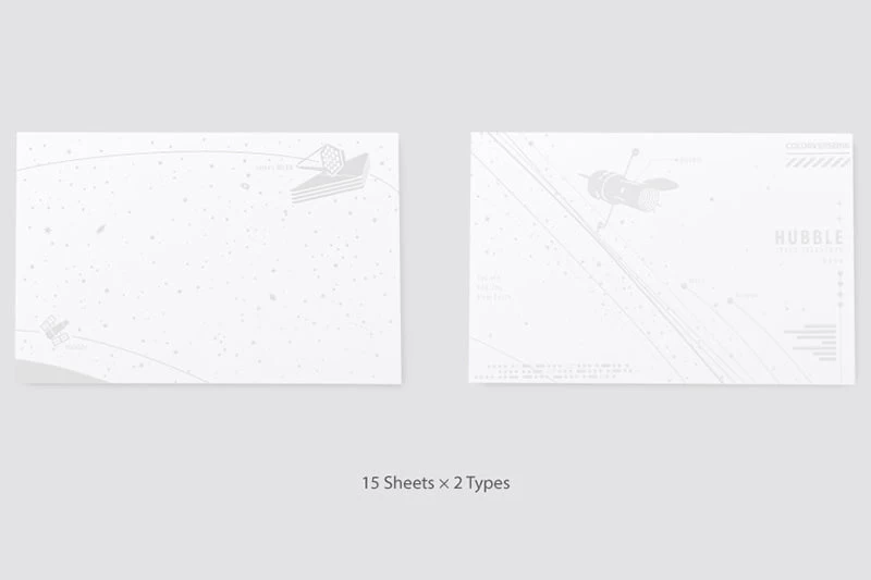 Printed on Nebula Premium paper, this set contains 15 cards each of 2 different space-themed designs for a total of 30 cards. The paper, weighing in at 200g, is able to hold fountain pen ink without bleedthrough. The white illustrations are printed using a water-resistant finish, so they’ll be visible once the ink has been applied on top.