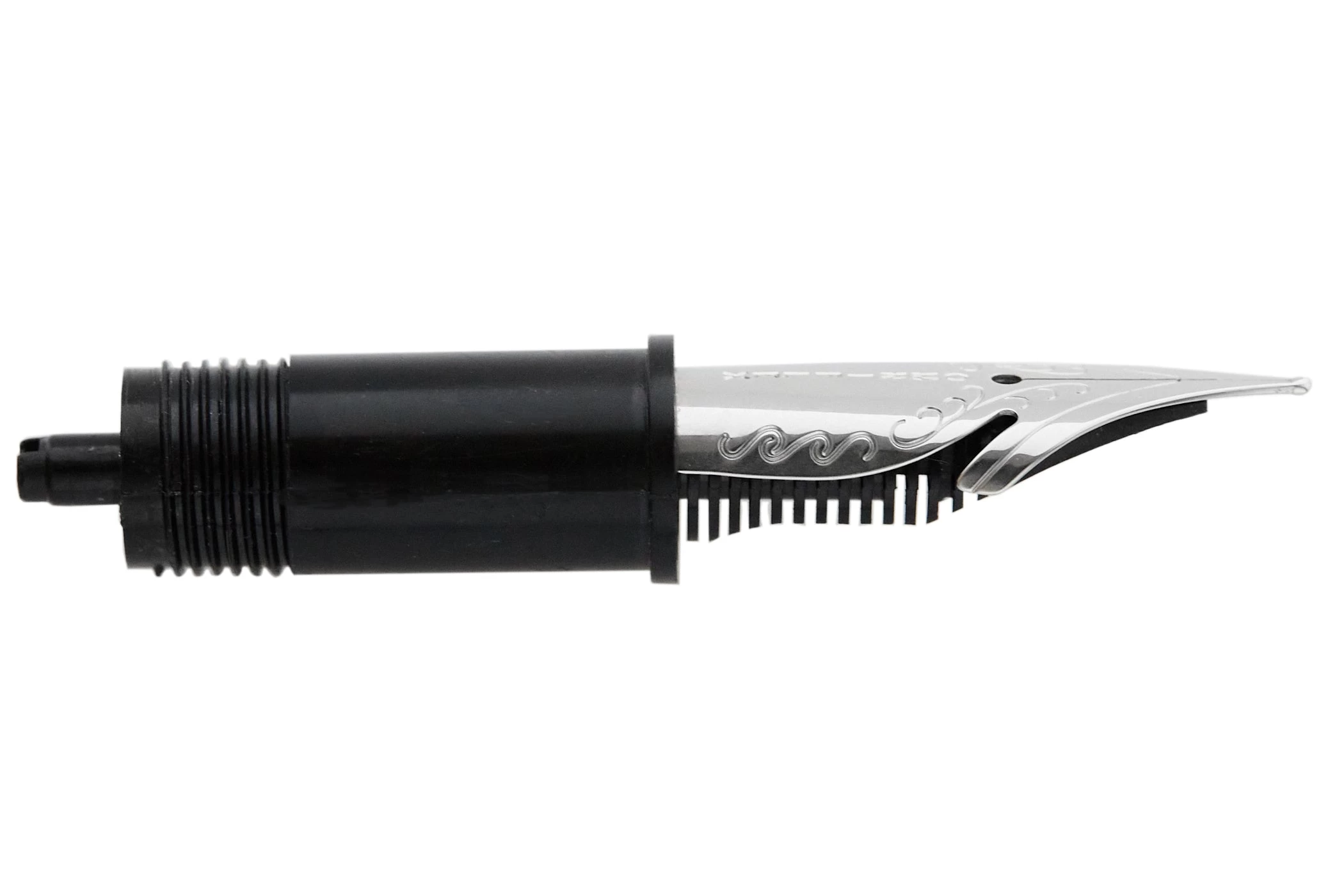 This nib comes installed on a Conklin/Monteverde housing and feed. This nib is a standard #6 size JoWo nib, so it’ll be compatible with many other pens that are built to house #6 nibs. However, the threading on the housing may not be compatible with pens made by companies other than Monteverde and Conklin. In those instances, in order to replace another pen’s nib you’ll need to pull the Omniflex nib out of the housing before an attempt can be made to install it.