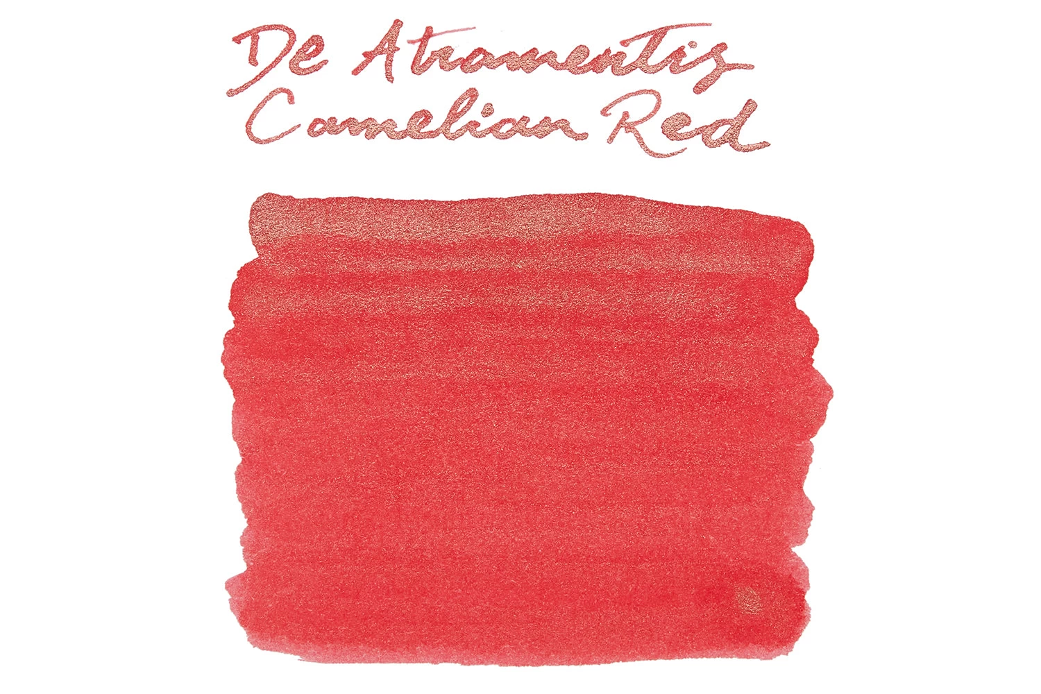 2ml sample of De Atramentis Pearlescent Camelien Red fountain pen ink with copper pearlescent shimmer, in a labeled plastic vial.