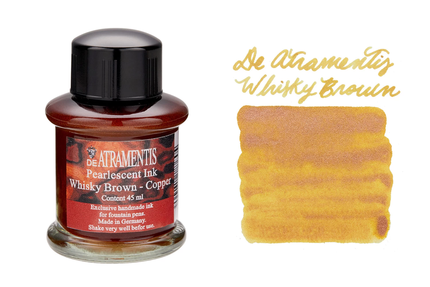 This brown fountain pen ink features added copper pearlescent shimmer. Shimmering inks work best with broader nibs on high quality paper to really see the shine. De Atramentis fountain pen inks are exclusively handmade in Germany by Dr. Franz-Josef Jansen, and come in a 45ml glass bottle.