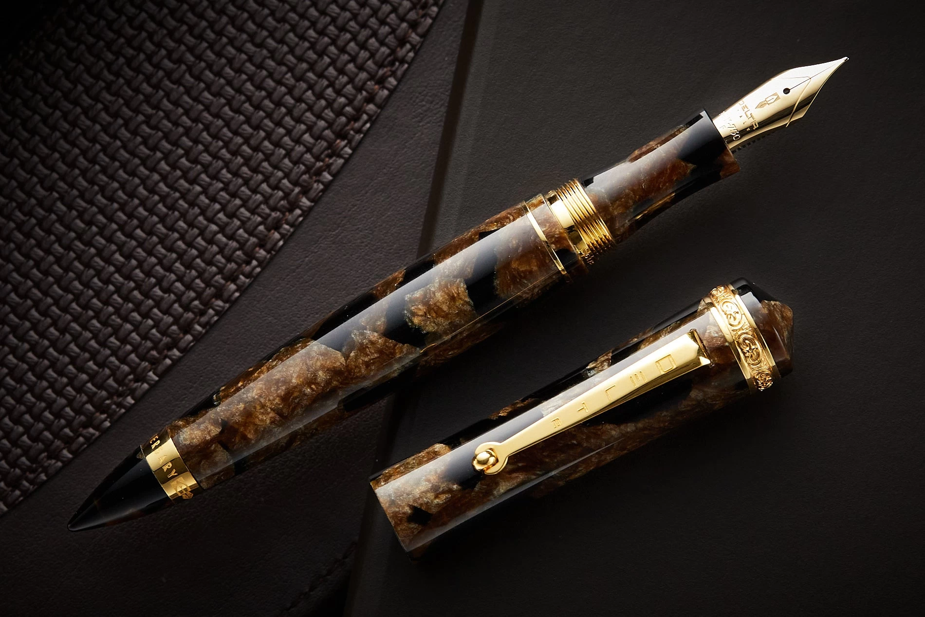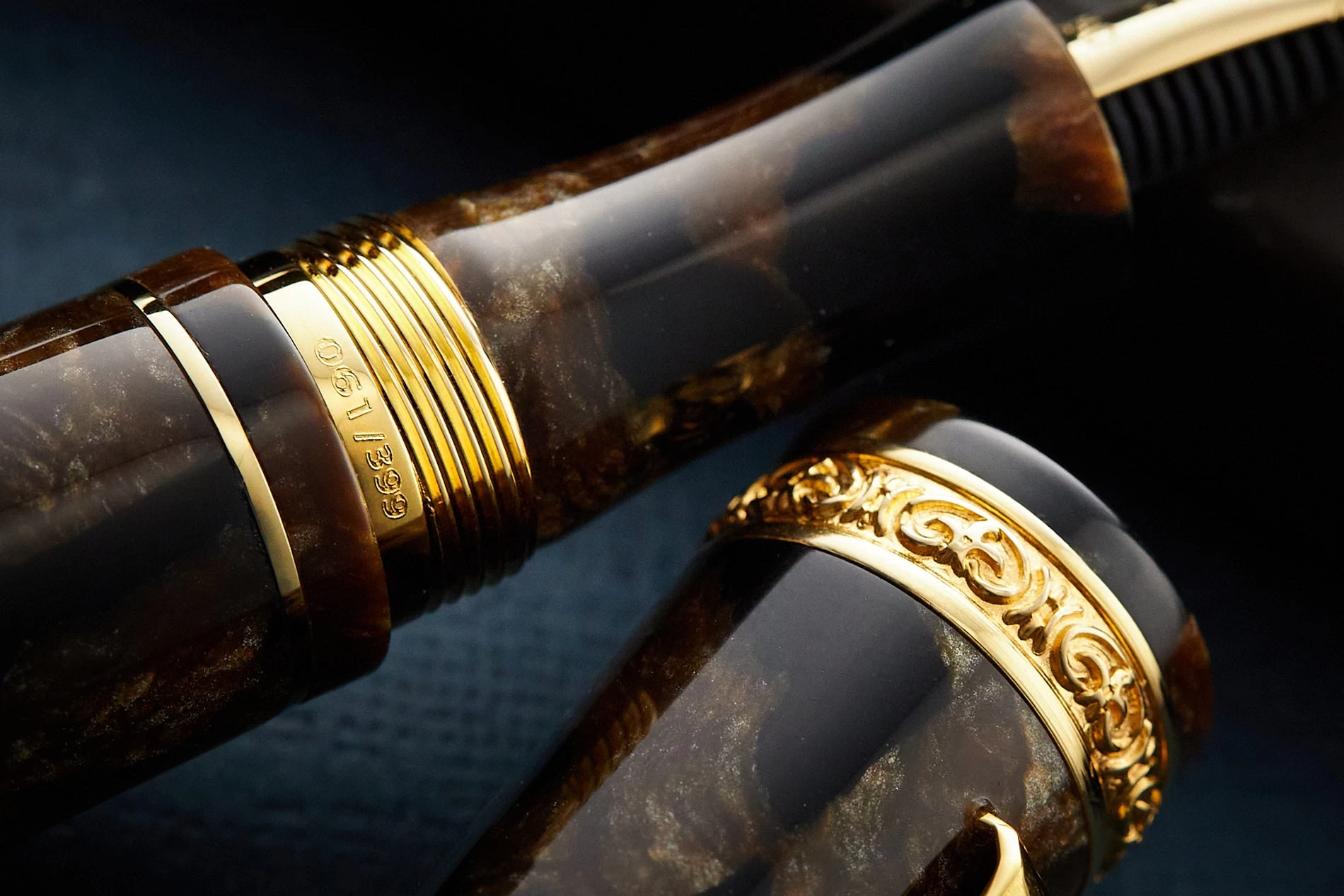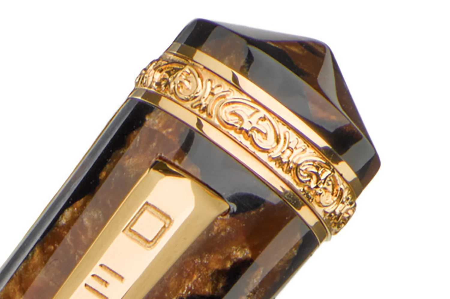The new “39+1” collection is a limited edition of only 399 individually numbered pieces. This fountain pen is made of a rare celluloid, impossible to reproduce today. This mottled black and brown celluloid was previously used to make the Delta Enrico Caruso limited edition. The barrel and cap are highly polished, and the pen is complemented by gold vermeil trim (gold over sterling silver).