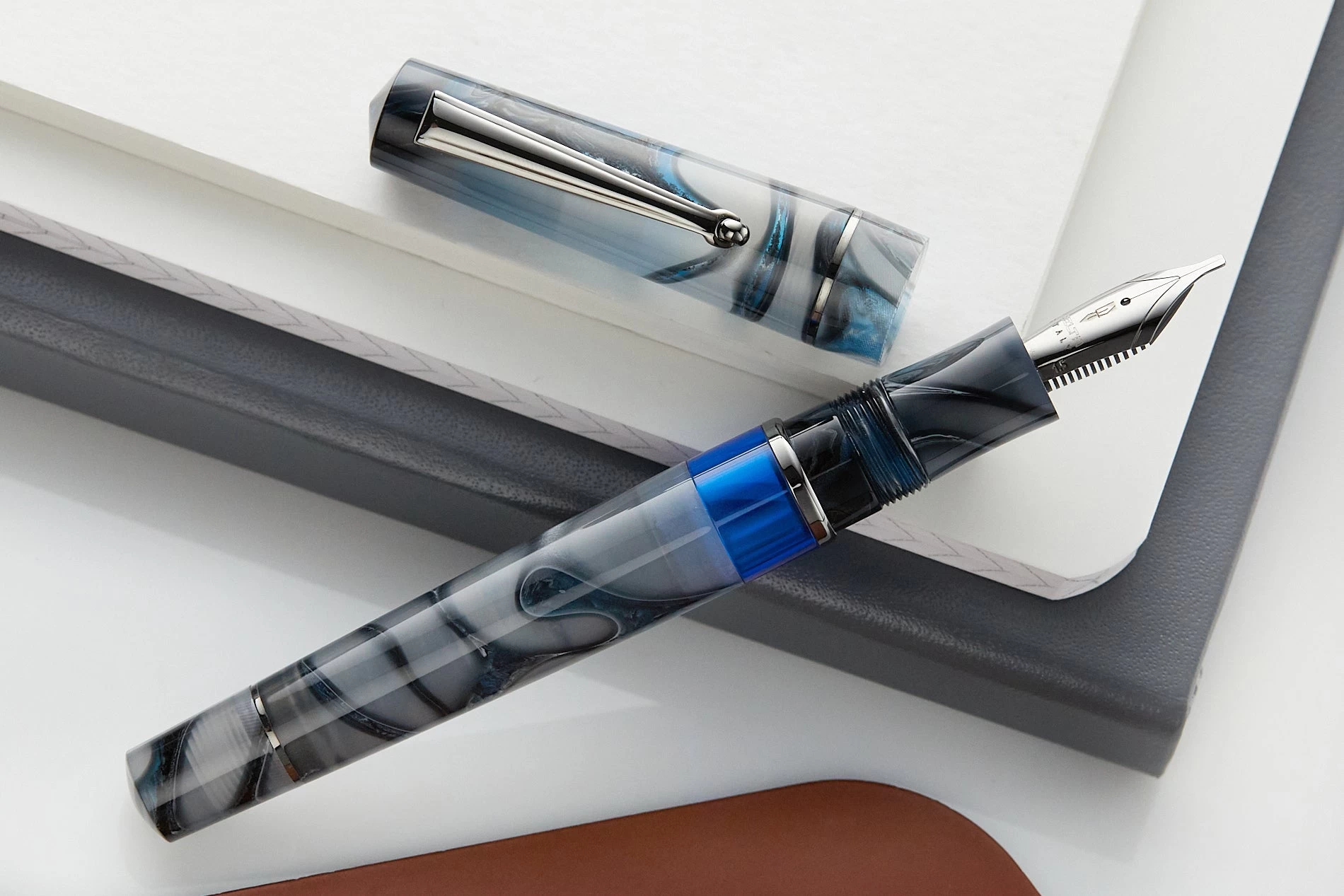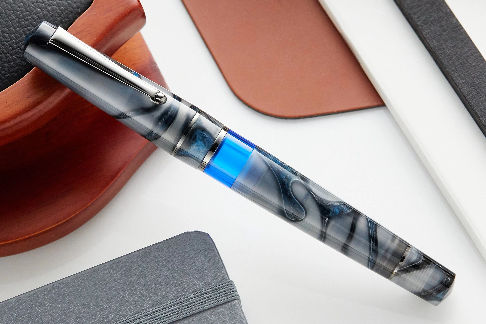 This swirly semi-translucent grey and blue pen is accented by gunmetal trim and matching nib. The stainless steel #6 fountain pen nib is made by the German brand JoWo. In addition to several standard nib sizes, there is also a flex nib variant that allows you to alter the line thickness by varying the pressure applied to the nib.