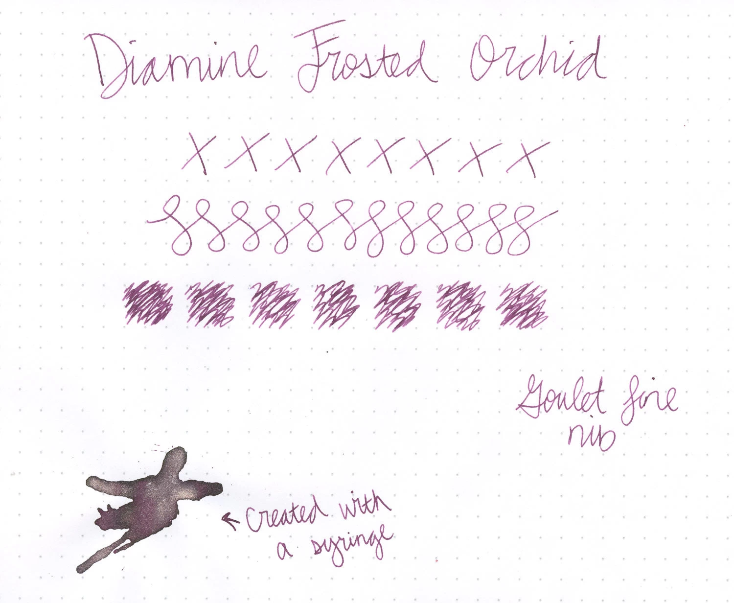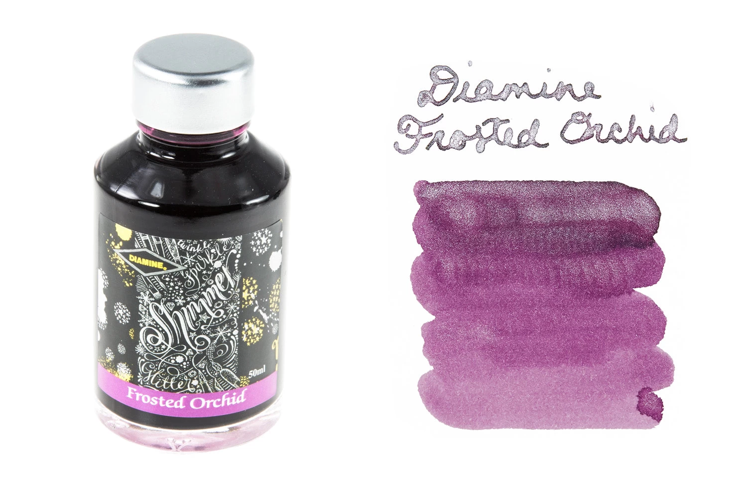 Part of Diamine’s Shimmertastic collection, this Frosted Orchid purple fountain pen ink features added silver shimmer. Works best with broader nibs on high quality paper to really see the shine. Comes in a 50ml glass bottle.