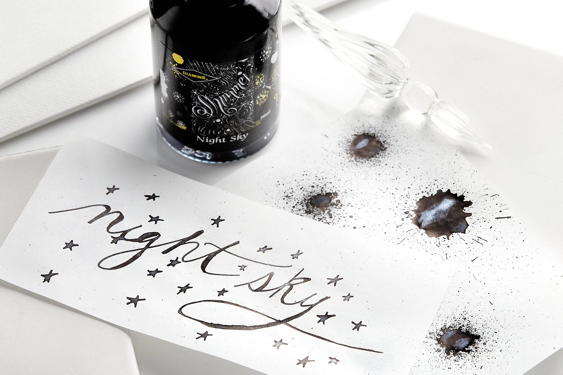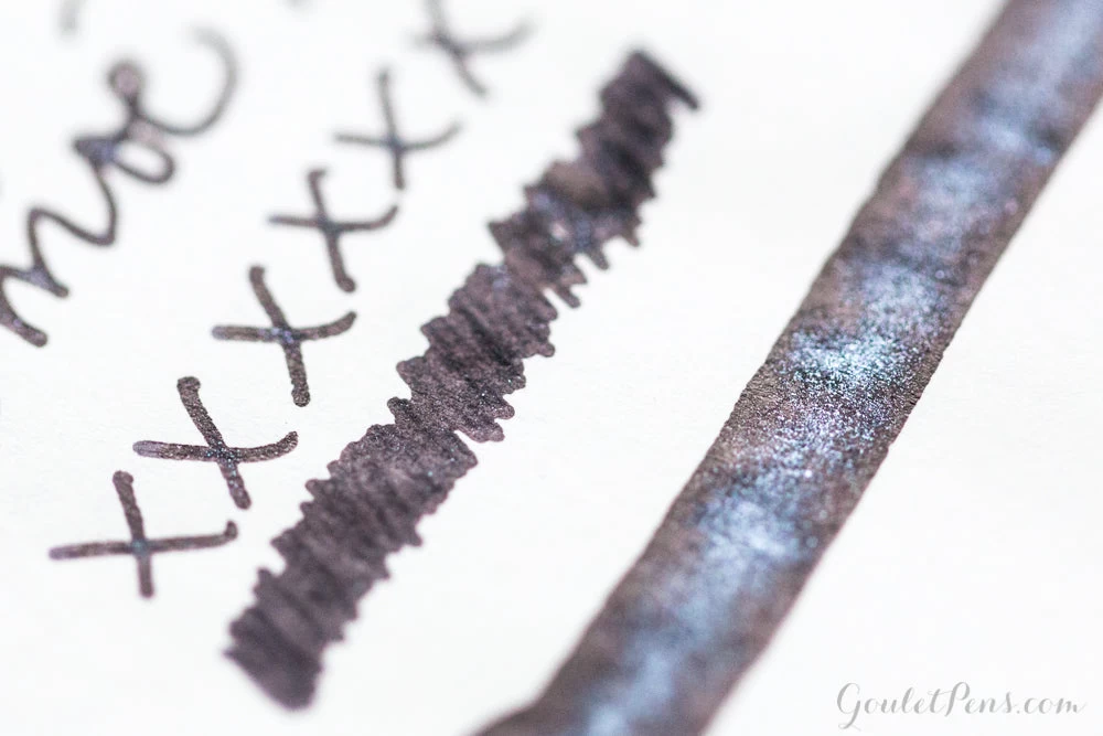 Due to the amount of particulate in this ink used to achieve the sparking look, you may experience restricted ink flow in some of your pens. We recommend shaking the ink thoroughly before filling and gently rolling the pen in your hands often to keep the shimmer effect consistent. This will also help prevent clogging. You will also want to be diligent about cleaning and maintaining your pen when using this ink.