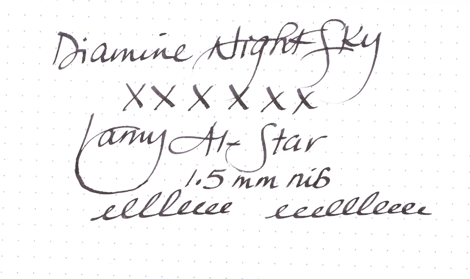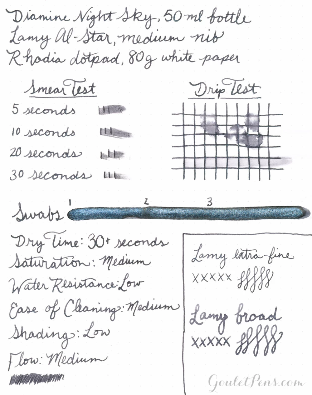 2ml sample of Diamine Night Sky shimmering fountain pen ink, in a labeled plastic vial. Black with silver shimmer.