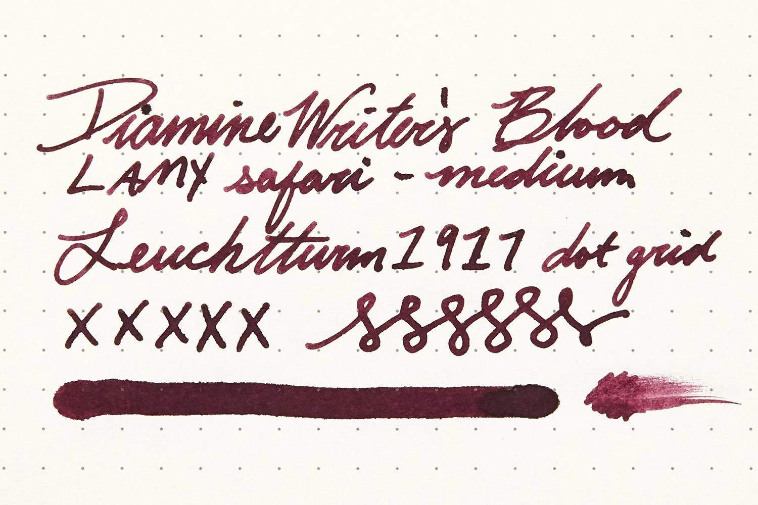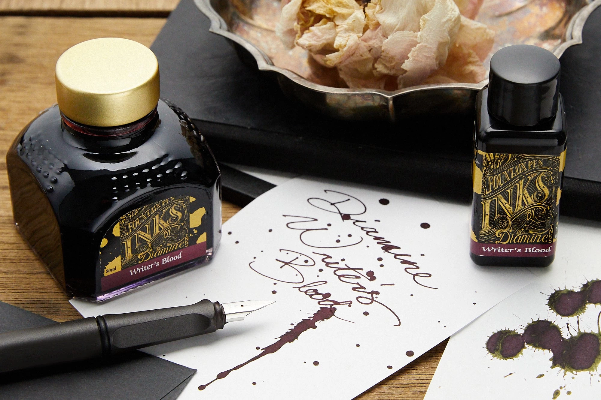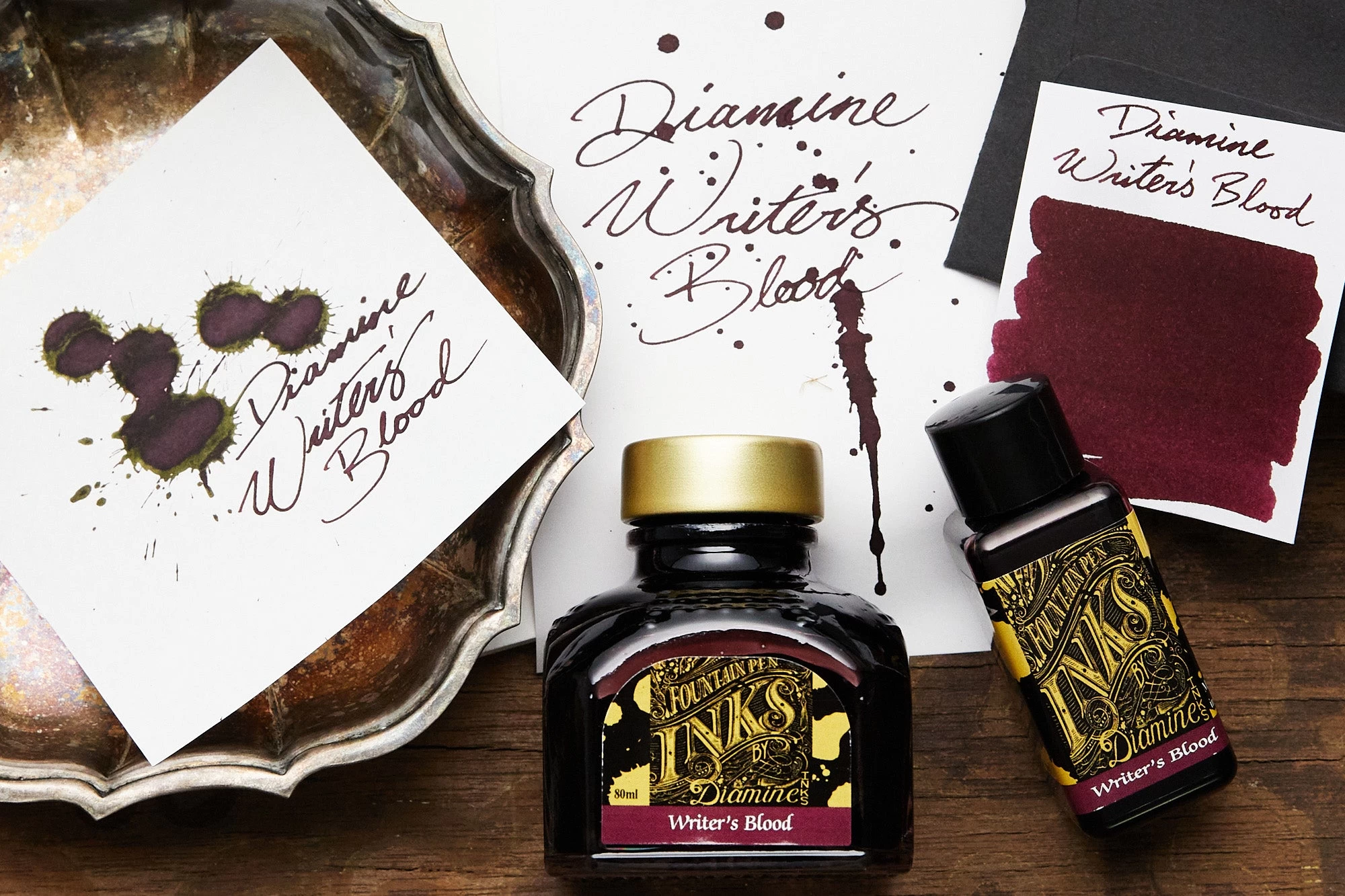 80ml glass bottle of Diamine Writer’s Blood fountain pen ink. This color was chosen by members of the /r/fountainpens reddit subcommunity.