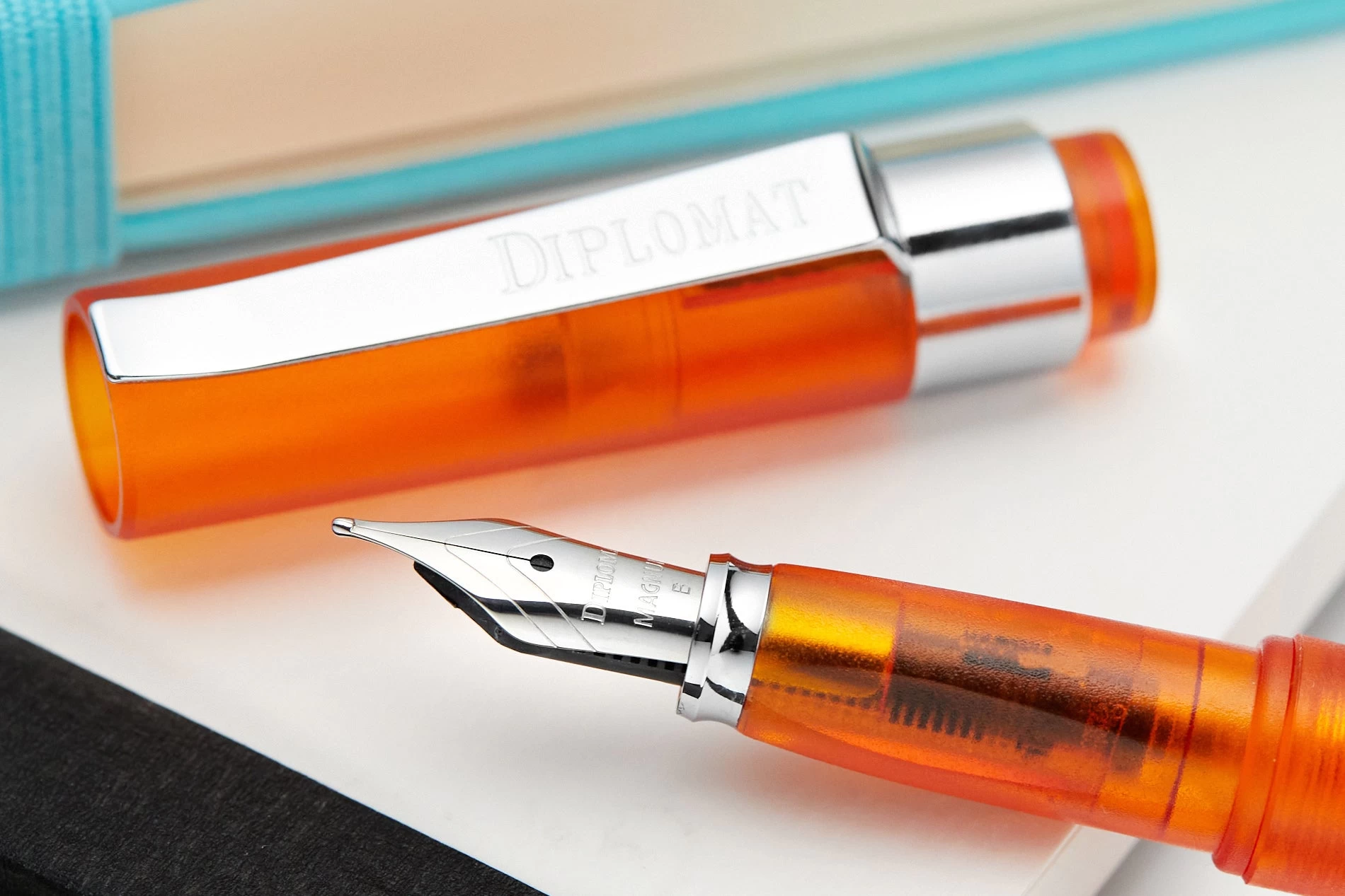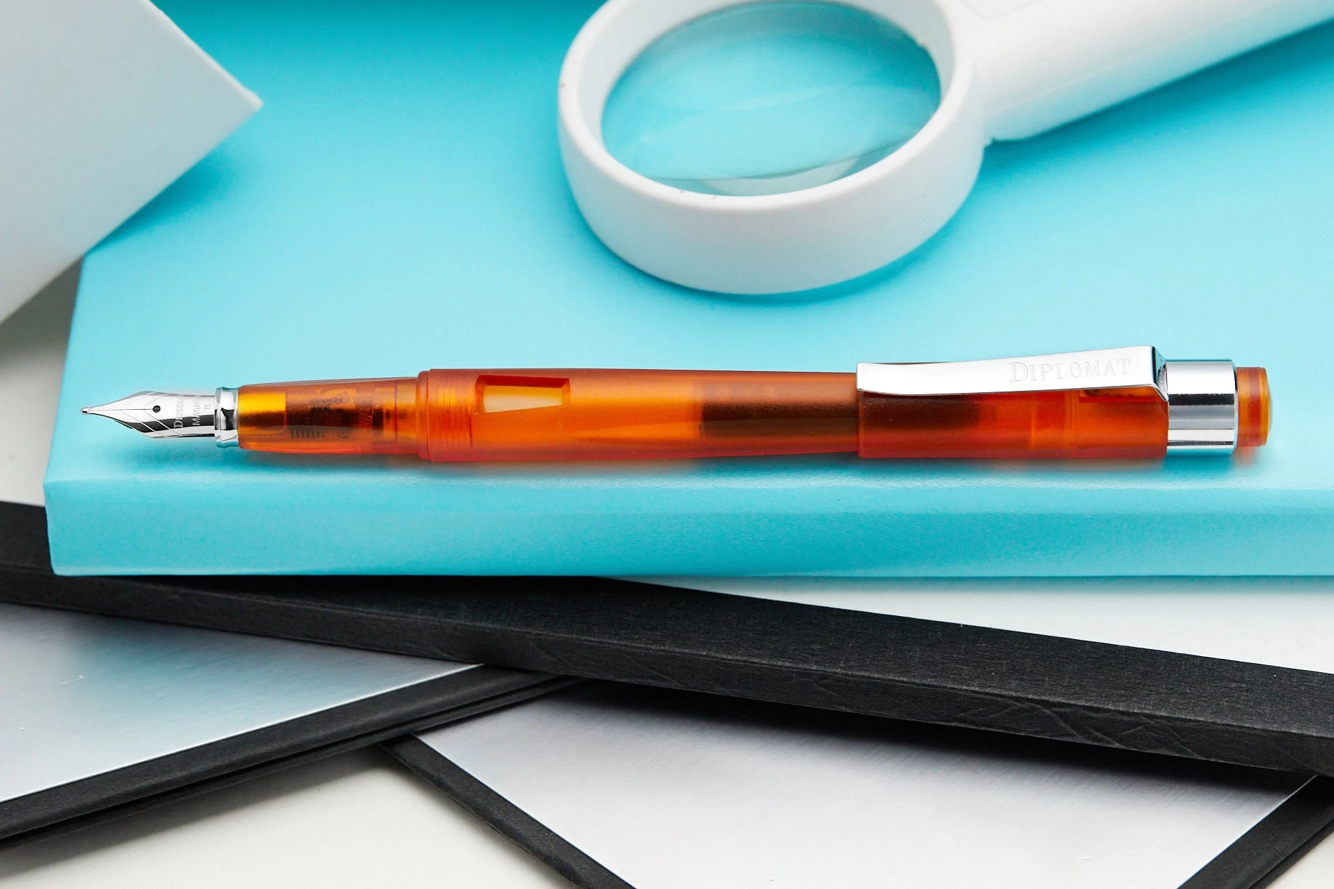 This translucent orange resin Magnum fountain pen is one of Diplomat’s most affordable offerings. The special no-slip lacquer gives the body a soft touch, and it has an ergonomic grip section. It comes equipped with a smooth writing JoWo stainless steel nib, shiny chrome trim, and fills via standard international cartridge/converter (both are included).