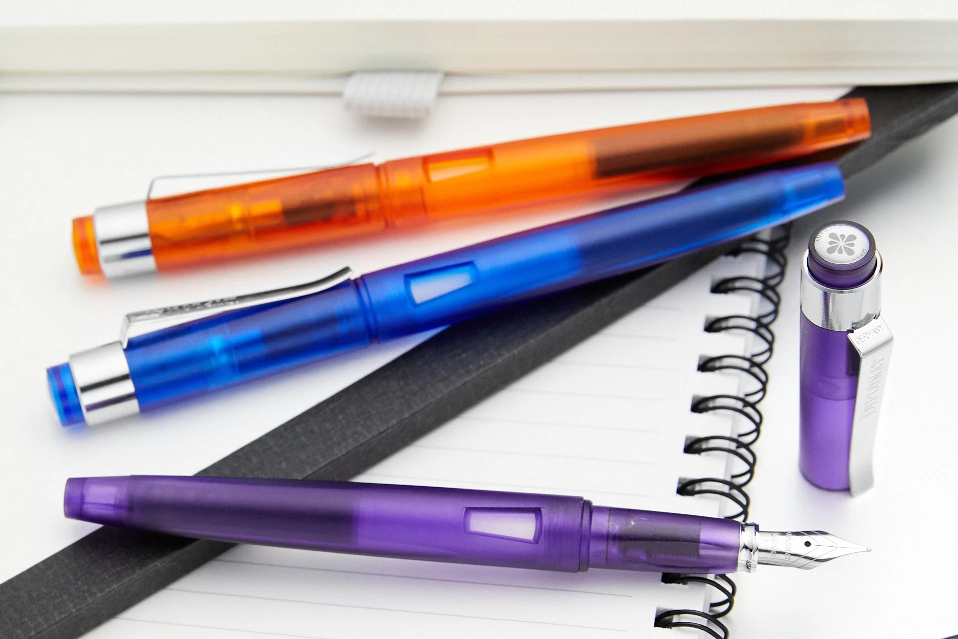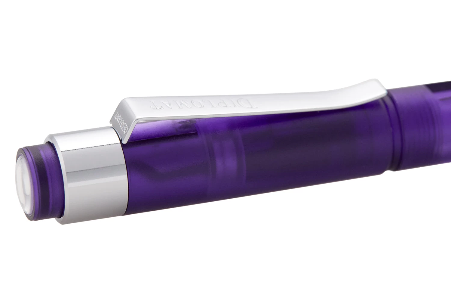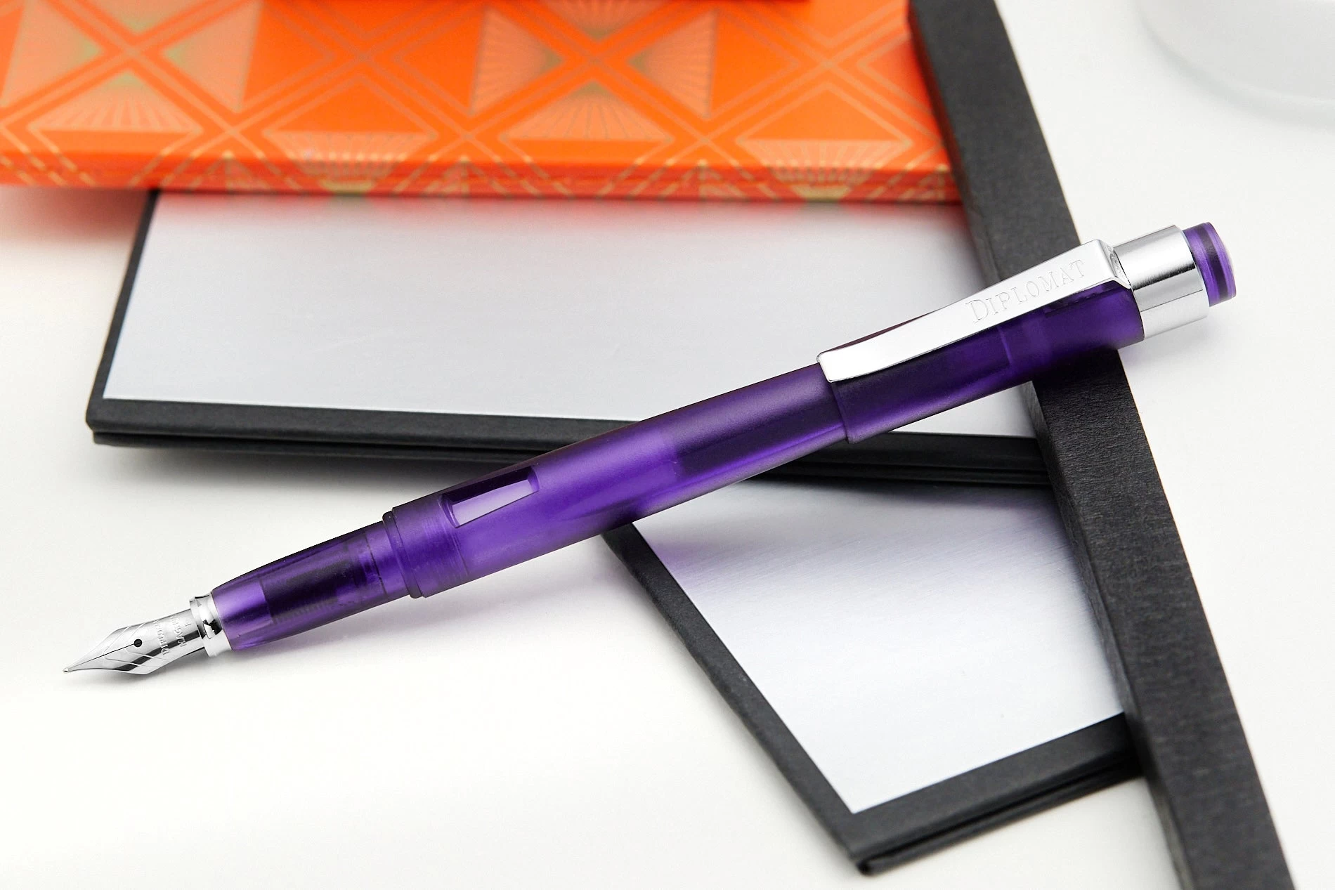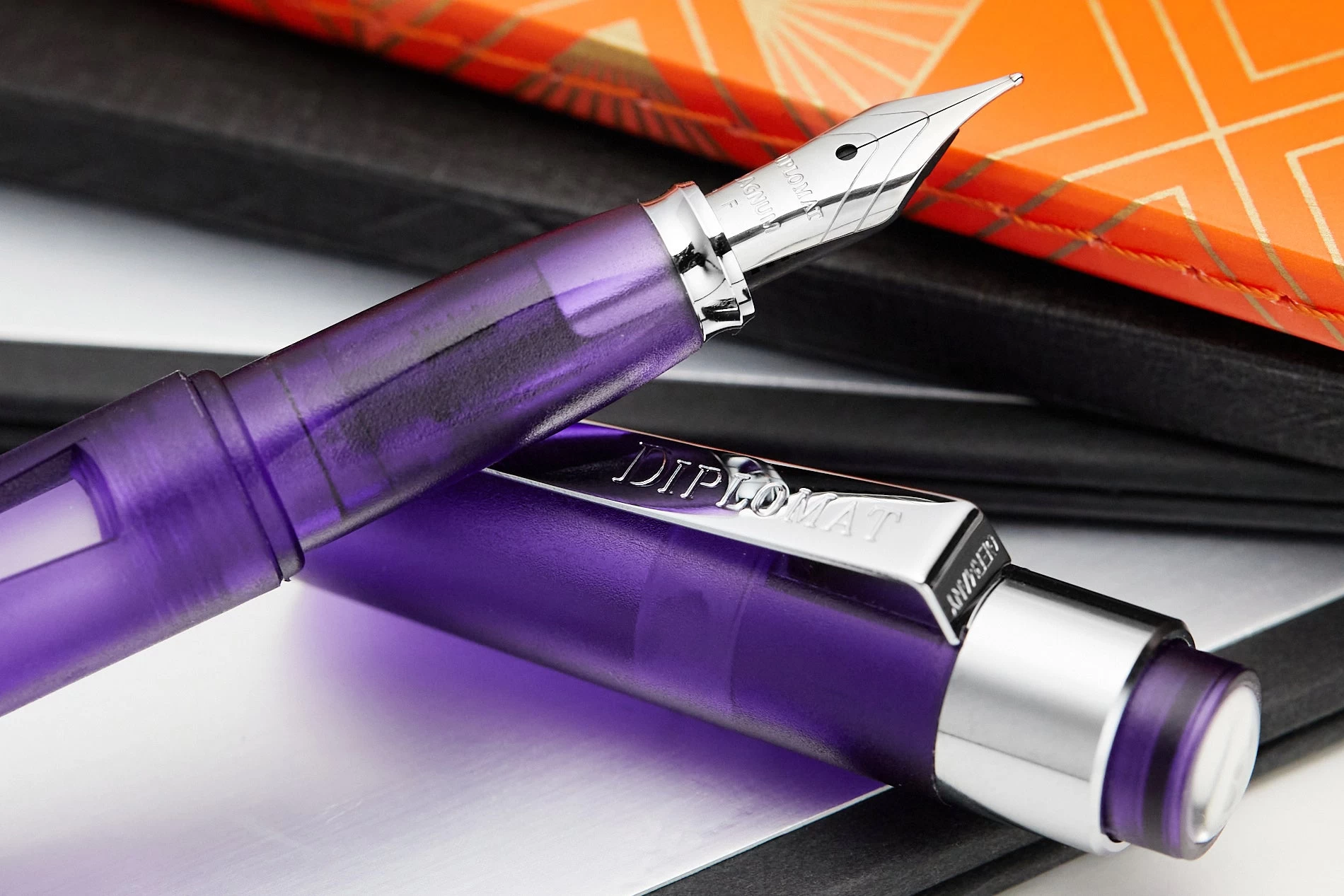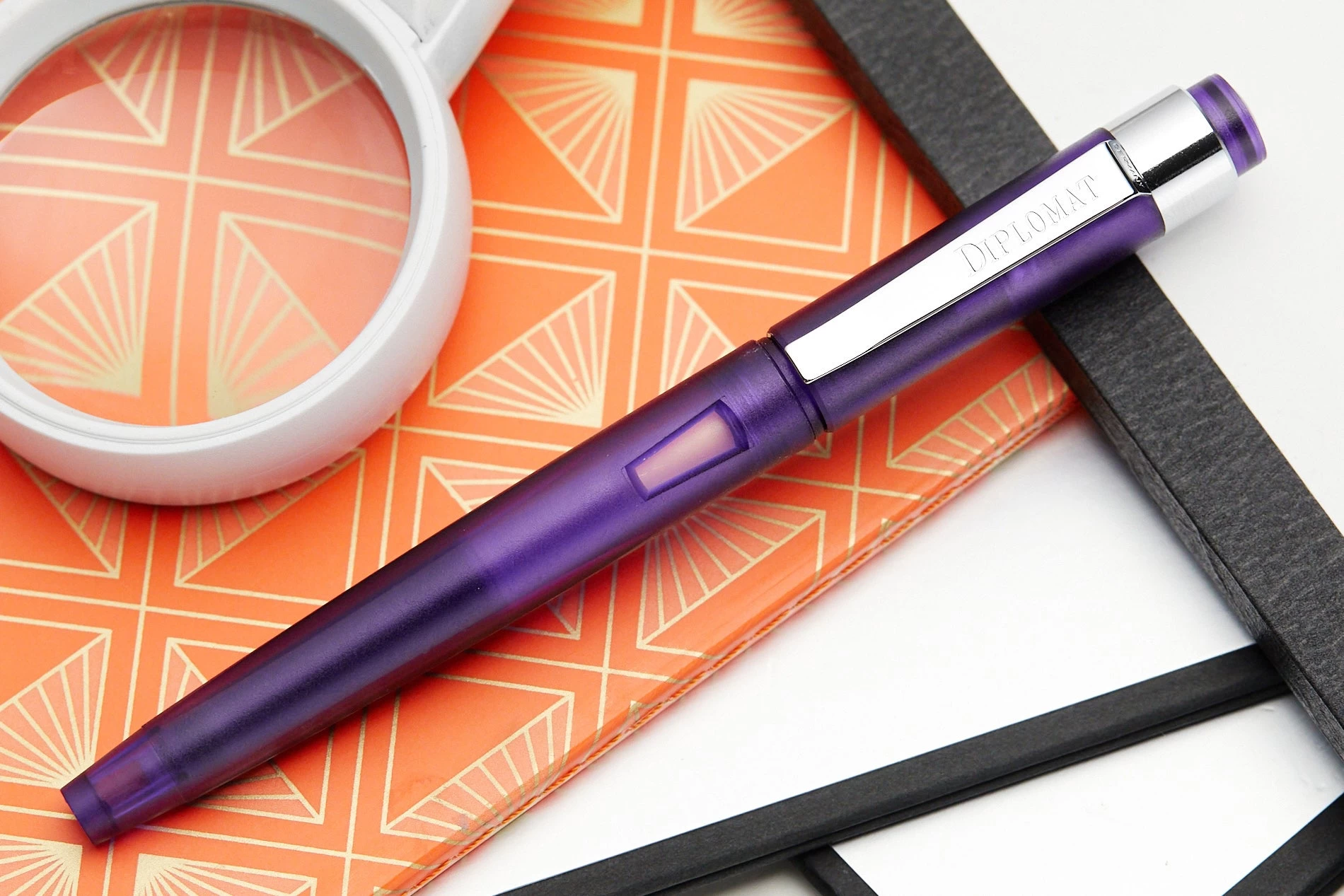 This translucent purple resin Magnum fountain pen is one of Diplomat’s most affordable offerings. The special no-slip lacquer gives the body a soft touch, and it has an ergonomic grip section. It comes equipped with a smooth writing JoWo stainless steel nib, shiny chrome trim, and fills via standard international cartridge/converter (both are included).