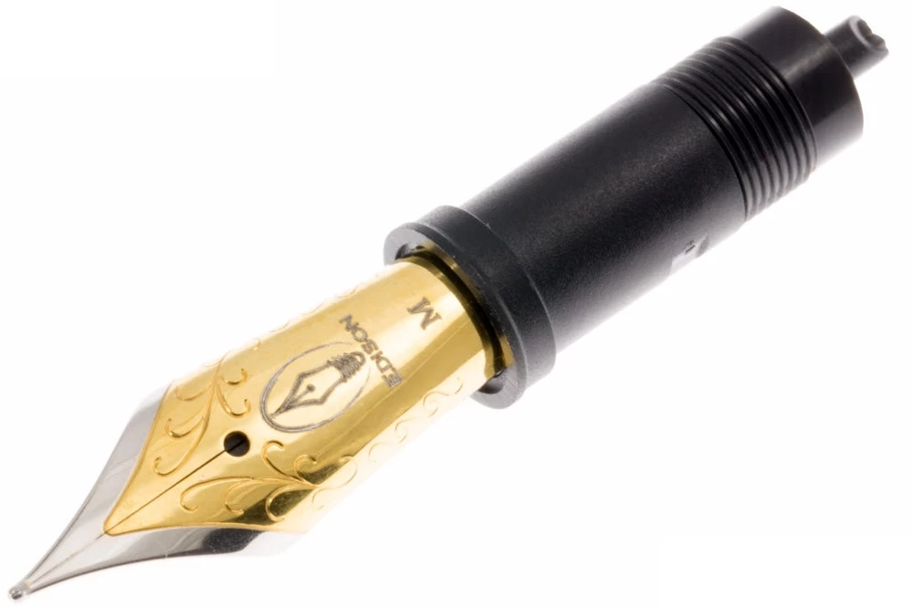 This #6 two-tone steel nib fits all larger models of Edison pens (including the Premiere, Beaumont, Collier, Menlo, and many others), as well as many other fountain pens that accept a #6 JoWo nib unit. The feed and housing are also included as part of this nib unit.