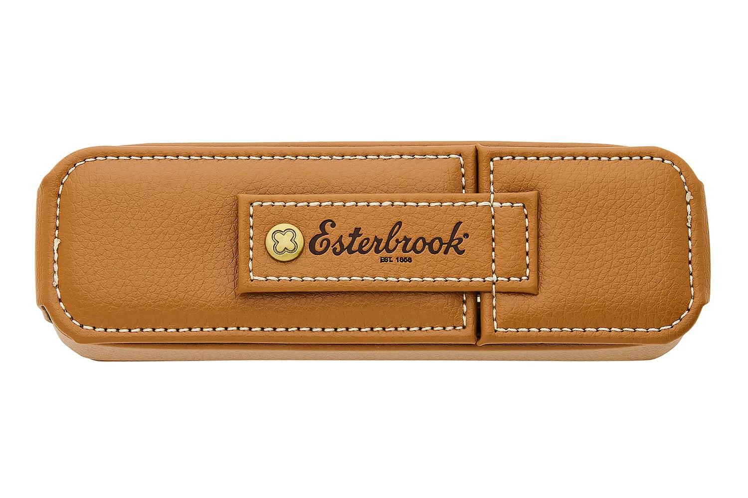 This tan synthetic leather case holds up to 2 pens, each held snug in its own fabric-covered slot. The cover snaps in place to keep the pens secure, and the bottom flap folds down for ease of use.