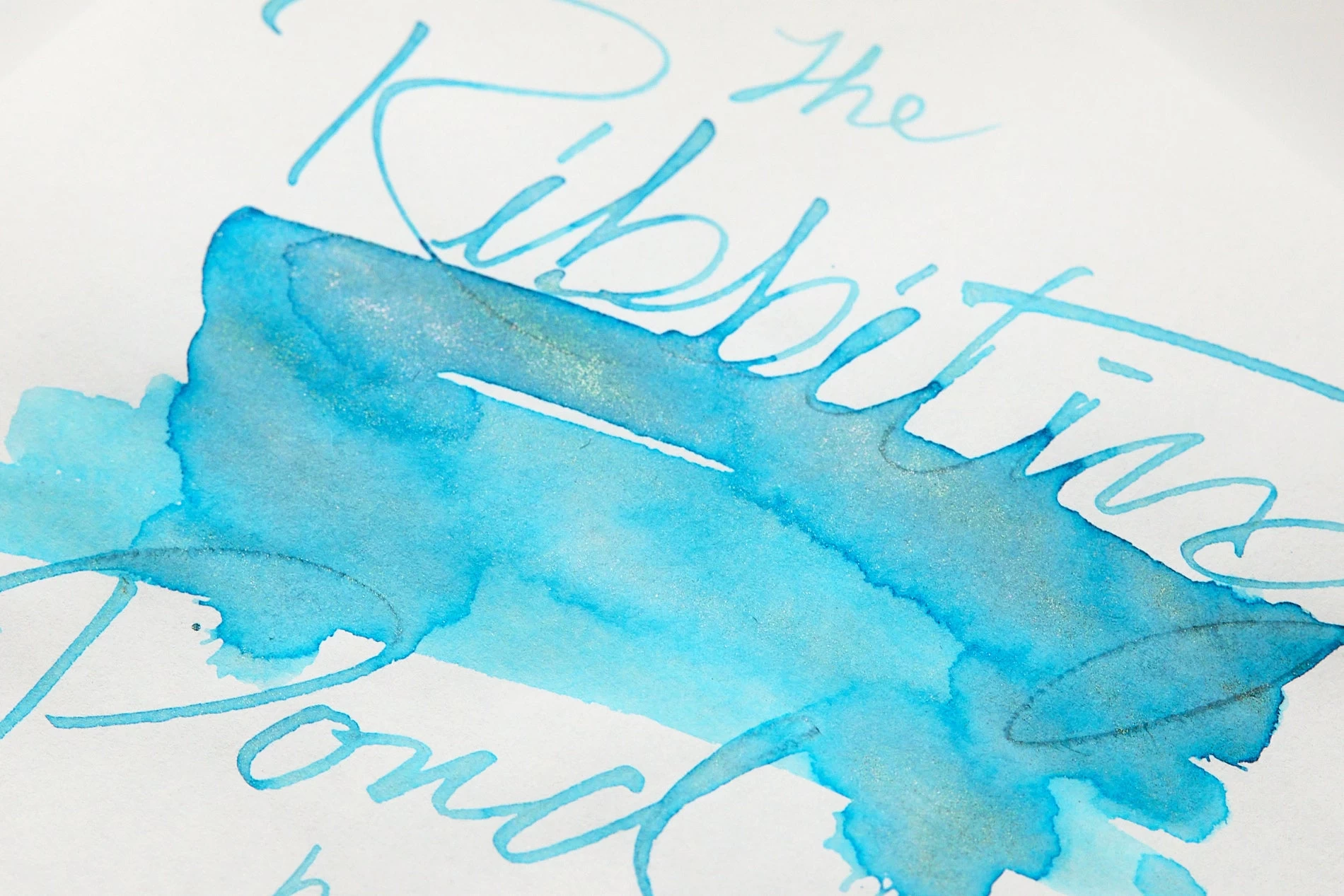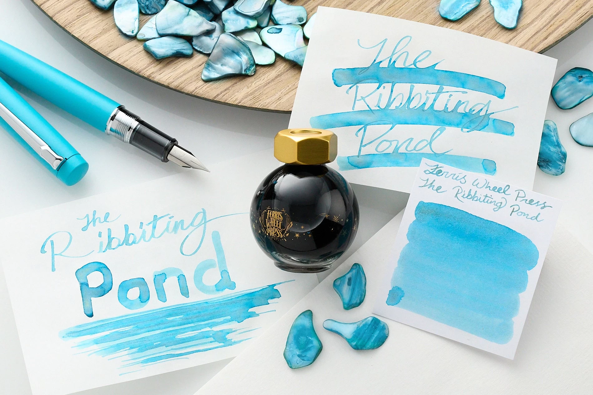 2ml sample of Ferris Wheel Press The Ribbiting Pond fountain pen ink, a light blue color with soft duo chrome shading and gold shimmer. Embark on a tranquil voyage into the realm of transformative love with these entrancing ink tones.