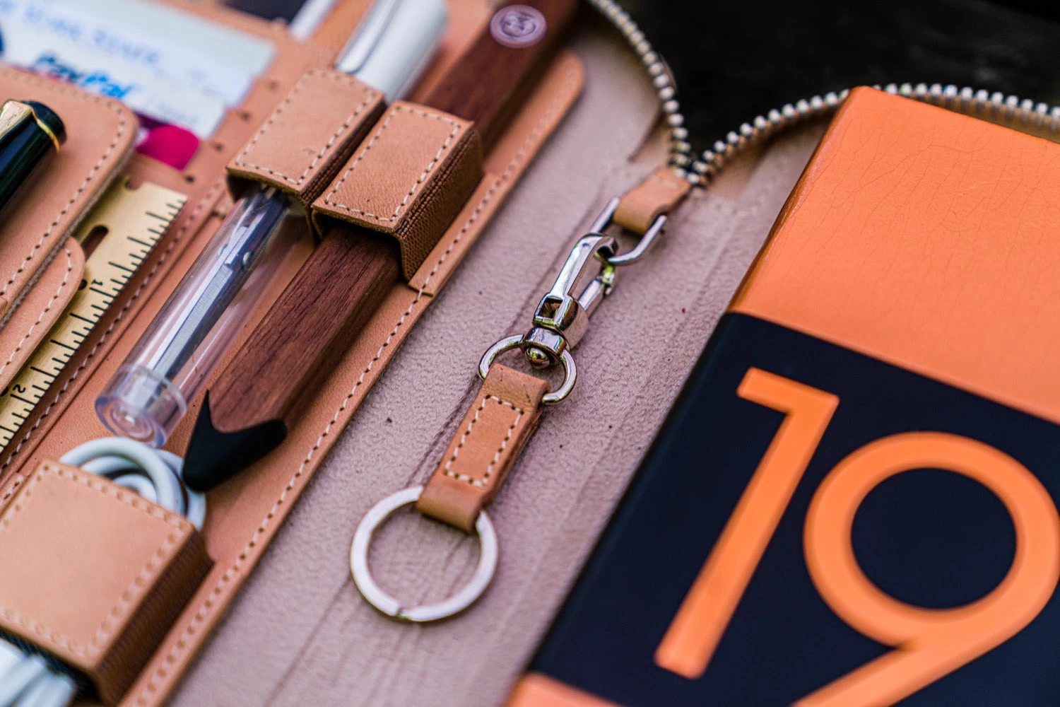 This beautiful folio has a removable 4 slot pen holder, 2 extra pen slots, and a slot for a charger, earbuds, or a cable. A removable keychain in found in the middle of the cover.