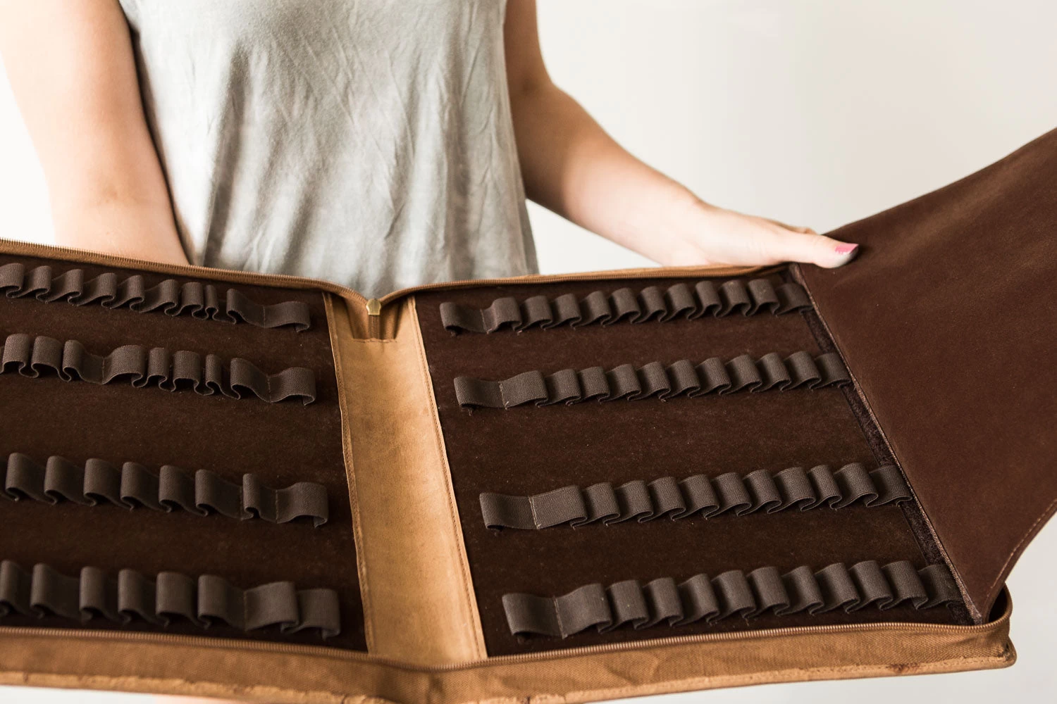 This tan leather Girologio zippered pen case has a soft velvet interior and holds up to 48 pens. Made from high quality, ecologically tanned leather, Girologio pen cases are an excellent choice for protecting your writing instruments. These leather cases are soft and supple while simultaneously being tough and durable.