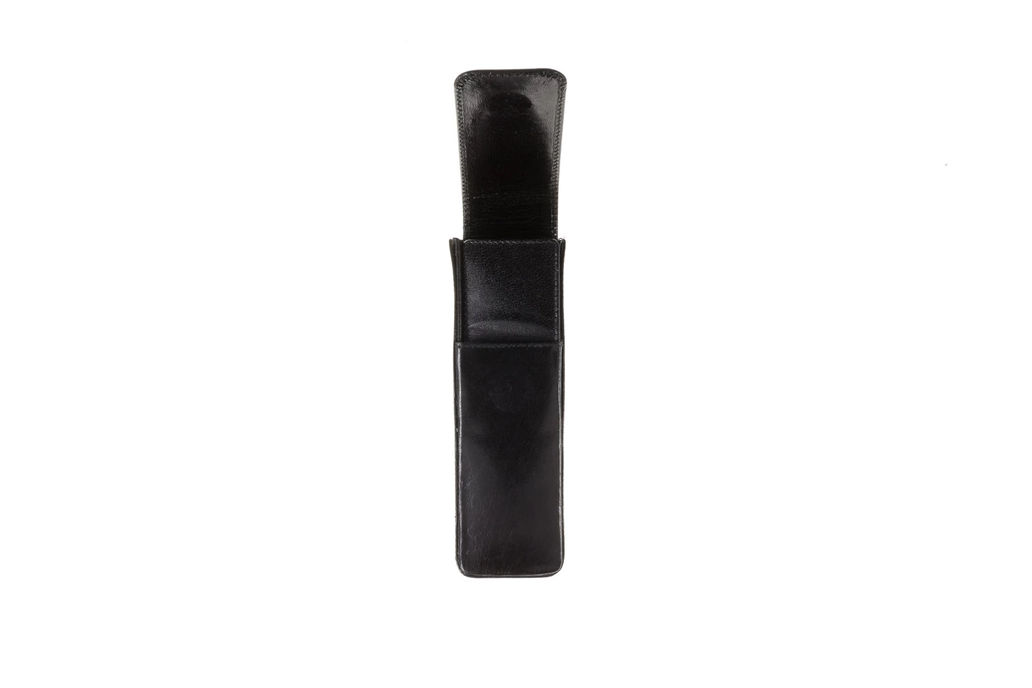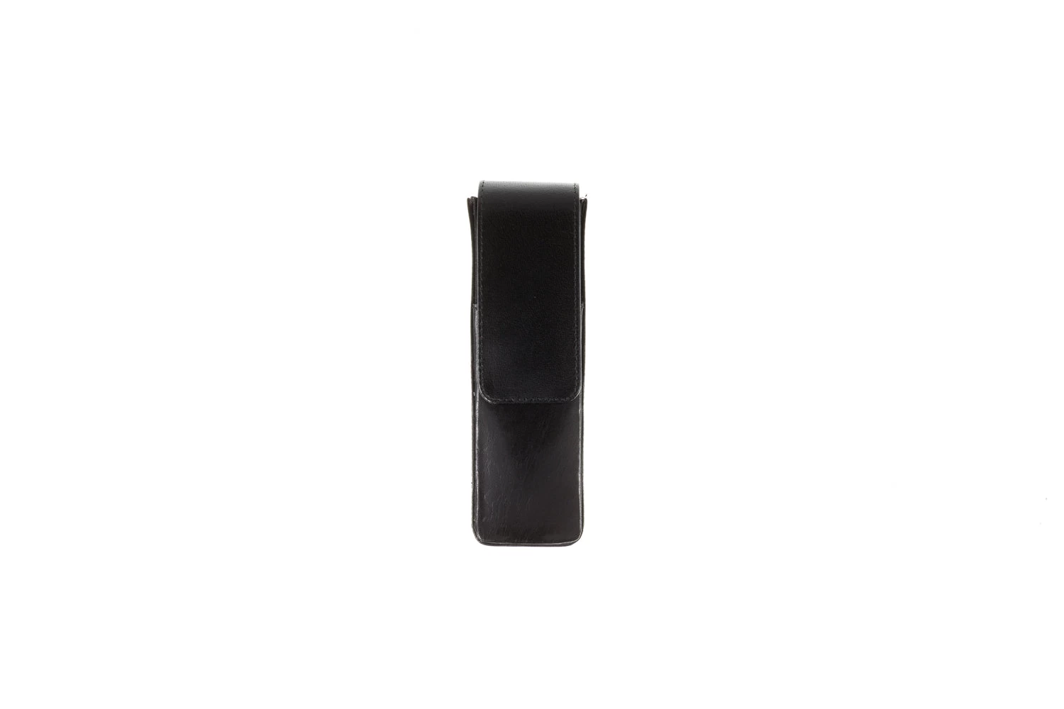 This black Girologio leather pen case features a unique magnetic closure system, with a hidden fold-down flap for quick and easy removal of any size pen. Inside the case is a soft lining and protective dividers to keep pens free from scratches. This case holds up to two pens.