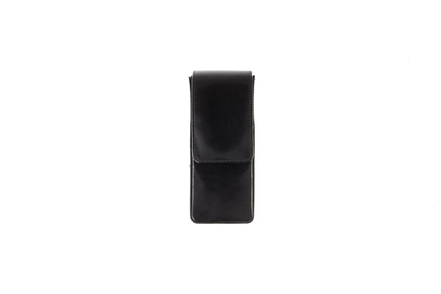 This black Girologio leather pen case features a unique magnetic closure system, with a hidden fold-down flap for quick and easy removal of any size pen. Inside the case is a soft lining and protective dividers to keep pens free from scratches. This case holds up to three pens.