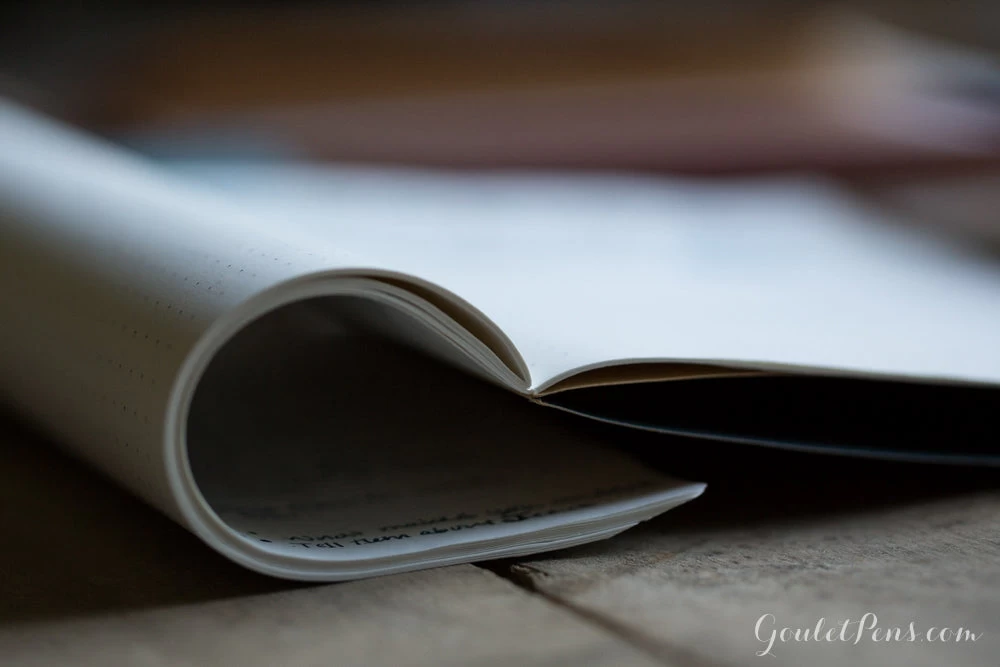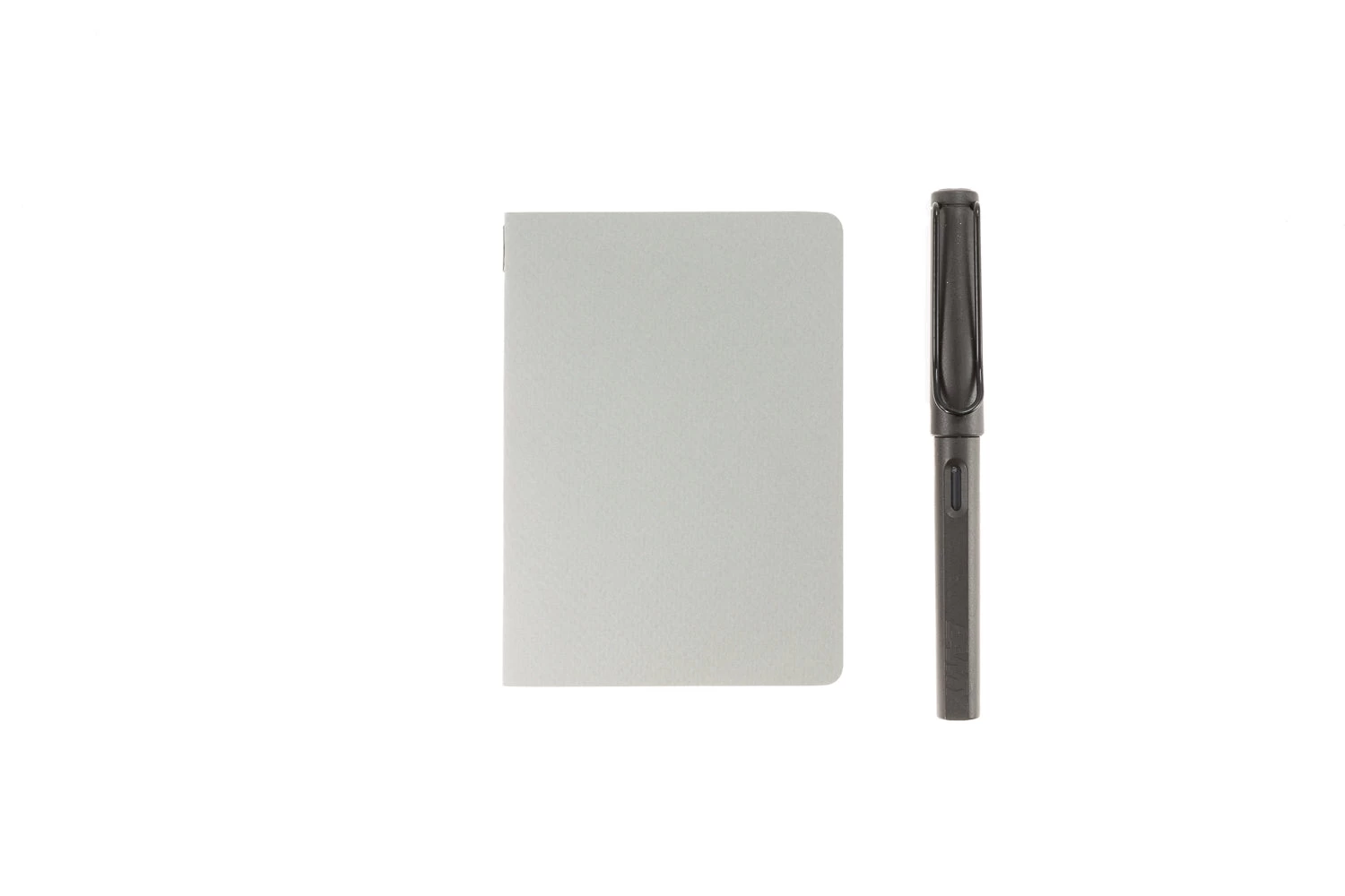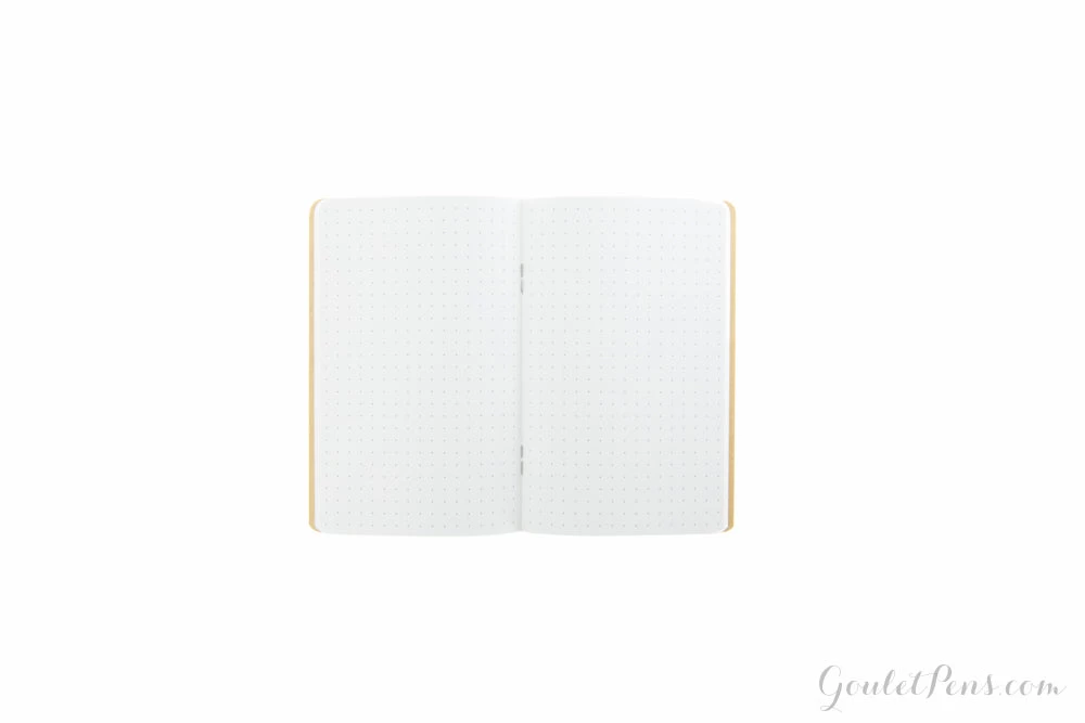 A Goulet Pens exclusive! This side stapled notebook features 48 sheets (96 pages) of white 52gsm fountain pen friendly dot grid Tomoe River paper, a grey 150g kraft paper cover printed with soy ink, rounded corners, and measures 8.9cm x 12.4cm (approximately 3.5in x 4.88in). Use it as a refill for inside your passport sized Traveler’s Notebook or as a standalone notebook. Made for us and assembled in Taiwan, using Tomoe River paper from Japan. Great for bullet journaling!