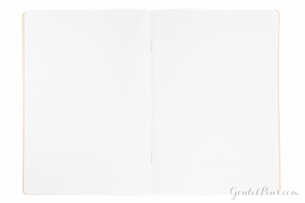 A Goulet Pens exclusive! This side stapled notebook features 32 sheets (64 pages) of white 68gsm fountain pen friendly dot grid Tomoe River paper, a dark brown 150g kraft paper cover printed with soy ink, rounded corners, and measures 14.8cm x 21cm (approximately 5.83in x 8.27in, or standard A5 size). Great for bullet journaling!