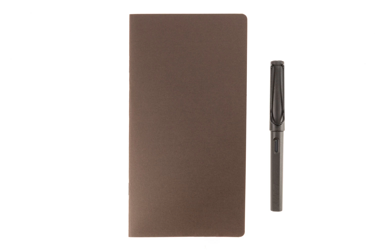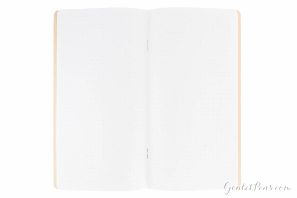 A Goulet Pens exclusive! This side stapled notebook features 32 sheets (64 pages) of white 68gsm fountain pen friendly dot grid Tomoe River paper, a dark brown 150g kraft paper cover printed with soy ink, rounded corners, and measures 11cm x 21cm (approximately 4.33in x 8.25in). Use it as a refill for inside your regular sized Traveler’s Notebook or as a standalone notebook. Great for bullet journaling!