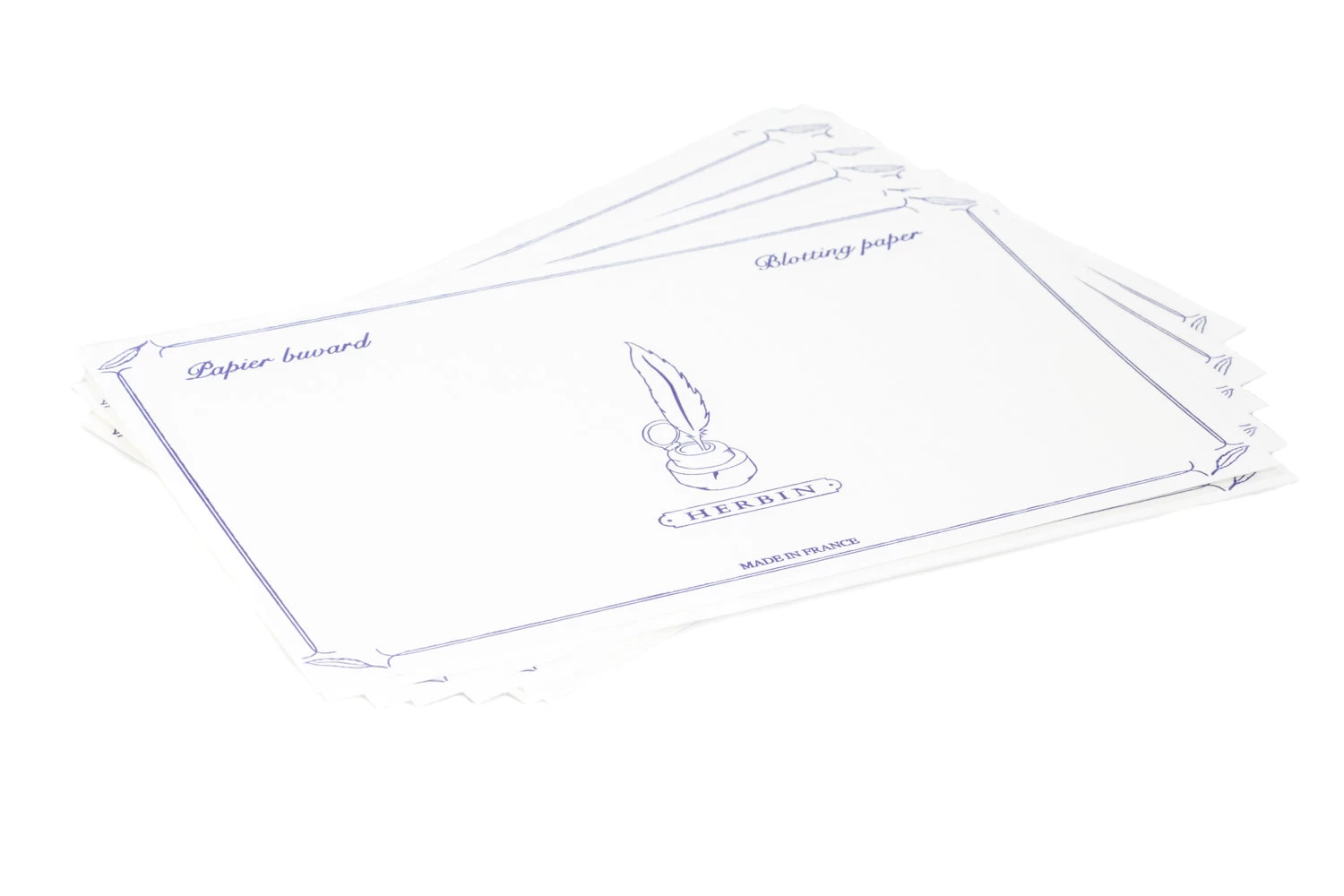 10 sheets of white Herbin ink blotting paper. These sheets can be cut down to fit the Herbin rocker blotter. Each sheet measures 7.5″ x 4.75″.