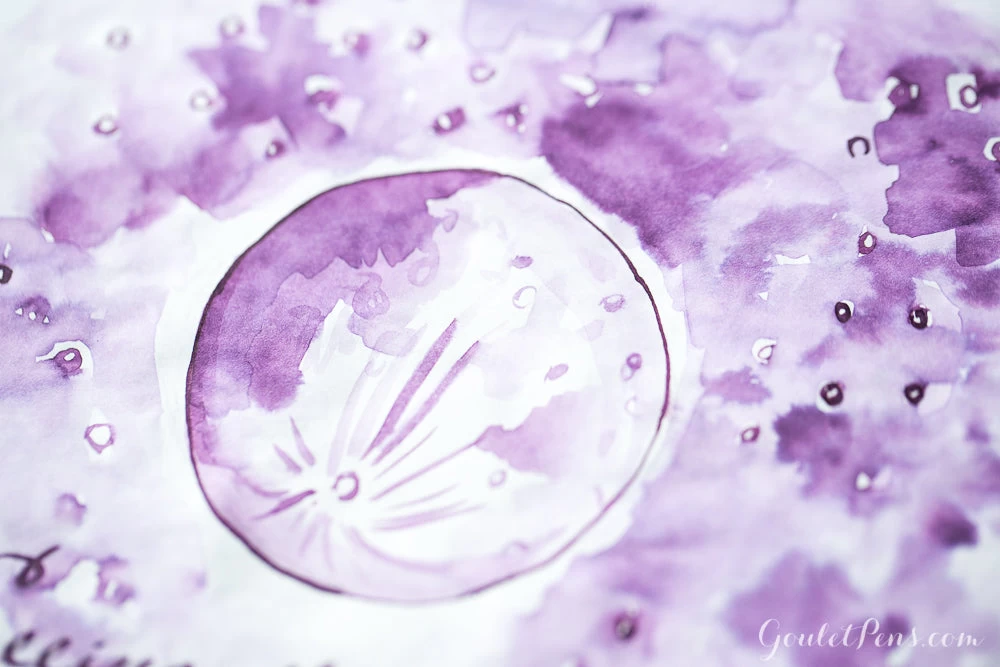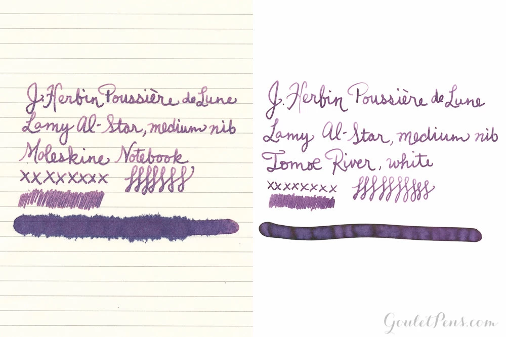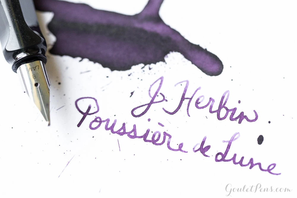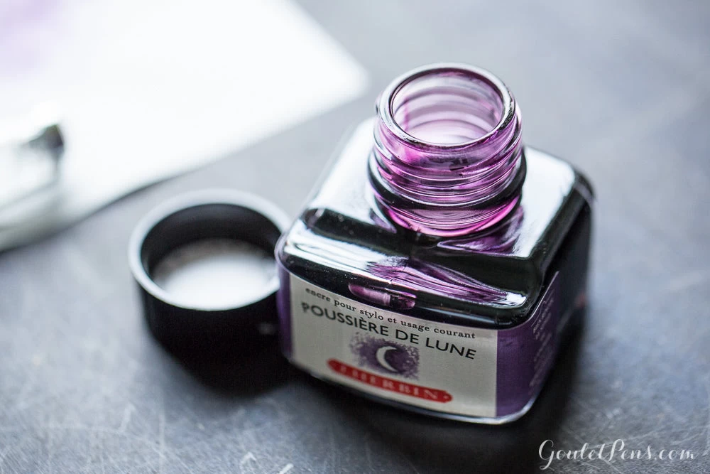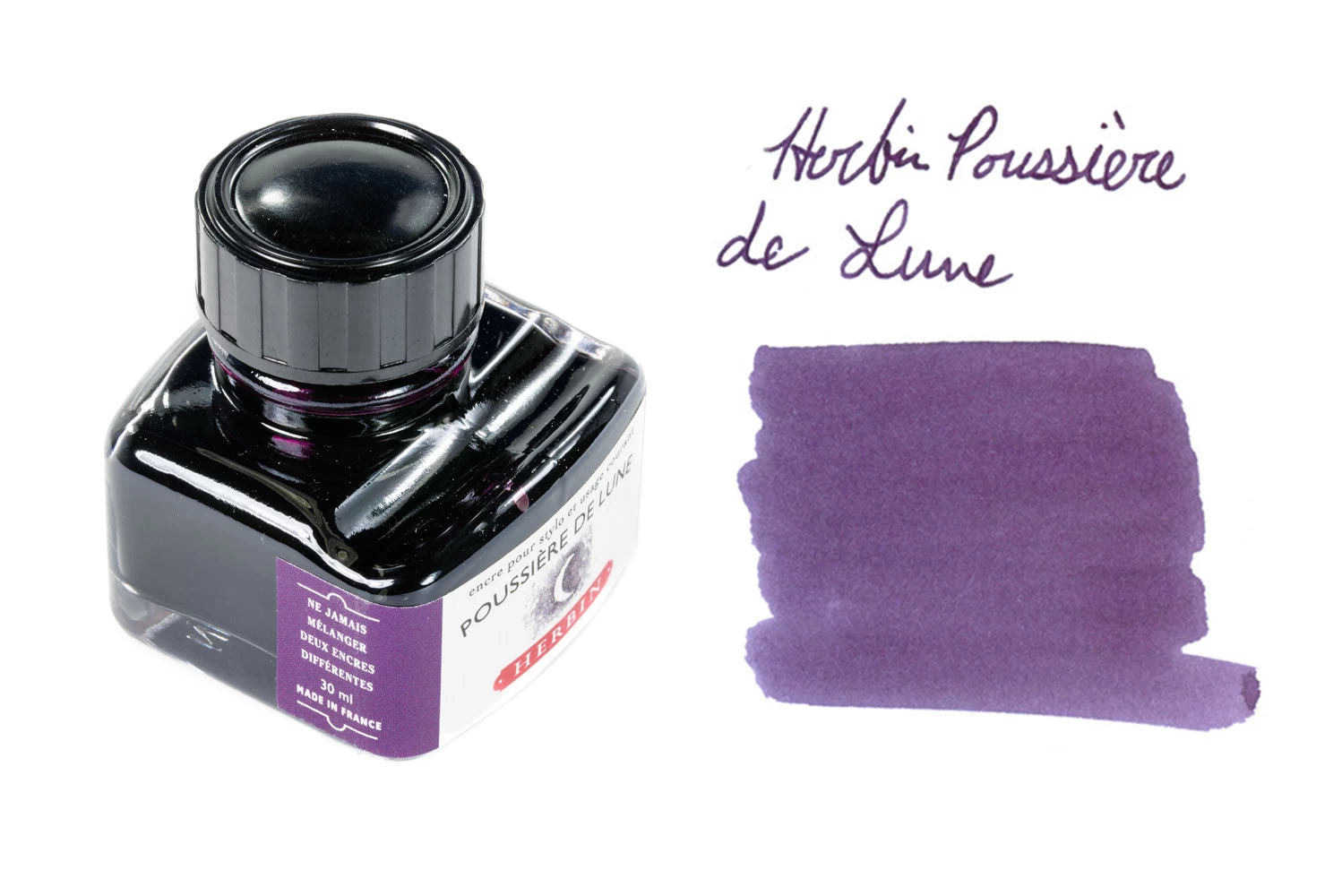 This 30ml glass bottle of Herbin Poussière de Lune dusty purple fountain pen ink is elegantly labeled and has an integrated pen rest. Herbin ink is non-toxic and pH neutral, water based, flows smoothly, and uses all natural dyes.