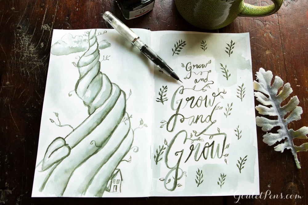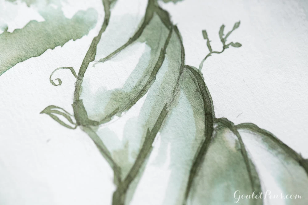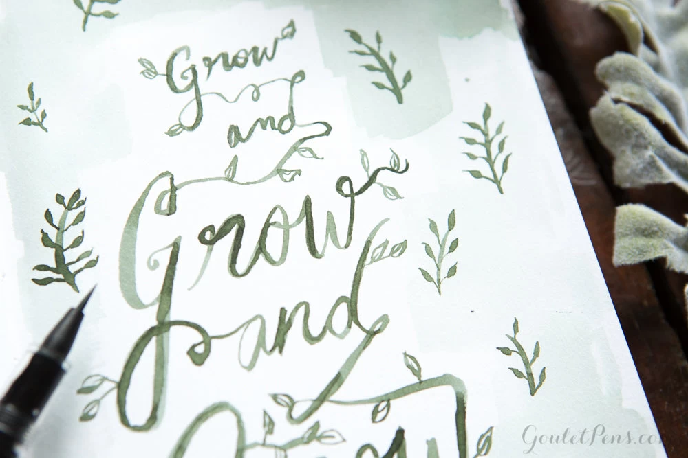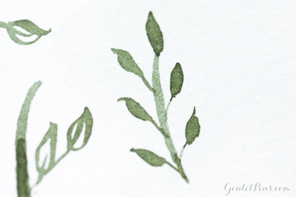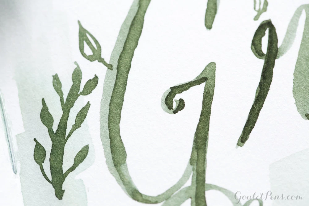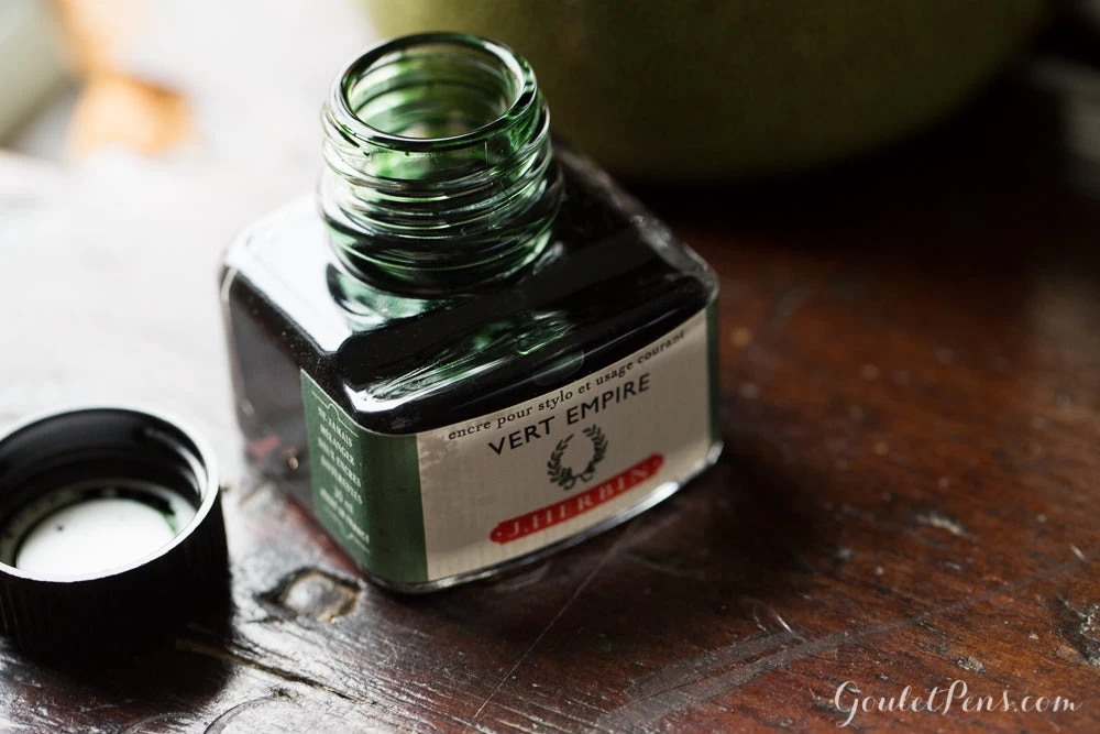 This 30ml glass bottle of Herbin Vert Empire green fountain pen ink is elegantly labeled and has an integrated pen rest. Herbin ink is non-toxic and pH neutral, water based, flows smoothly, and uses all natural dyes.