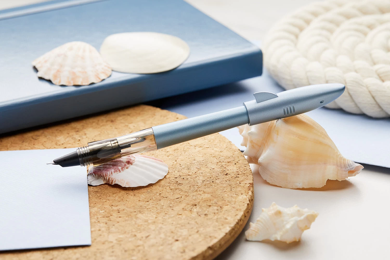 Attack your writing with a Jinhao Shark fountain pen! This fun plastic pen is a good writer for the beginner or the long-time enthusiast, and the hooded extra-fine steel nib provides a nice crisp line. It fills via standard international cartridge/converter (converter included, no ink) or can be converted to be eyedropper-filled. The shark head cap unscrews open and pushes to post. The translucent triangular grip assists in proper pen position. Perfect for kids, the avid shark enthusiast, or anyone who enjoys a fun affordable pen.