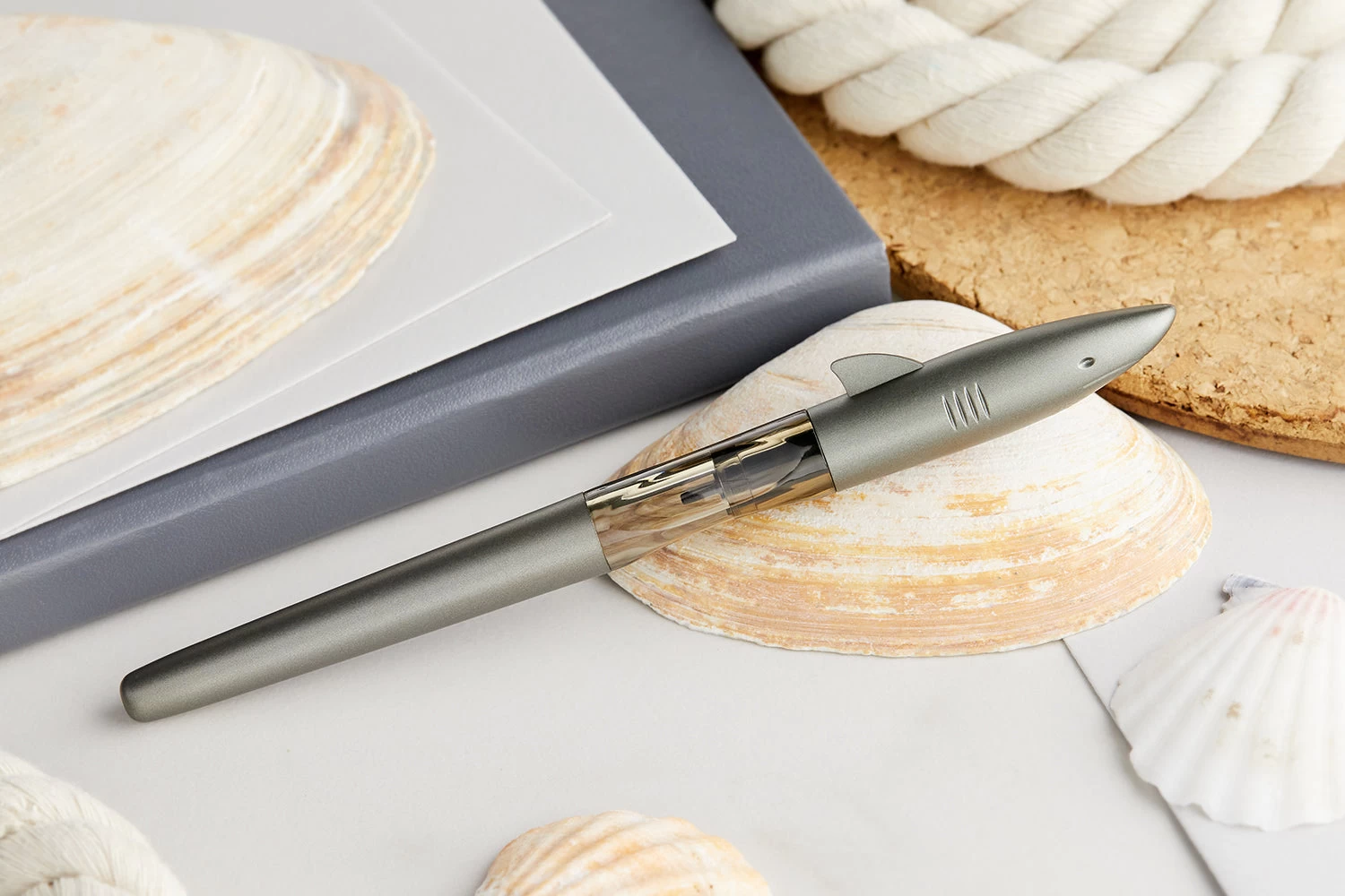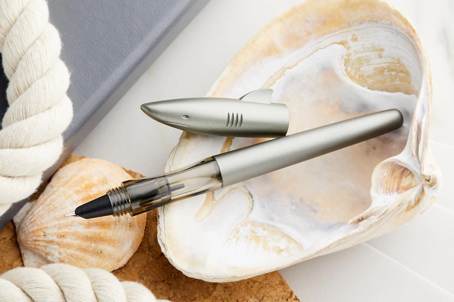 Attack your writing with a Jinhao Shark fountain pen! This fun plastic pen is a good writer for the beginner or the long-time enthusiast, and the hooded extra-fine steel nib provides a nice crisp line. It fills via standard international cartridge/converter (converter included, no ink) or can be converted to be eyedropper-filled. The shark head cap unscrews open and pushes to post. The translucent triangular grip assists in proper pen position. Perfect for kids, the avid shark enthusiast, or anyone who enjoys a fun affordable pen.