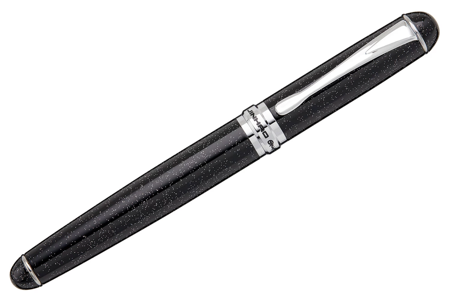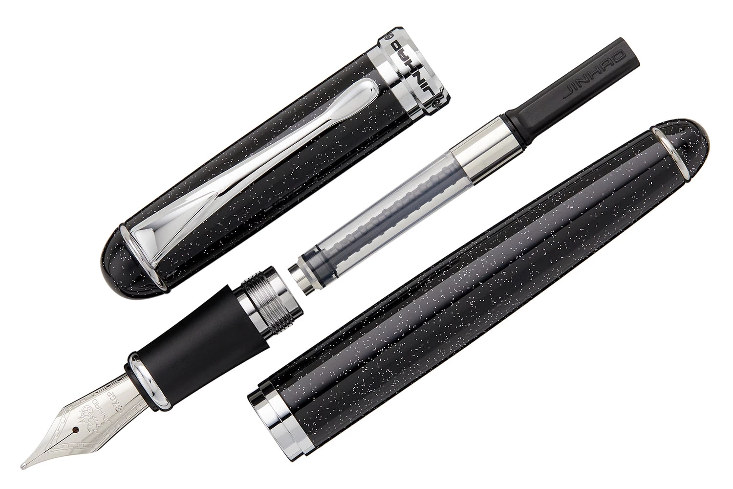 The Jinhao X750 fountain pen is made in China. It features a black body with tons of multi-colored sparkles throughout, chrome hardware, and a silver #6 steel nib. It comes with a converter, and also accepts standard international cartridges (not included).