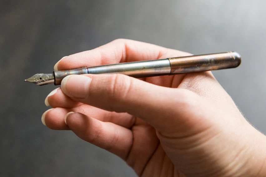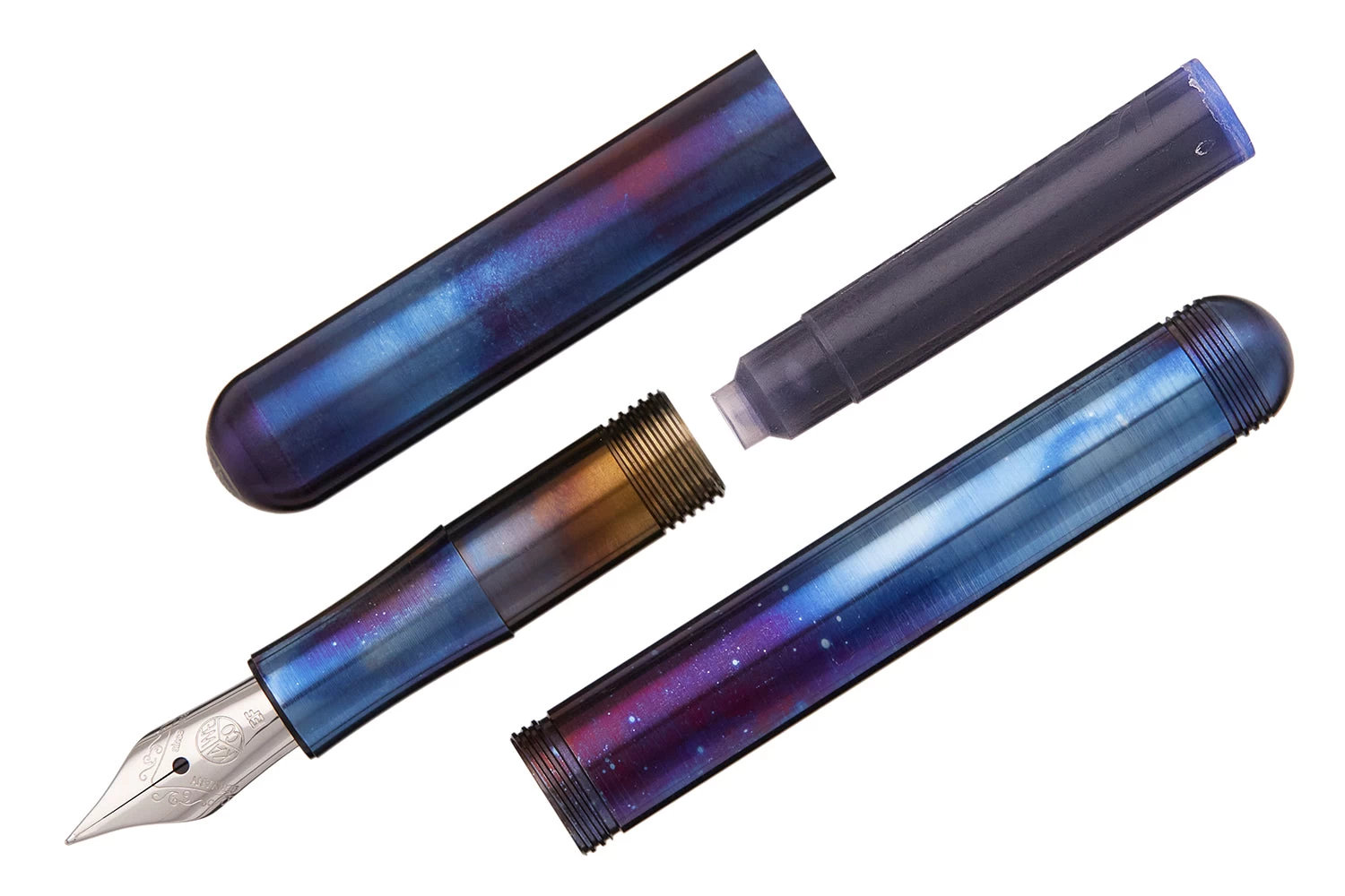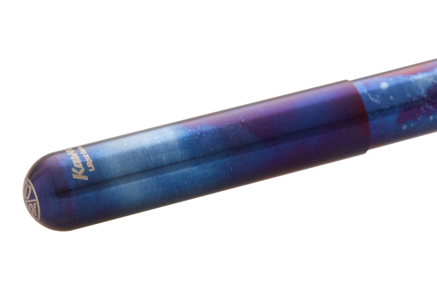 The Kaweco Liliput is a tiny fountain pen that when posted transforms into a full-sized pen that easily fits in your hand. This steel fountain pen features an amazing finish – each pen is hand-torched, which gives it a unique pattern of colors ranging from blue to purple to brown. Every pen is different! It comes with a stainless steel nib and an ink cartridge to get you started writing right away! The cap screws on to the back to post securely, and it accepts short standard international cartridges. Optional clip sold separately.