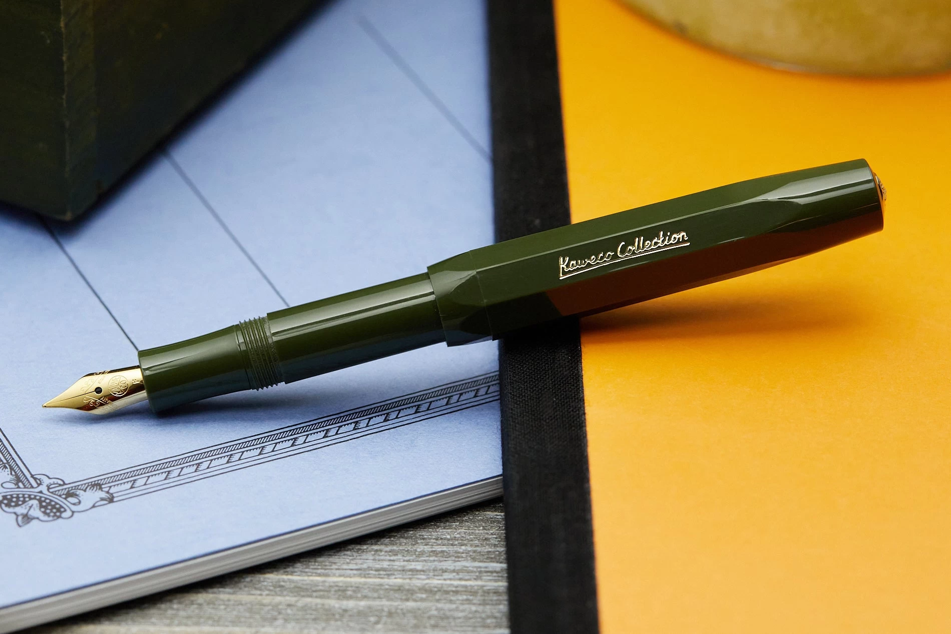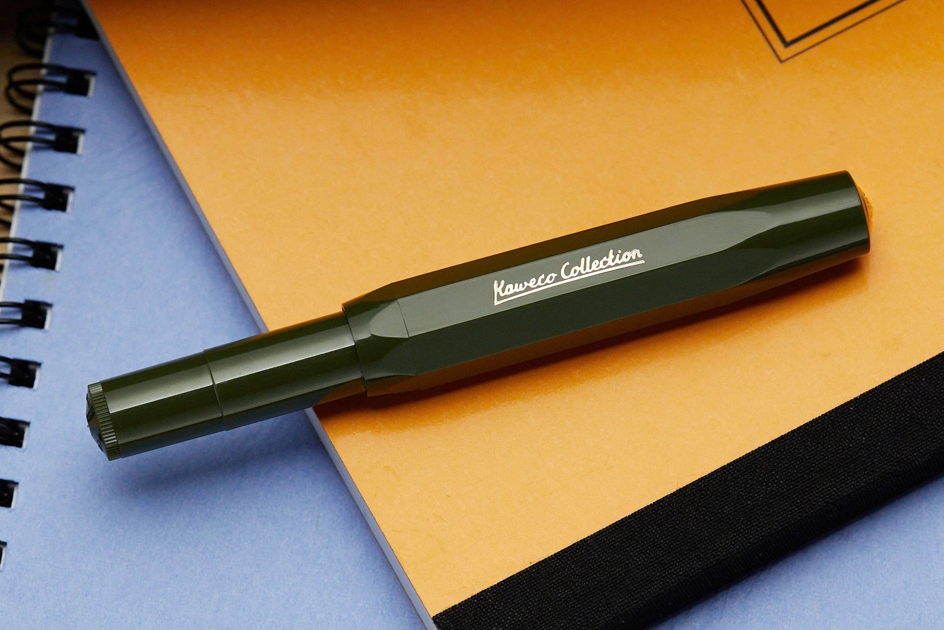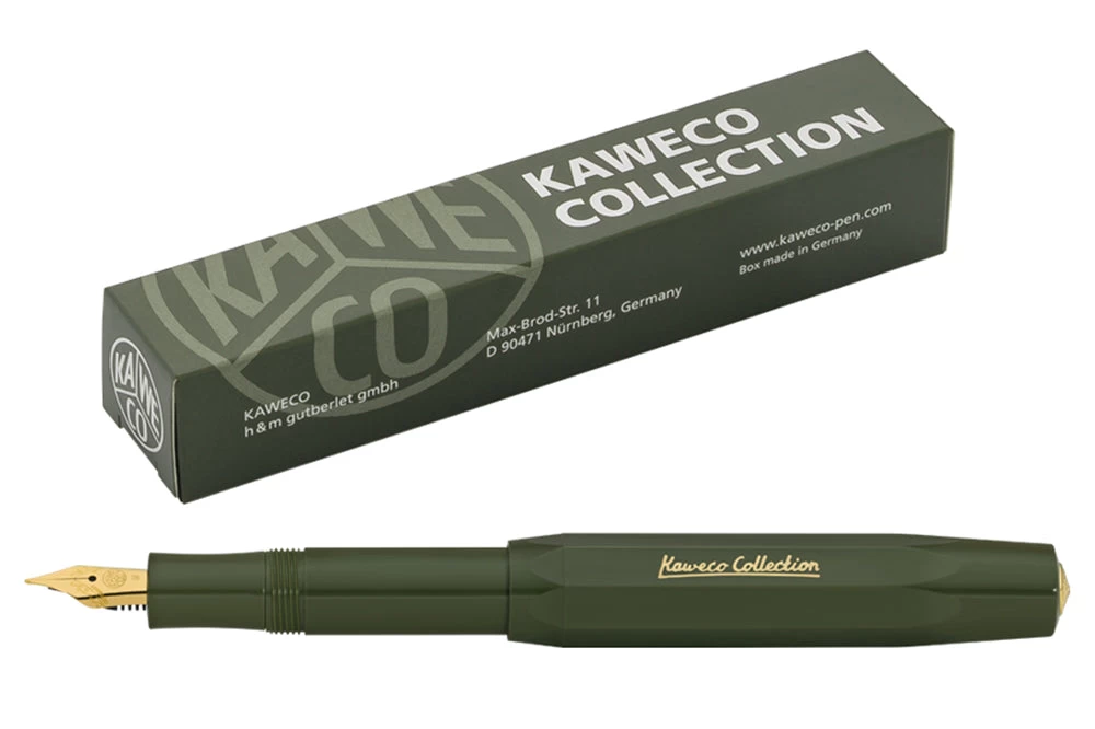 The Kaweco Sport is a pocket-sized fountain pen that when posted transforms into a full-sized pen that easily fits in your hand. This solid dark olive resin fountain pen comes with a gold-plated steel nib and an ink cartridge to get you started writing right away! It uses short standard international ink cartridges, or you can easily convert it to an eyedropper pen with a little bit of silicone grease. Converter and optional clip sold separately.