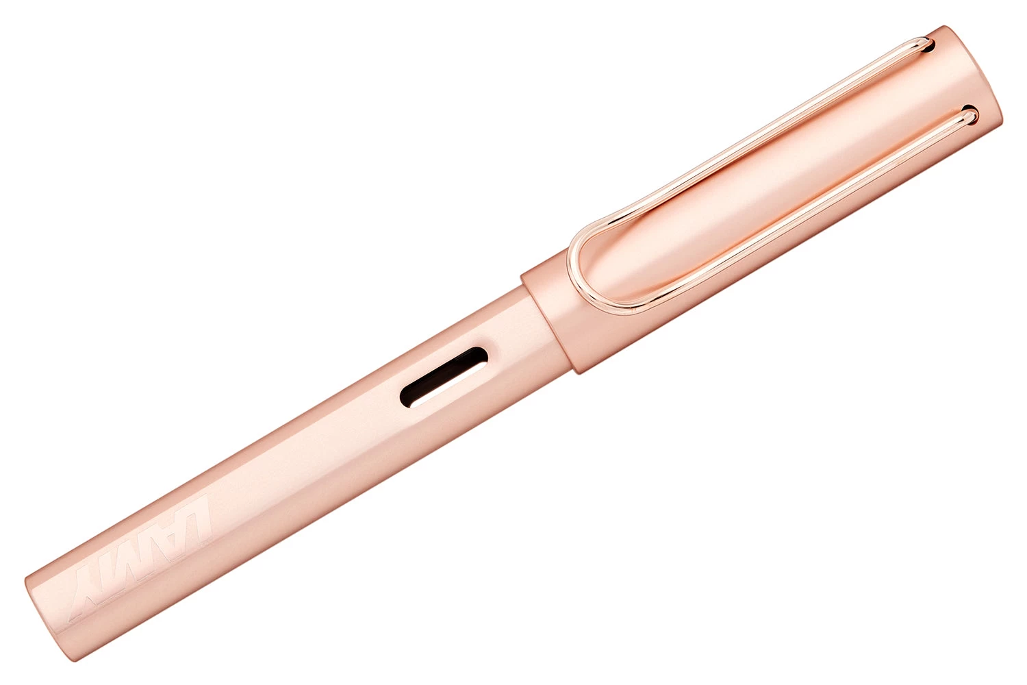 This LAMY Lx (“Luxe”) fountain pen features a body made from rose gold colored double-anodized aluminum, a gold-coated clip, a translucent grey triangular grip section, and a black glossy interchangeable steel nib.