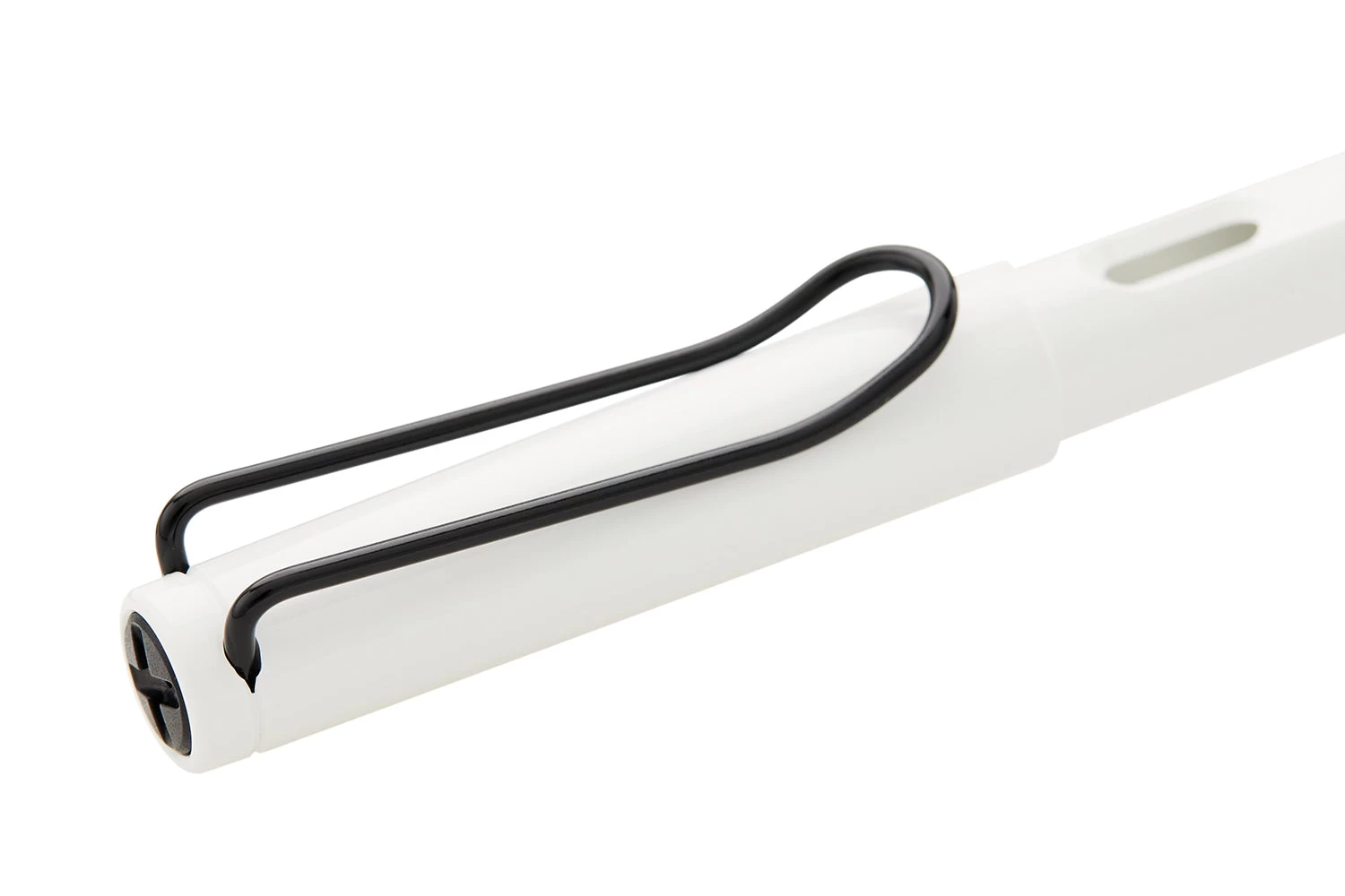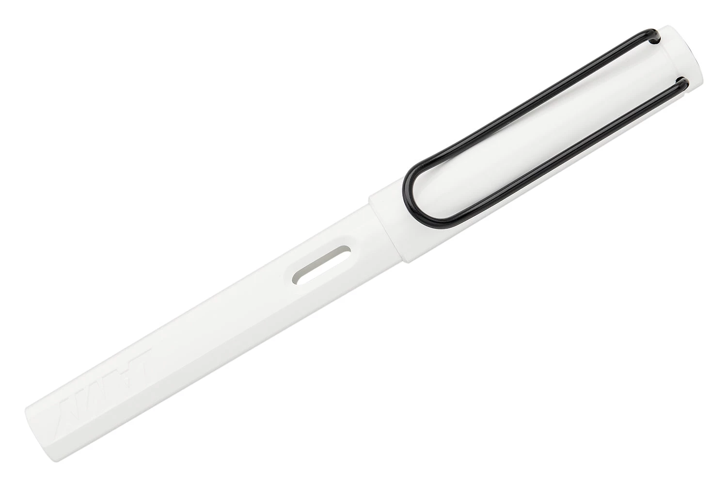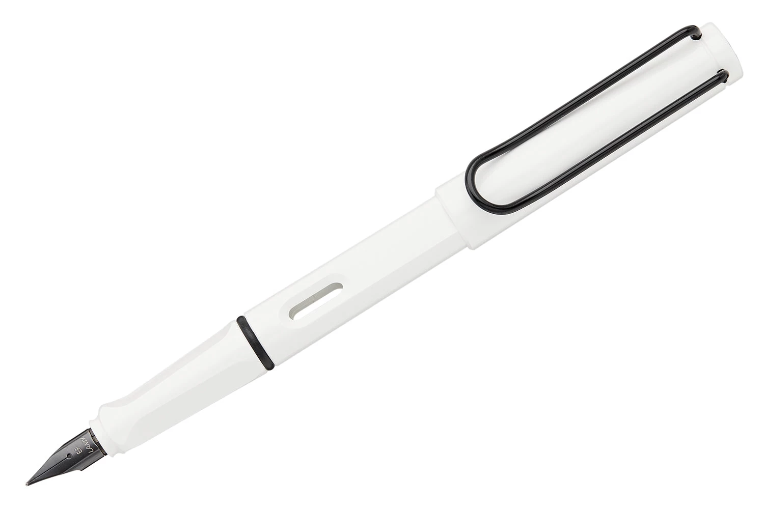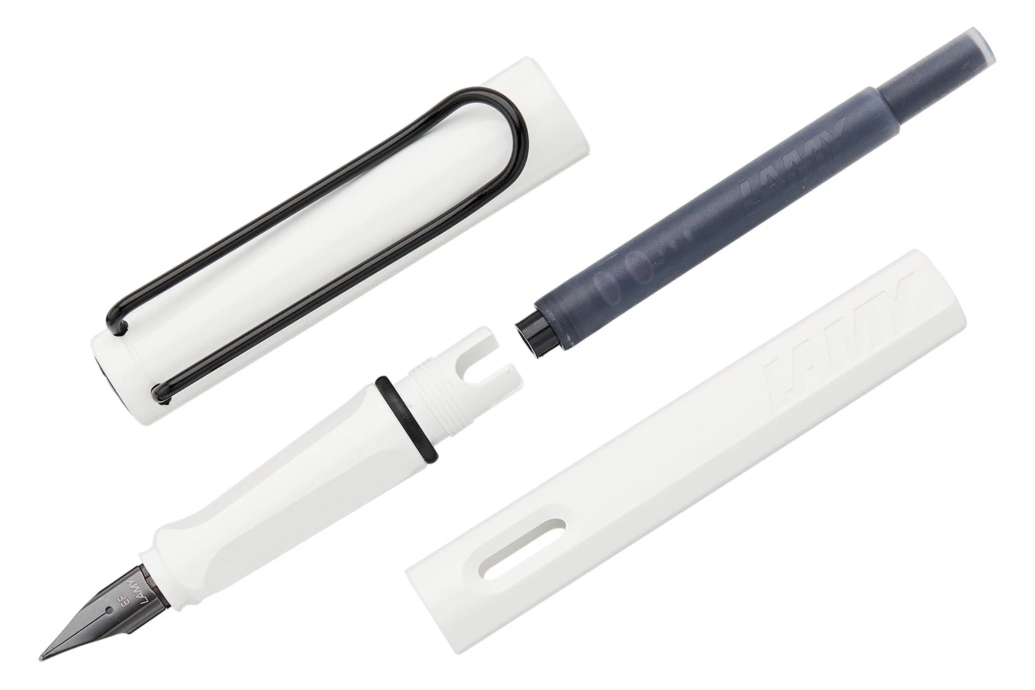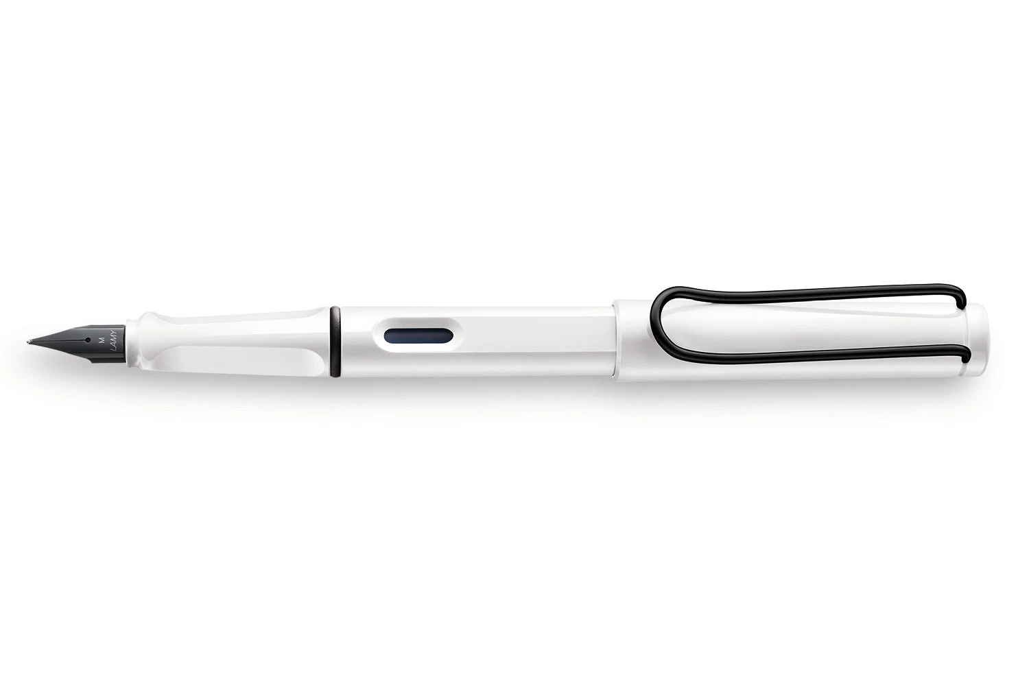 This white LAMY safari fountain pen comes with a black clip and an interchangeable black steel nib, which can be easily swapped out for another size. It also comes with a blue LAMY ink cartridge so you can get started writing right away.