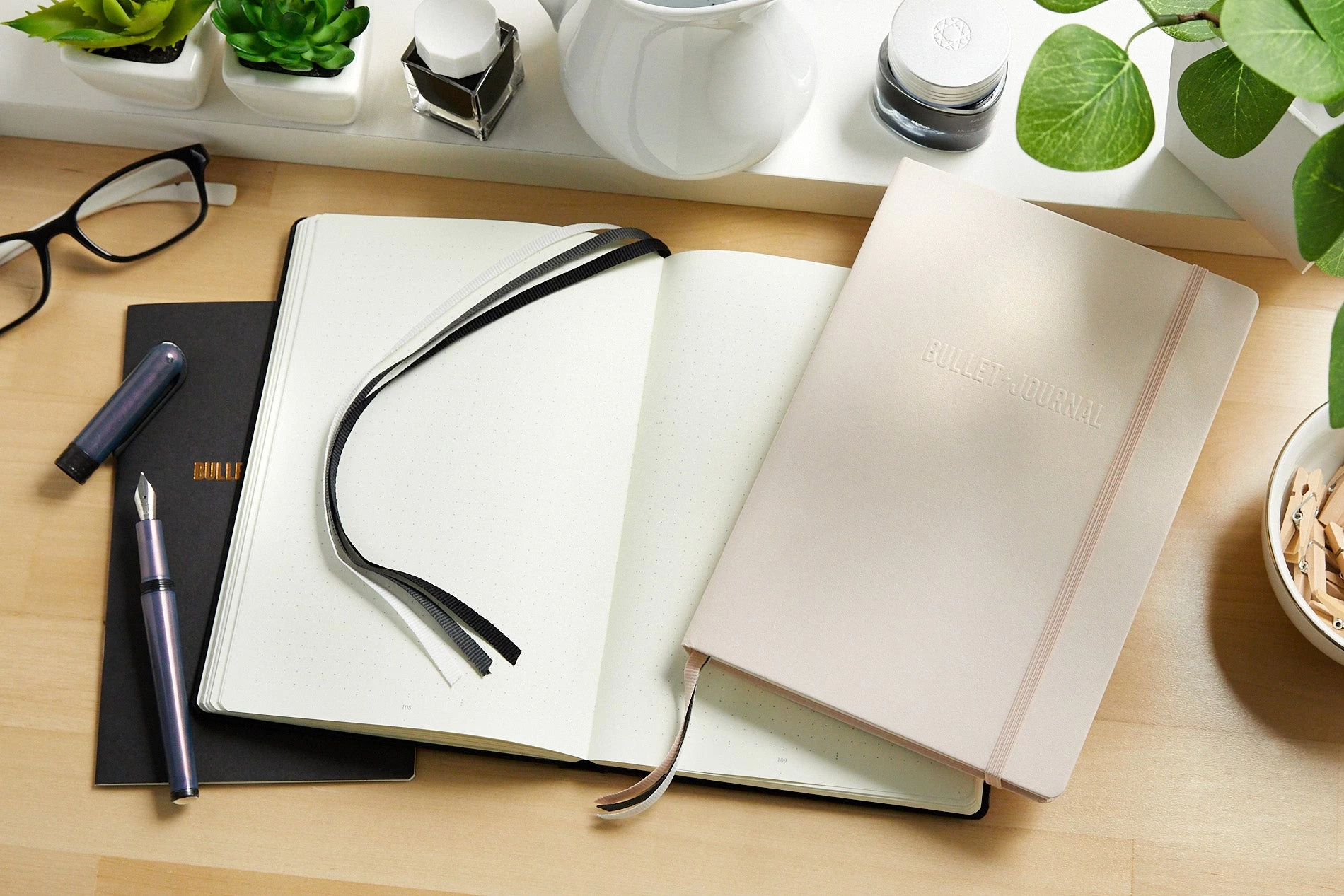 Special notebook features include: page divider for quick grouping of pages; detachable Bullet Journal® pocket guide in English; grid guide in the inside cover; a set of stickers featuring days of the week, months and much more; three ribbon page markers; Index, Future Log and 206 numbered pages; an elastic enclosure band; a gusseted inner pocket for small souvenirs, notepads or cards; stickers for labelling and archiving; and a blind embossing “Bullet Journal” on the cover.