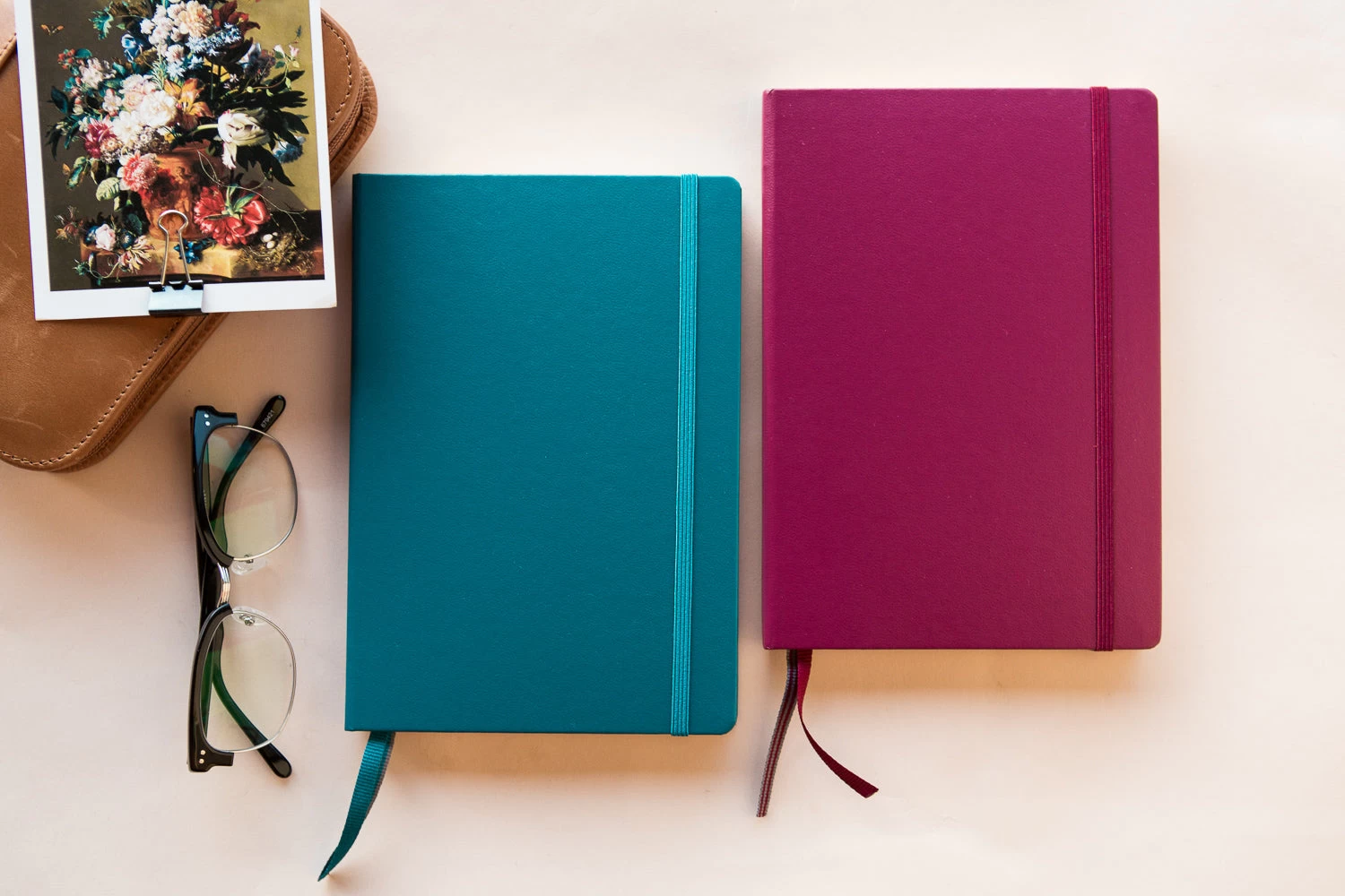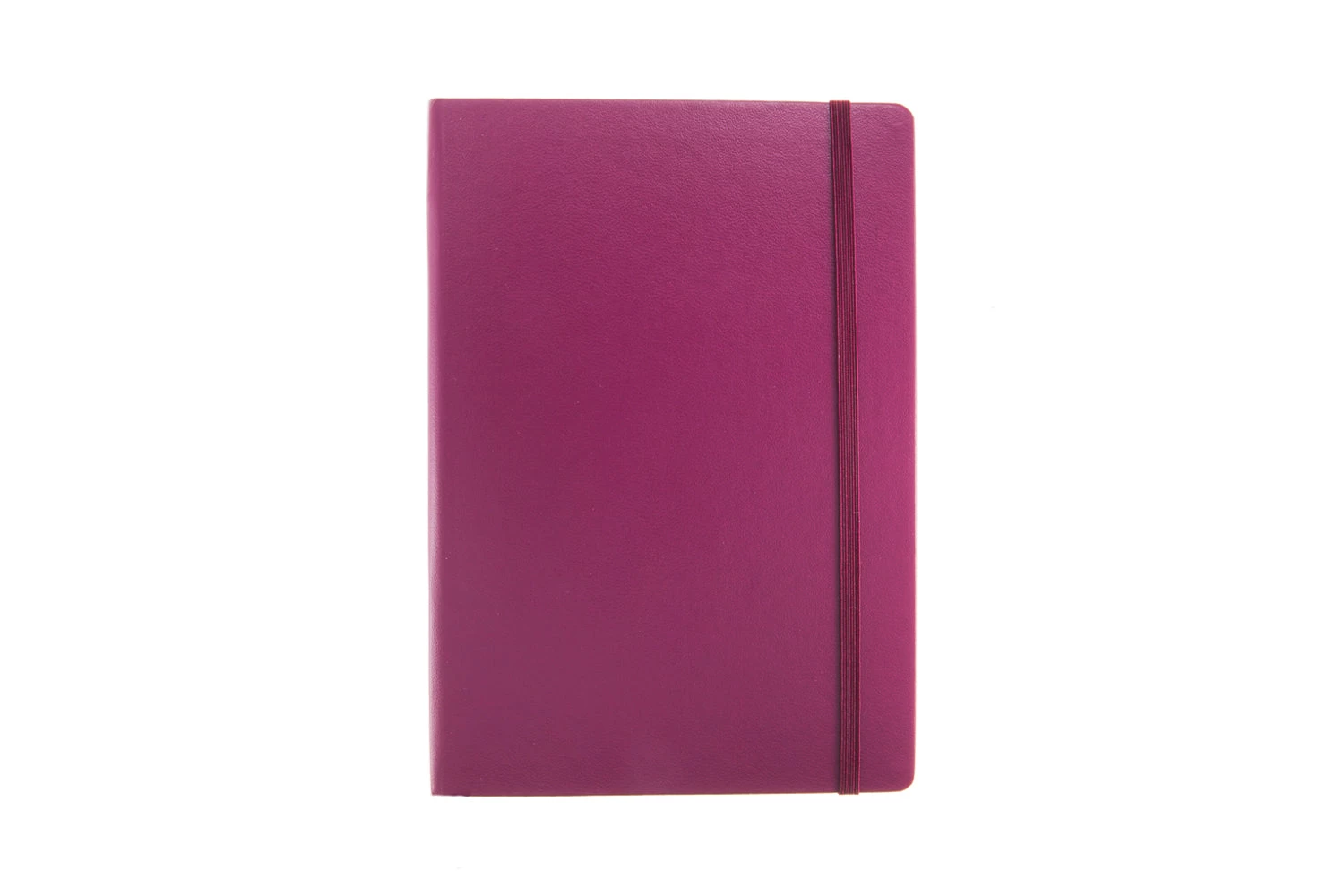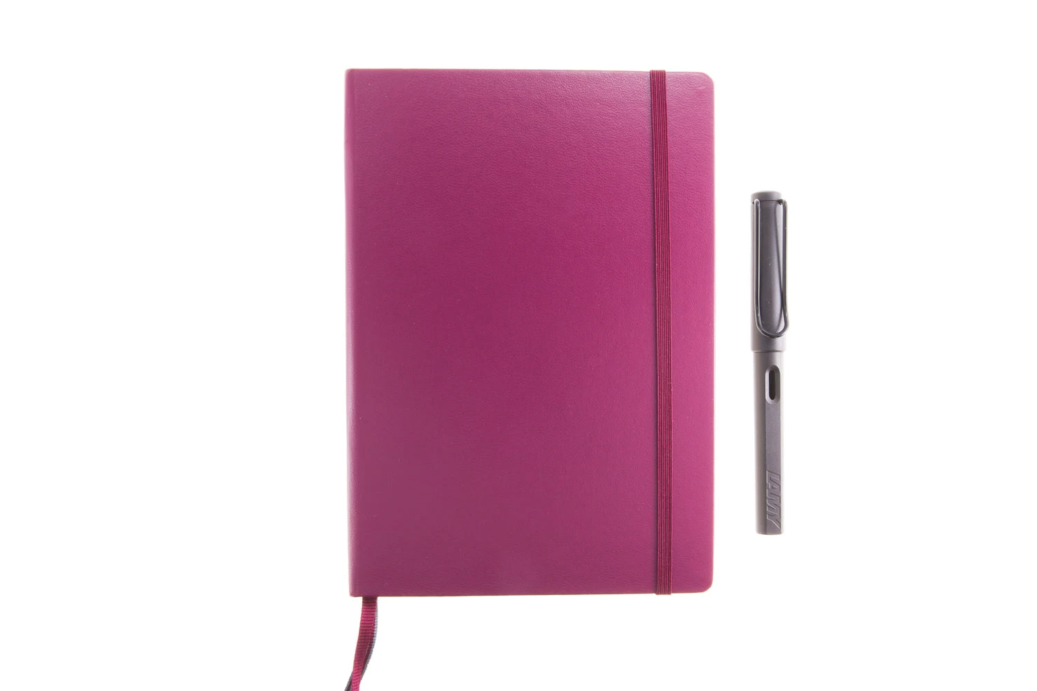 This medium A5-sized port red Leuchtturm1917 hardcover notebook is equally suited for the desk and for use on the move. It contains 249 numbered pages (125 sheets) of 5mm dot grid 80g ivory paper. Features include an expandable pocket, a blank table of contents, two ribbon page markers, elastic band fastener, stickers for labeling/archiving, and it opens flat. Great for bullet journaling!