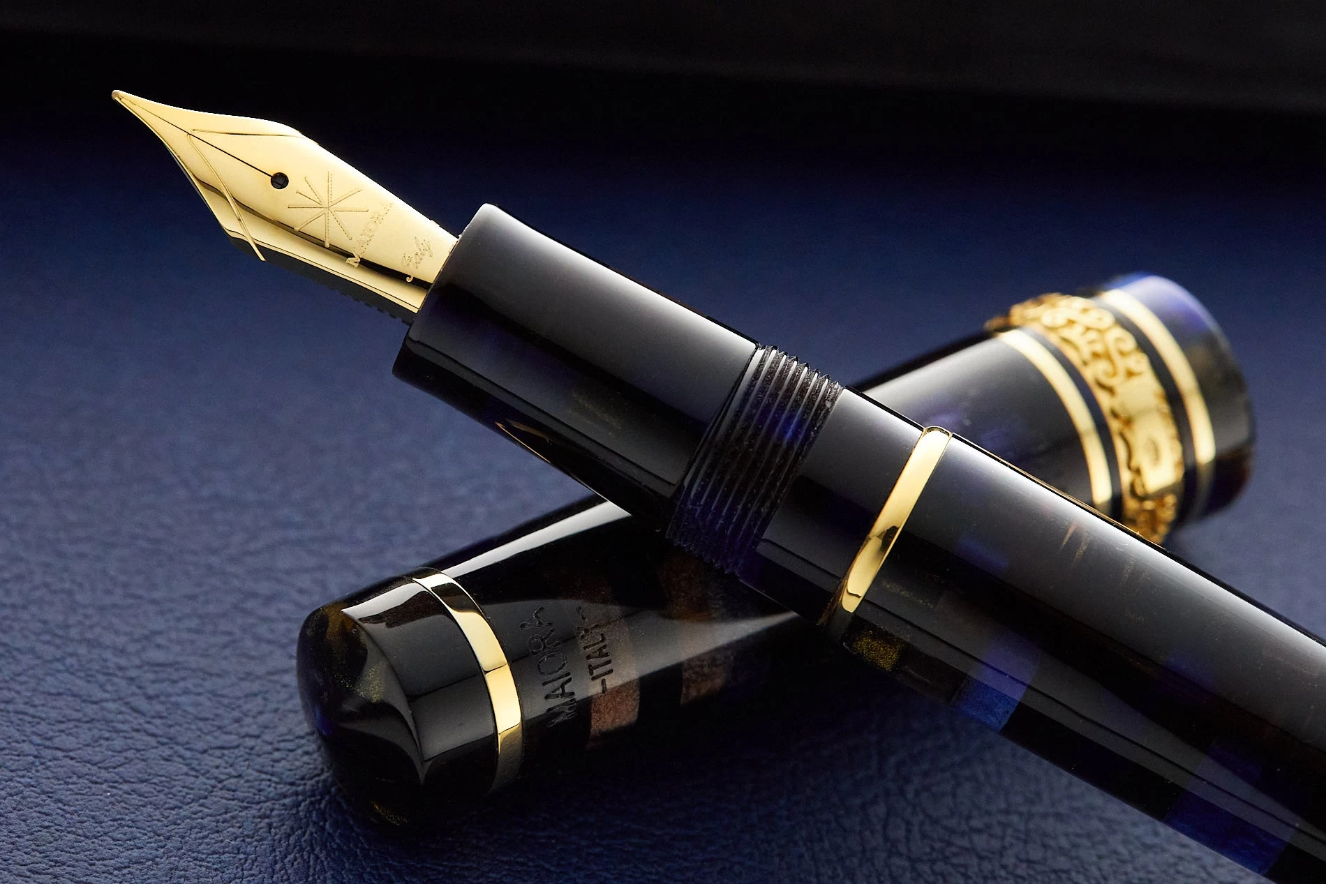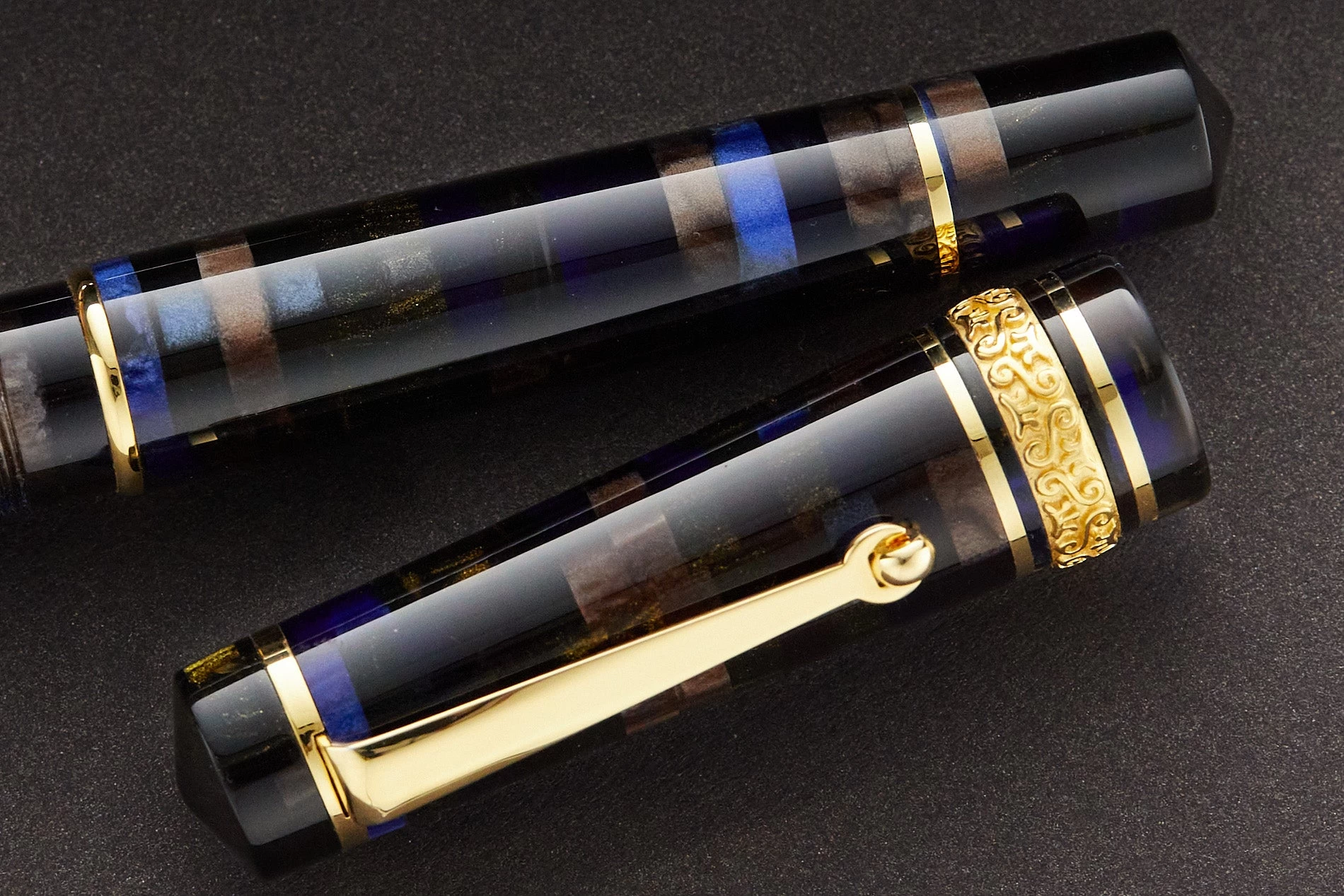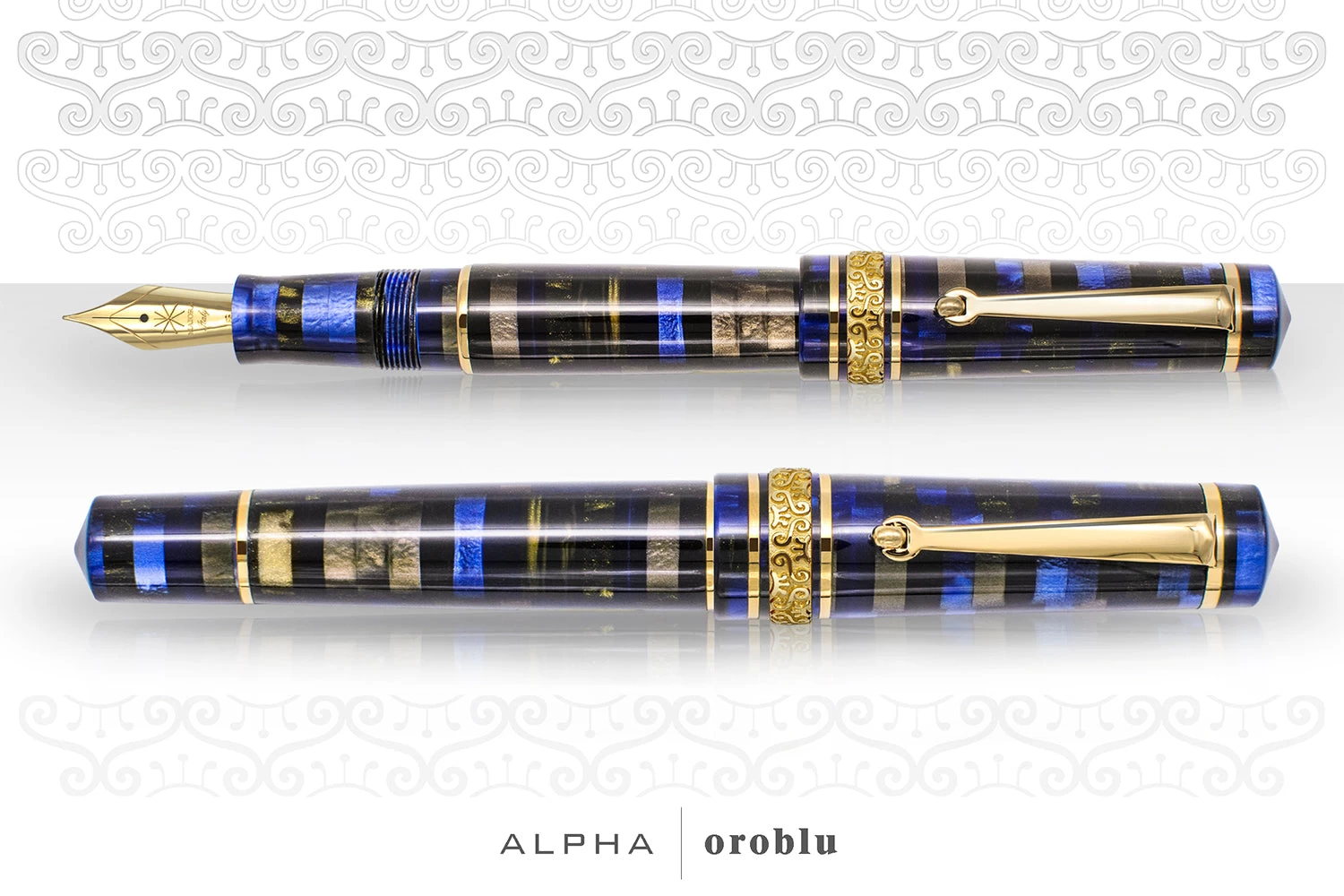 A new fountain pen collection by the Maiora Pen Company, the Alpha is made with raw materials of only Italian origin, with very special and exclusive color effects. This fountain pen features a stacked resin with shades of blue, gold, and black, and a beautifully engraved centerband. The cap’s centerband is made from sterling silver, plated in gold.