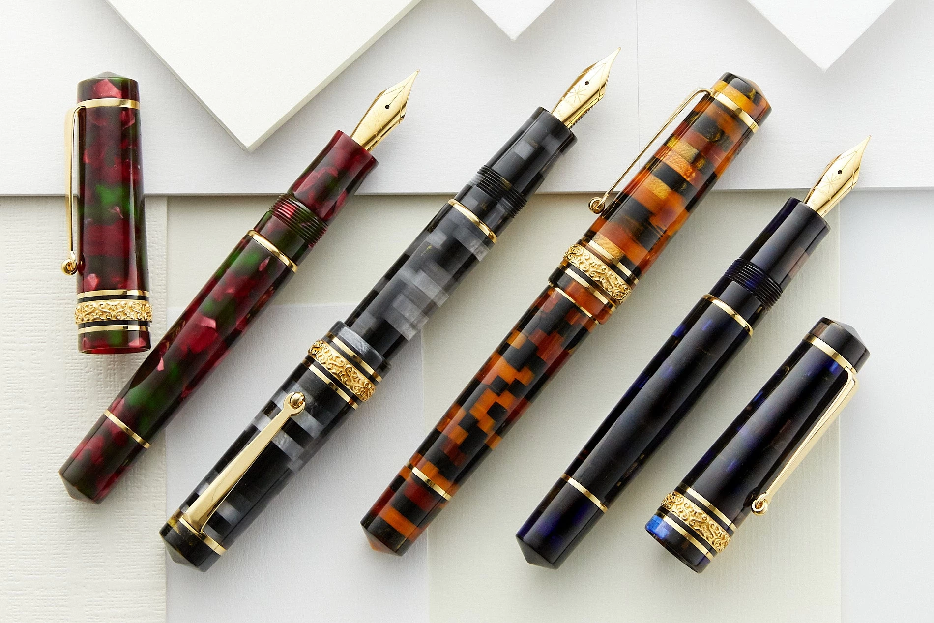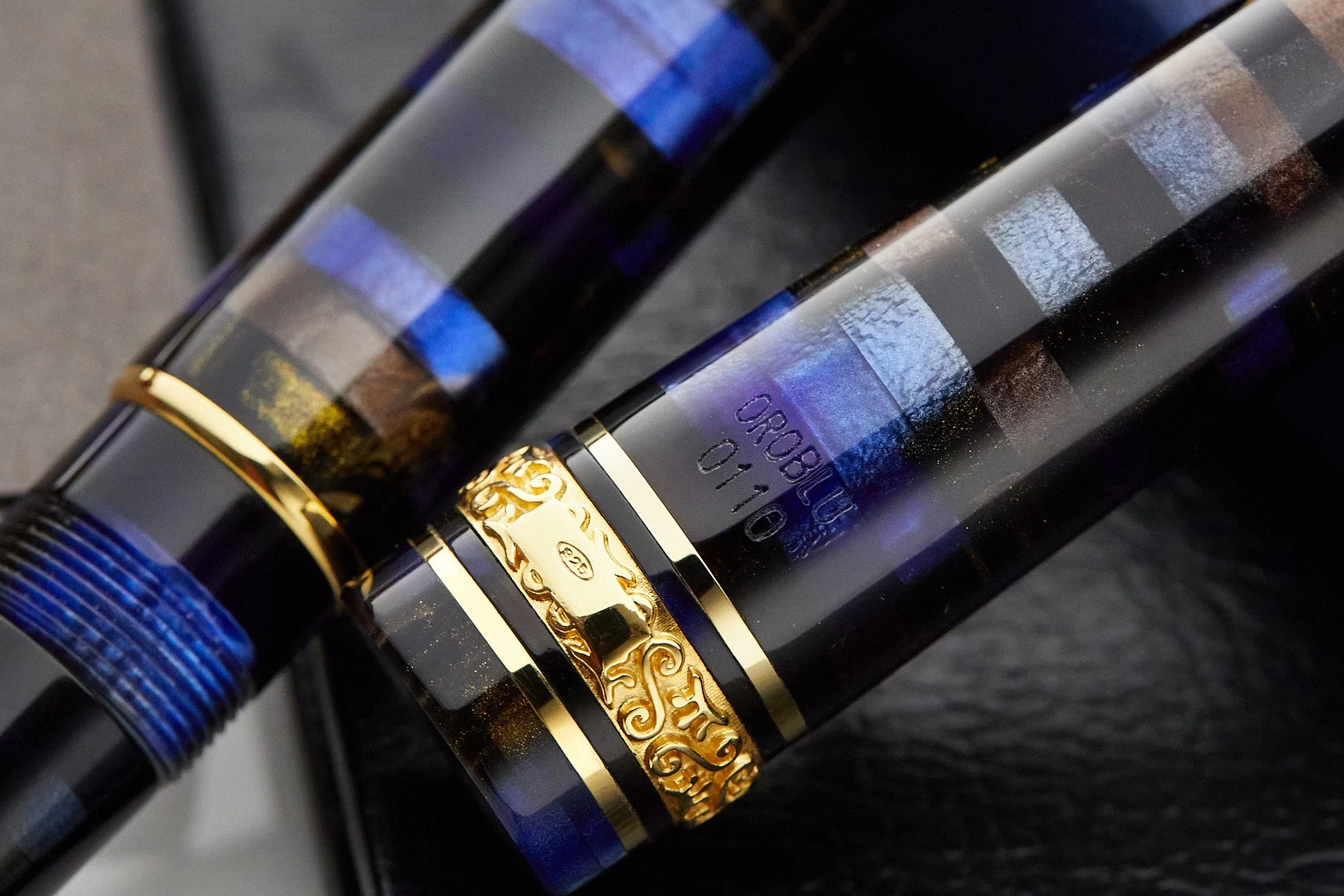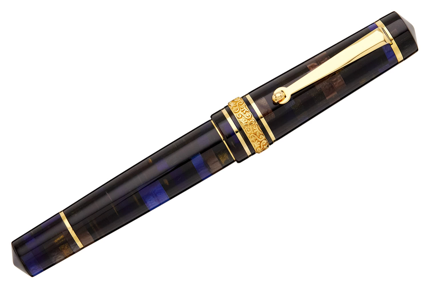 A new fountain pen collection by the Maiora Pen Company, the Alpha is made with raw materials of only Italian origin, with very special and exclusive color effects. This fountain pen features a stacked resin with shades of blue, gold, and black, and a beautifully engraved centerband. The cap’s centerband is made from sterling silver, plated in gold.