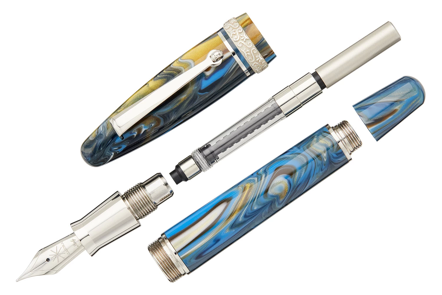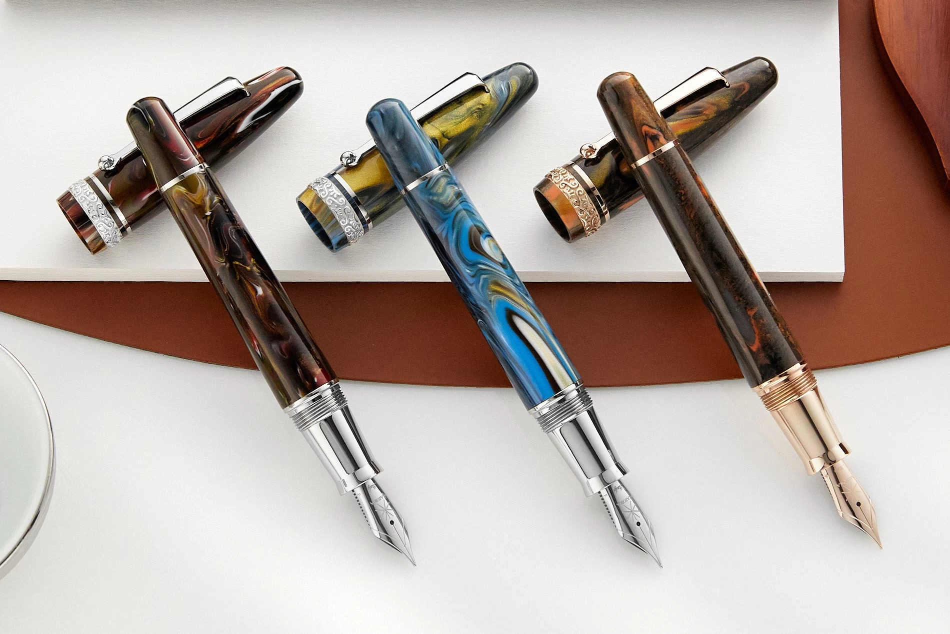 Maiora is proud to present the exquisite Ogiva Golden Age fountain pen collection, a masterpiece made using special Italian materials that contain gold powders, giving them the name “Golden Age”. Despite its classic shape, the collection features an innovative design called “Ultra Ogive”, which is entirely new. Each pen is numbered, features a 925 sterling silver cap band and is 100% handmade in Italy.