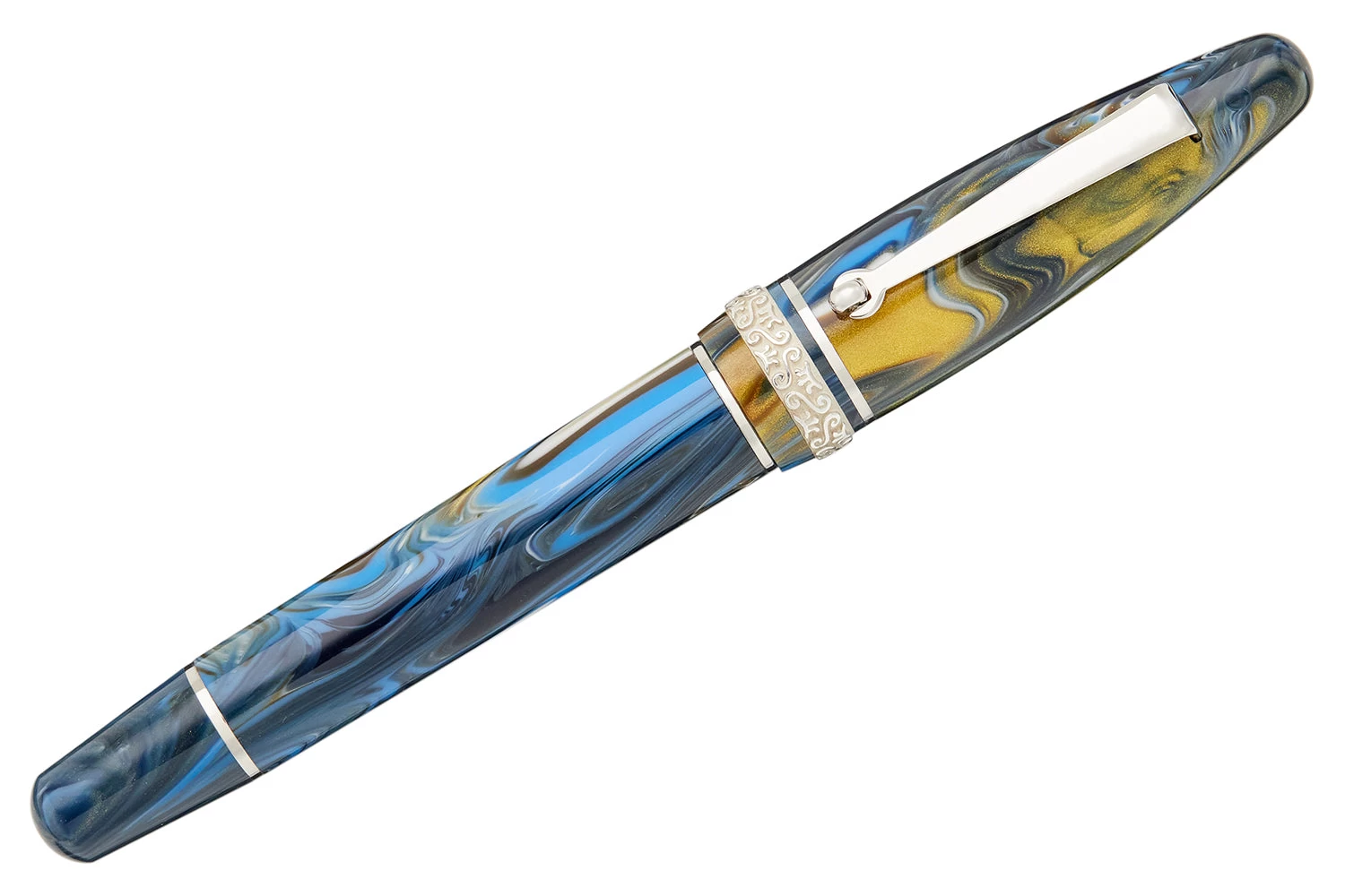 This blue Maiora Ogiva Golden Age fountain pen comes equipped with a JoWo #6 steel nib in a wide array of sizes, and features a cartridge/converter filling system. The cap features elegant 925 sterling silver bands.