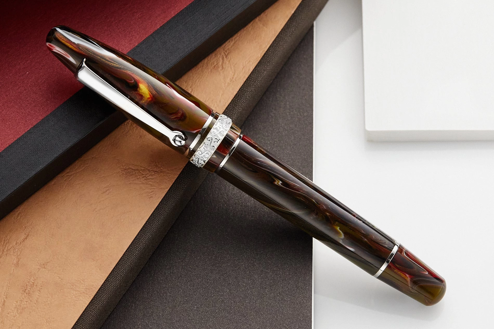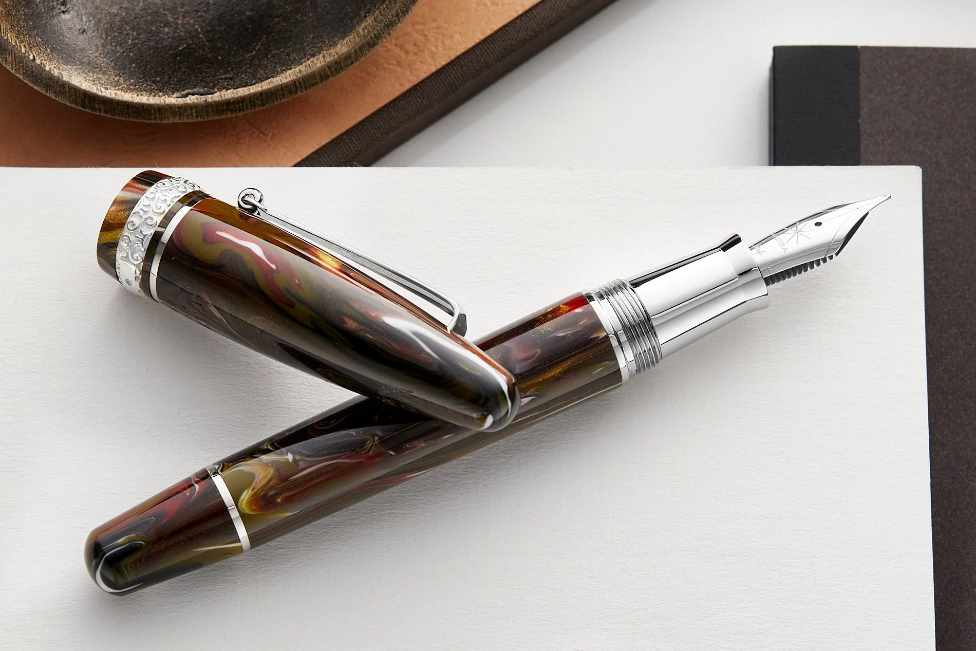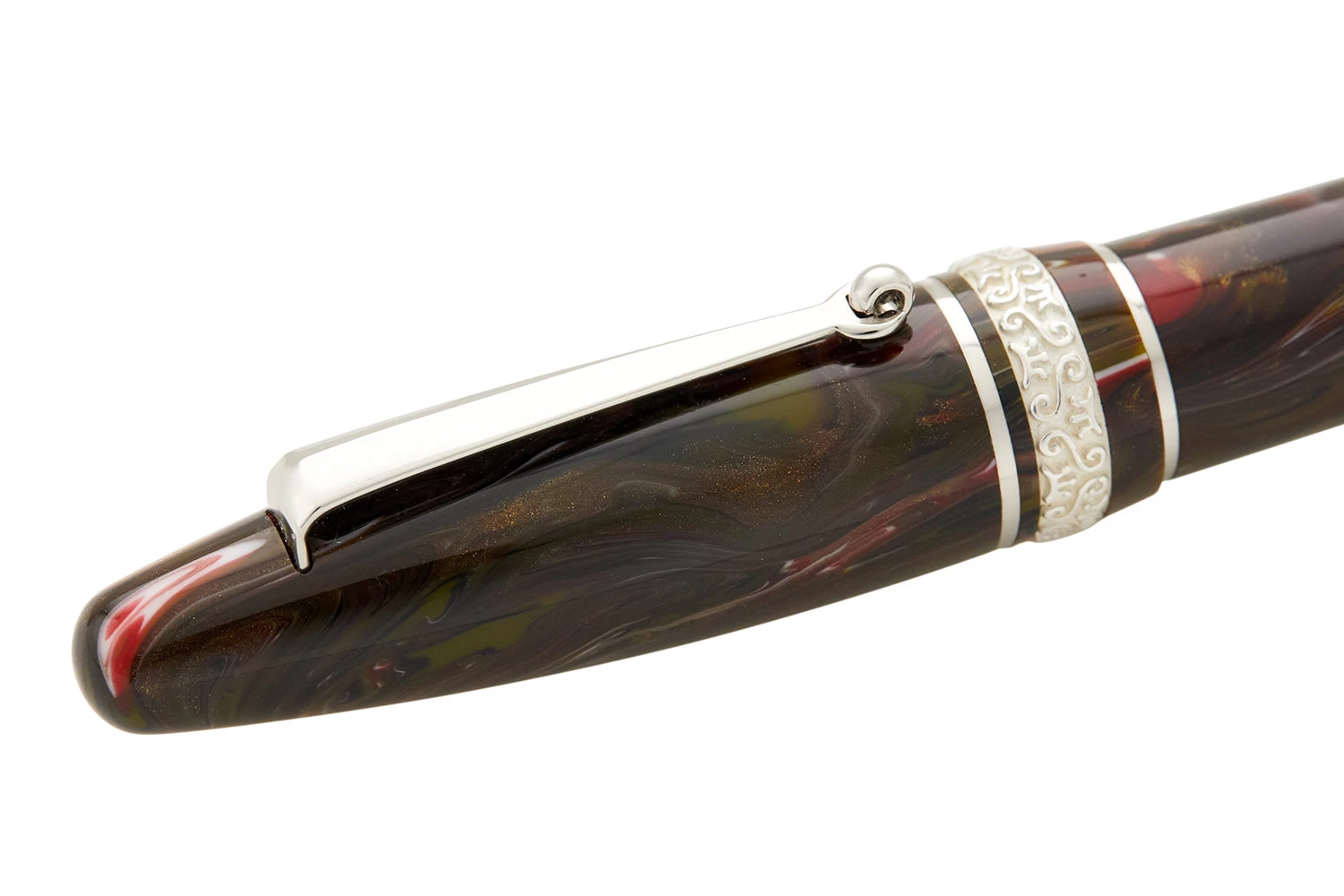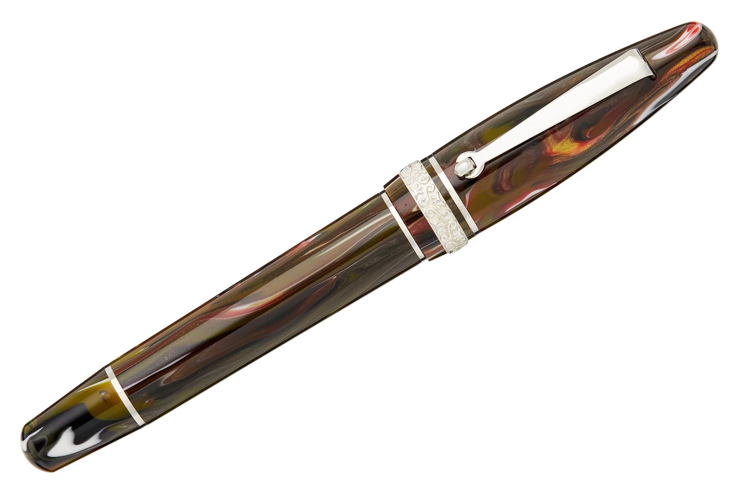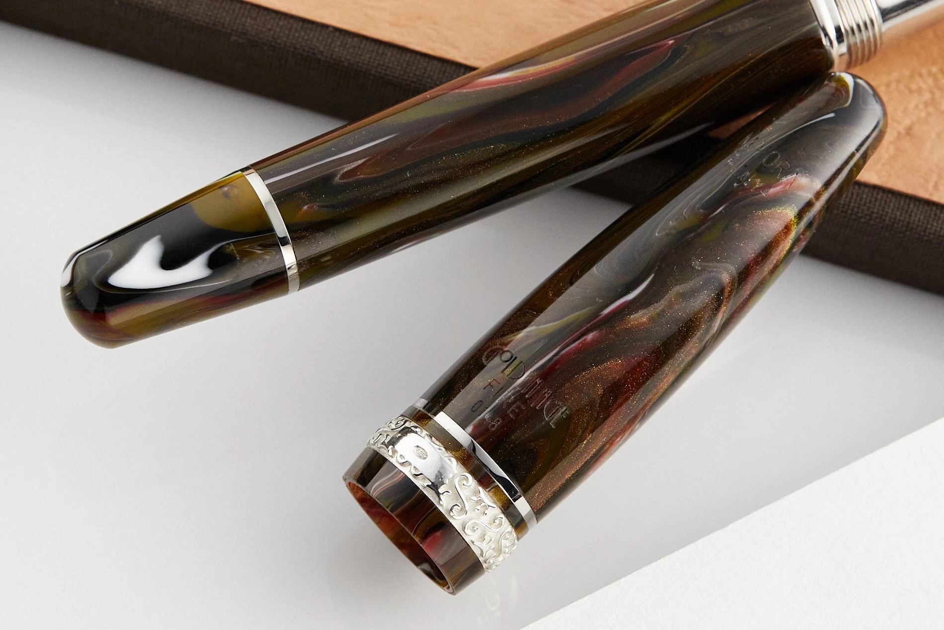 This brown Maiora Ogiva Golden Age fountain pen comes equipped with a JoWo #6 steel nib in a wide array of sizes, and features a cartridge/converter filling system. The cap features elegant 925 sterling silver bands.