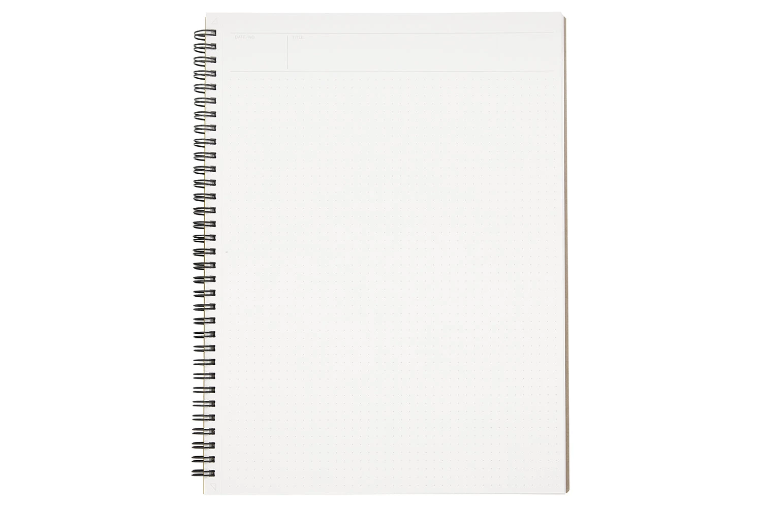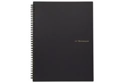 Made in Japan, this A4-sized notebook features 70 sheets of white acid-free 80gsm dot grid paper. The black double wire side spiral binding matches the black plastic cover. The notebook features dots 5mm apart, and every page is micro-perforated. Each sheet contains a blank margin at the top with a space for the date and title.