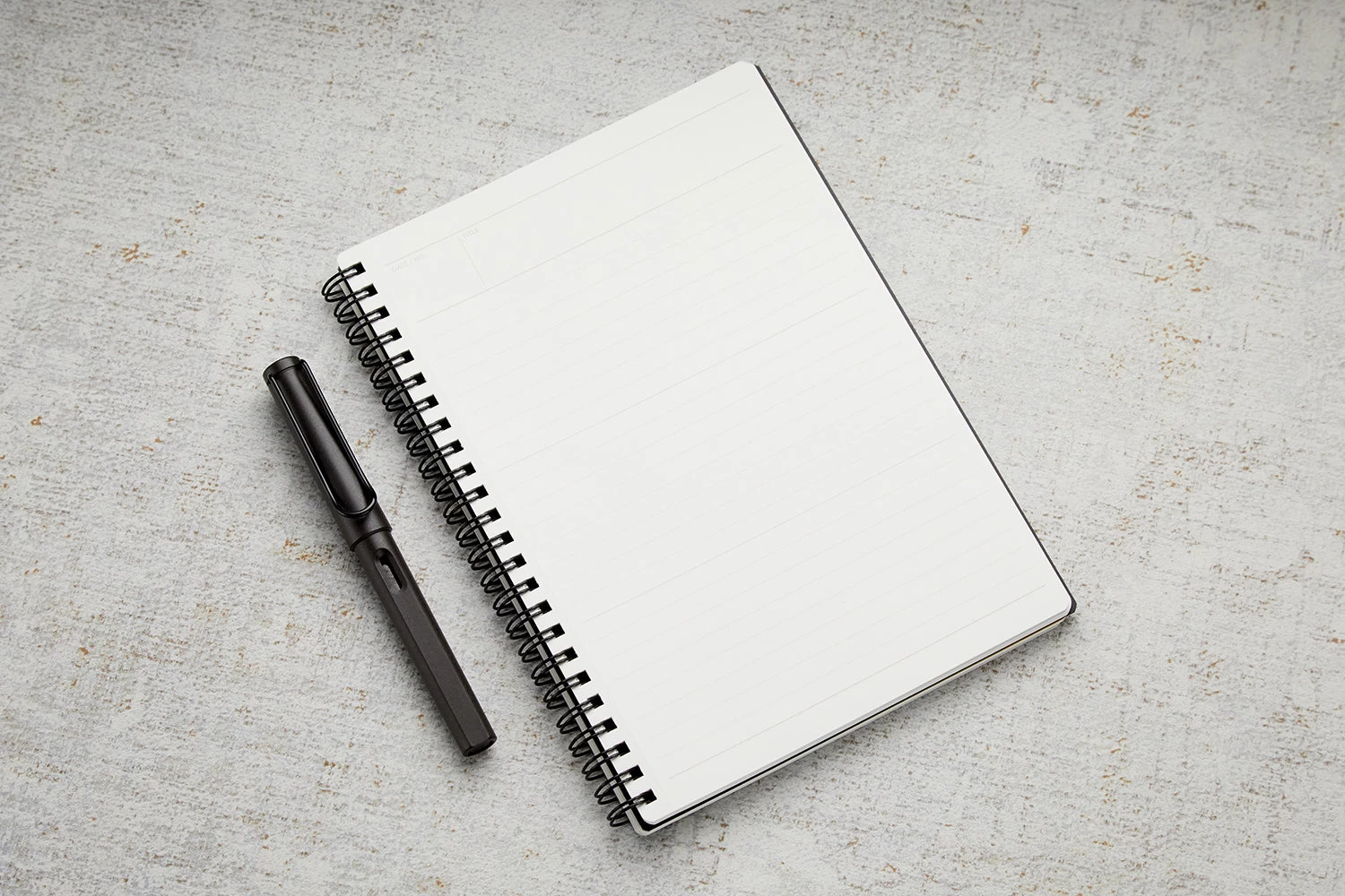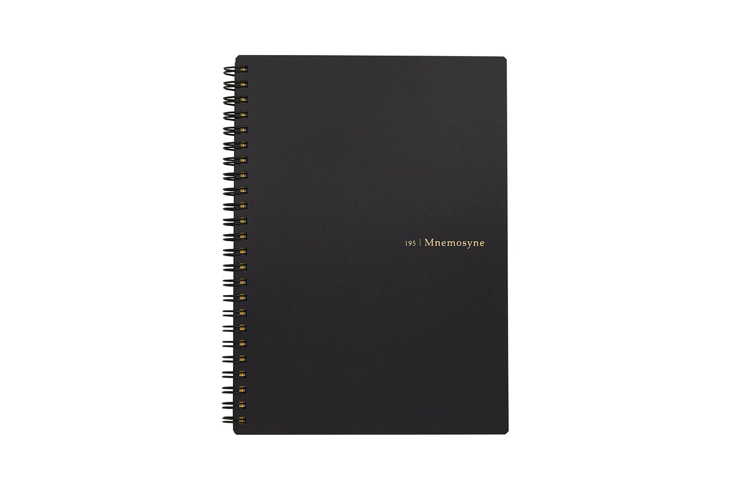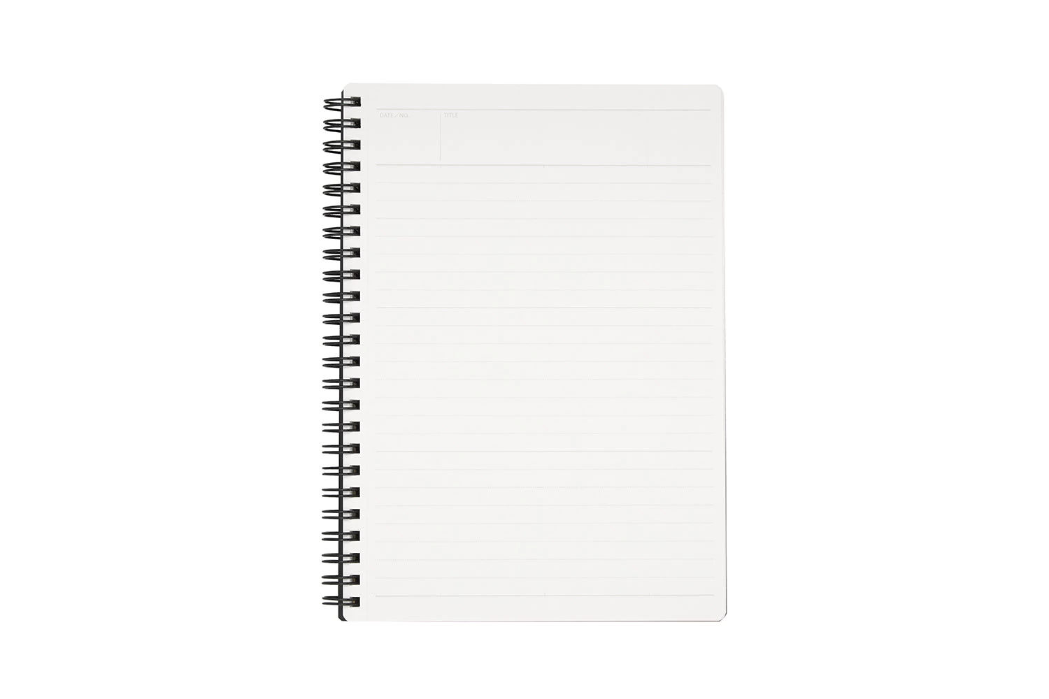 Made in Japan, this A5-sized notebook features 80 sheets of white acid-free 80gsm lined paper. The black double wire side spiral binding matches the black plastic cover. The notebook features 7mm line spacing with 24 rows per sheet (with a bold line every 8 rows), and every page is micro-perforated. Each sheet contains a blank margin at the top with a space for the date and title.