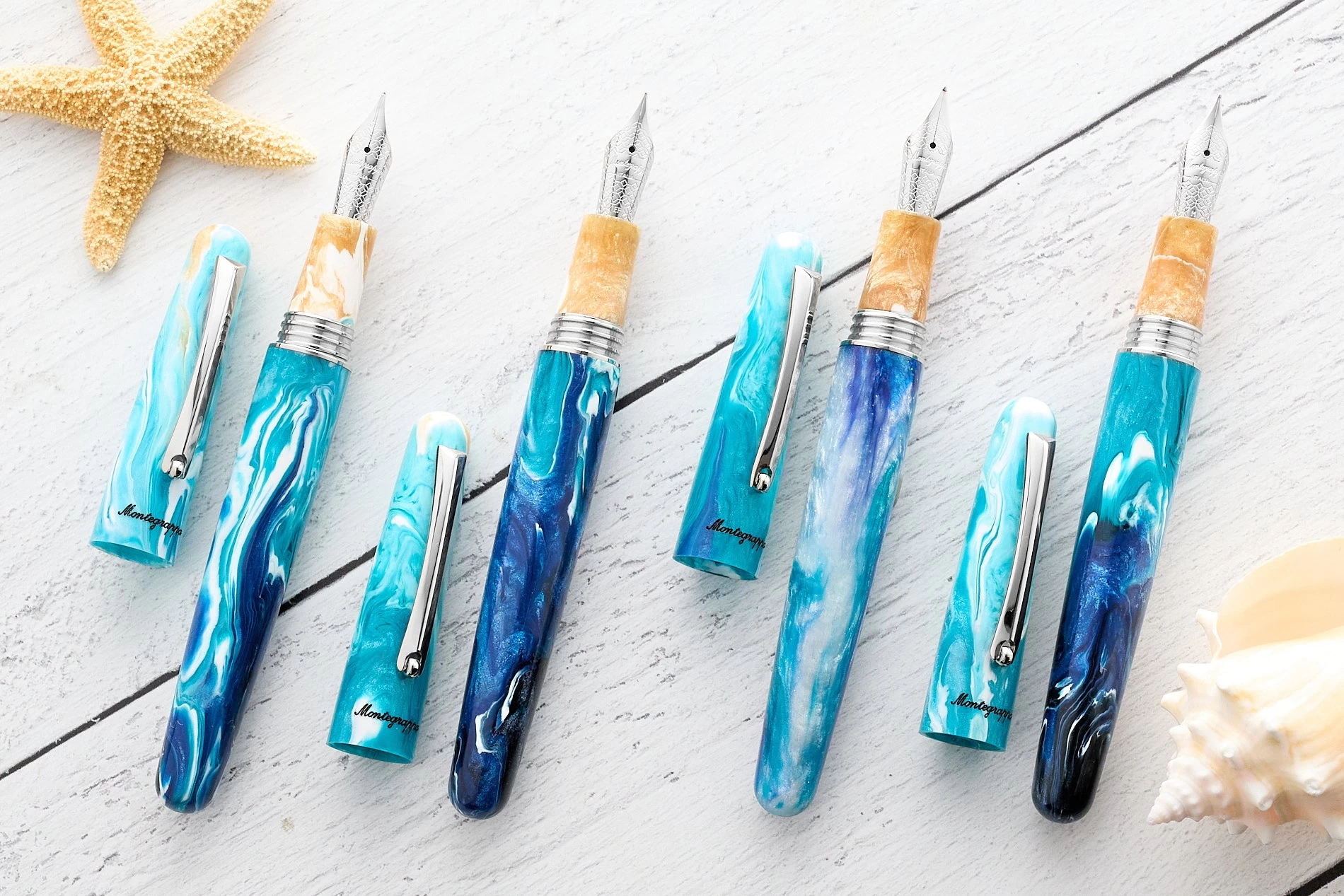 This resin from Turnt Pen Co that we are calling “Beach” features a turquoise blue base with swirls of a variety of blue and white colors. A tan accent on the grip and the top cap finial resembles a sandy shore. Accented by silver trim, it comes with a silver #6 JoWo steel nib and it fills via standard international cartridge/converter (included).