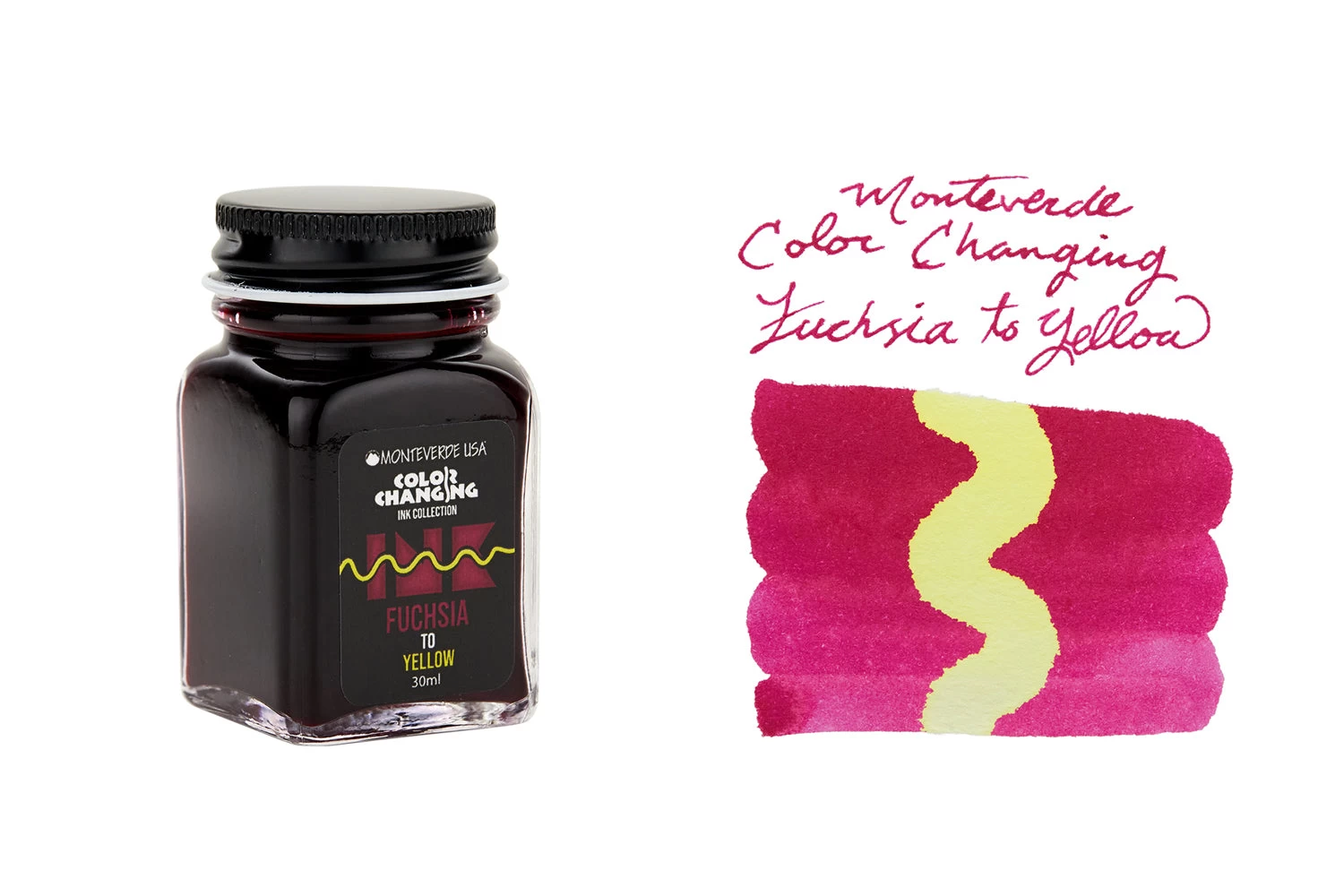30ml glass bottle of Monteverde Color Changing Fuchsia to Yellow fountain pen ink.