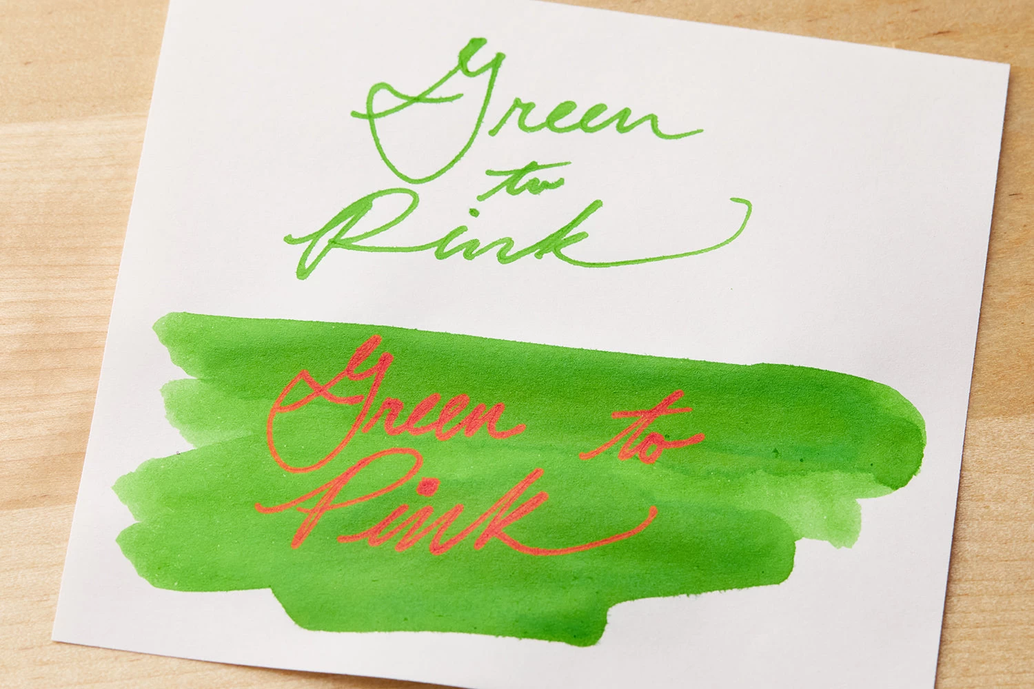 Note – this ink is a solid green color. In order to get the color-changing effect to pink, you will need to apply the Ink Color Changer (sold separately). Some of the color-changing inks may fade over time.