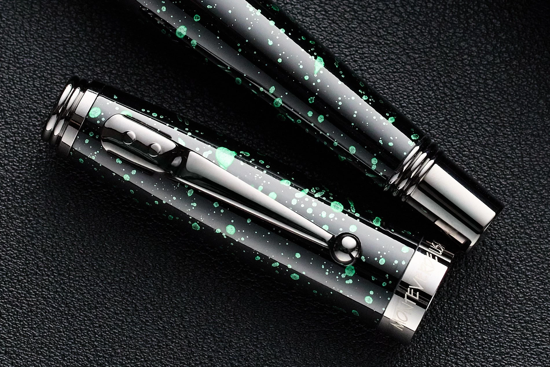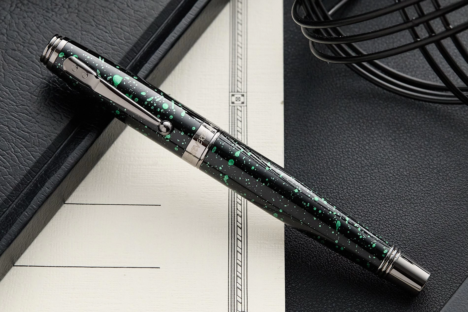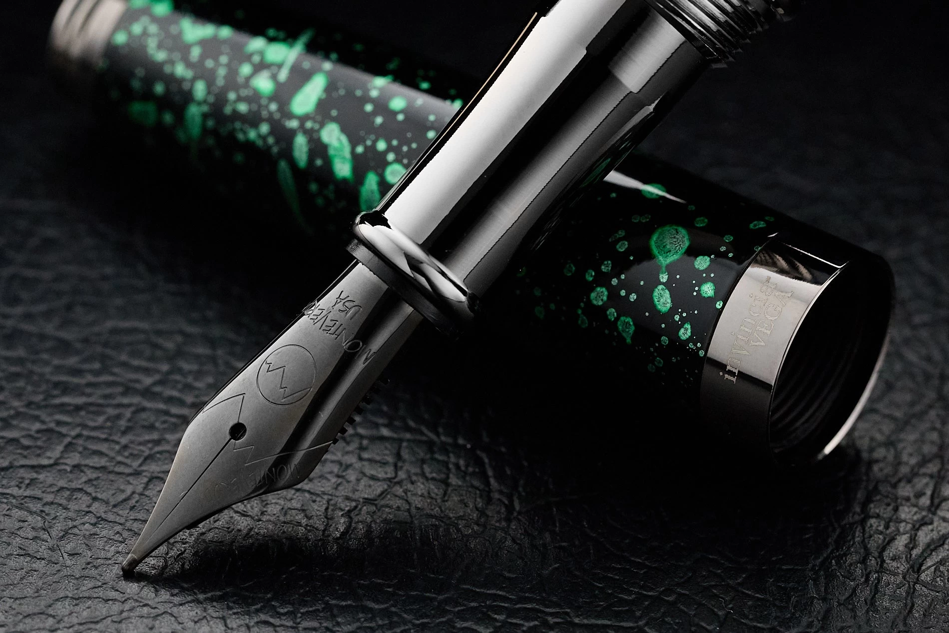The Vega Collection brings a splash of color to Montverde’s flagship Invincia collection. The solid brass barrels and heavy lacquer coating with green splatter are accented with gun metal trim, making each pen fun and functional.Â